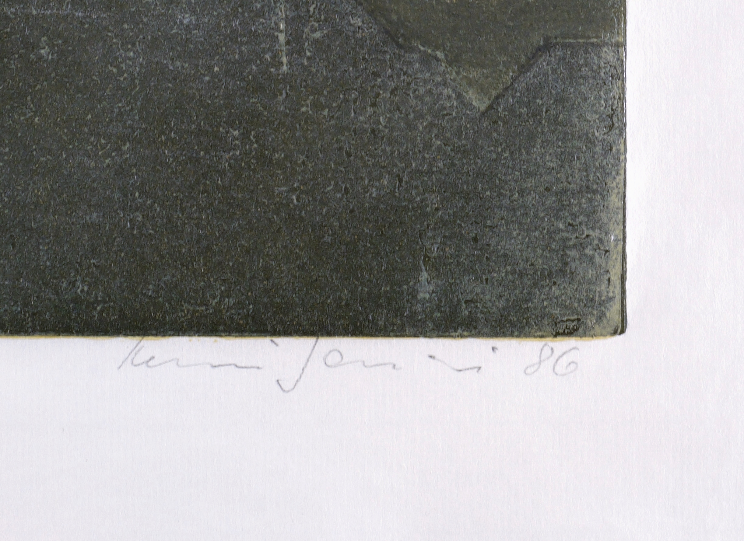 1986. Farblinolschnitt, in 4 Farben, auf hellchamois Achat-Maschinenbütten. – Originale Künstlergrafik, von Helmut Gebhardt. – Auflage Exemplar Nr. 12/20. – 52,3 x 42,0 cm (Darstellung / Druckbild).