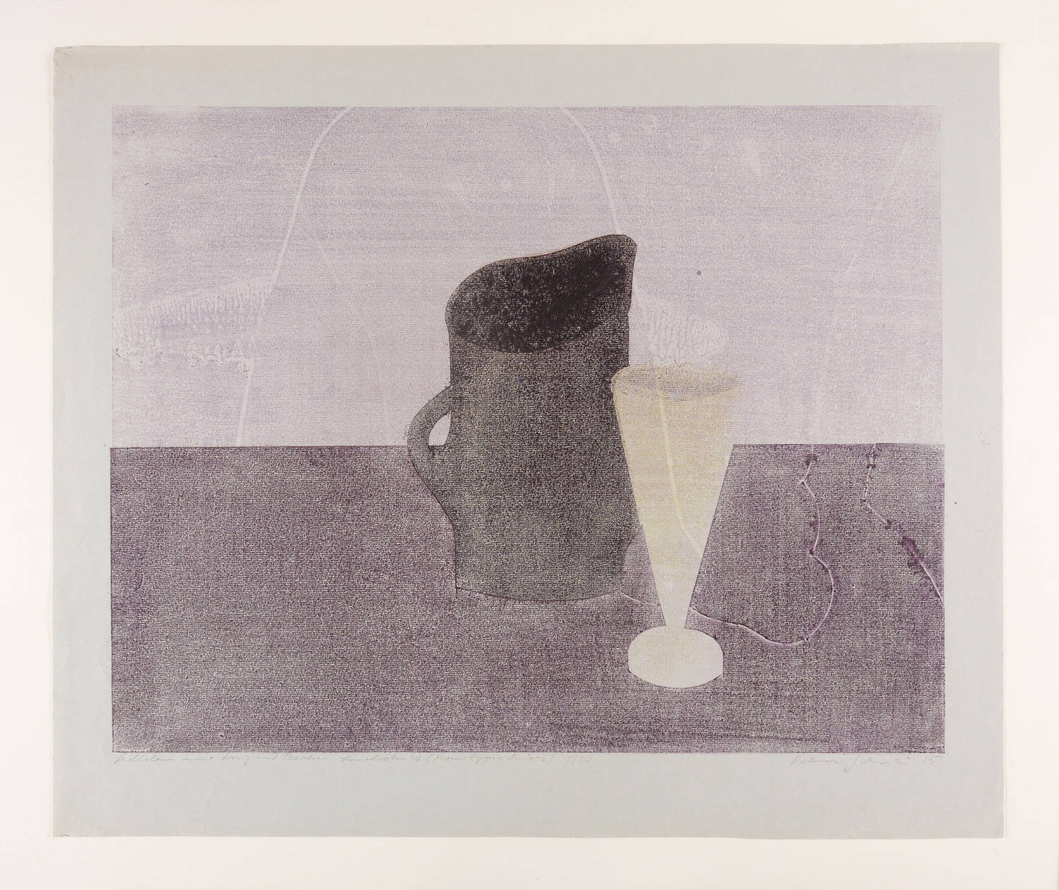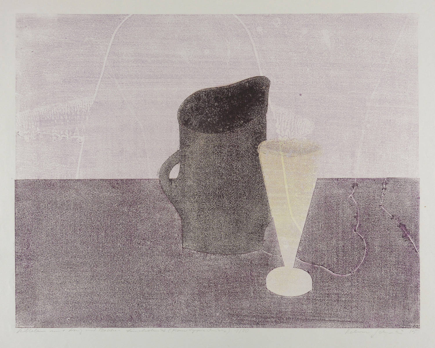 Rechts unten in Bleistift signiert und datiert: ″Helmut Gebhardt 85″. Links Titel, Technik und Auflagenbezeichnung: ″Stilleben mit Krug und Becher) Linolschnitt (Monotypiedruck) 1/20″. – Sehr guter Zustand.