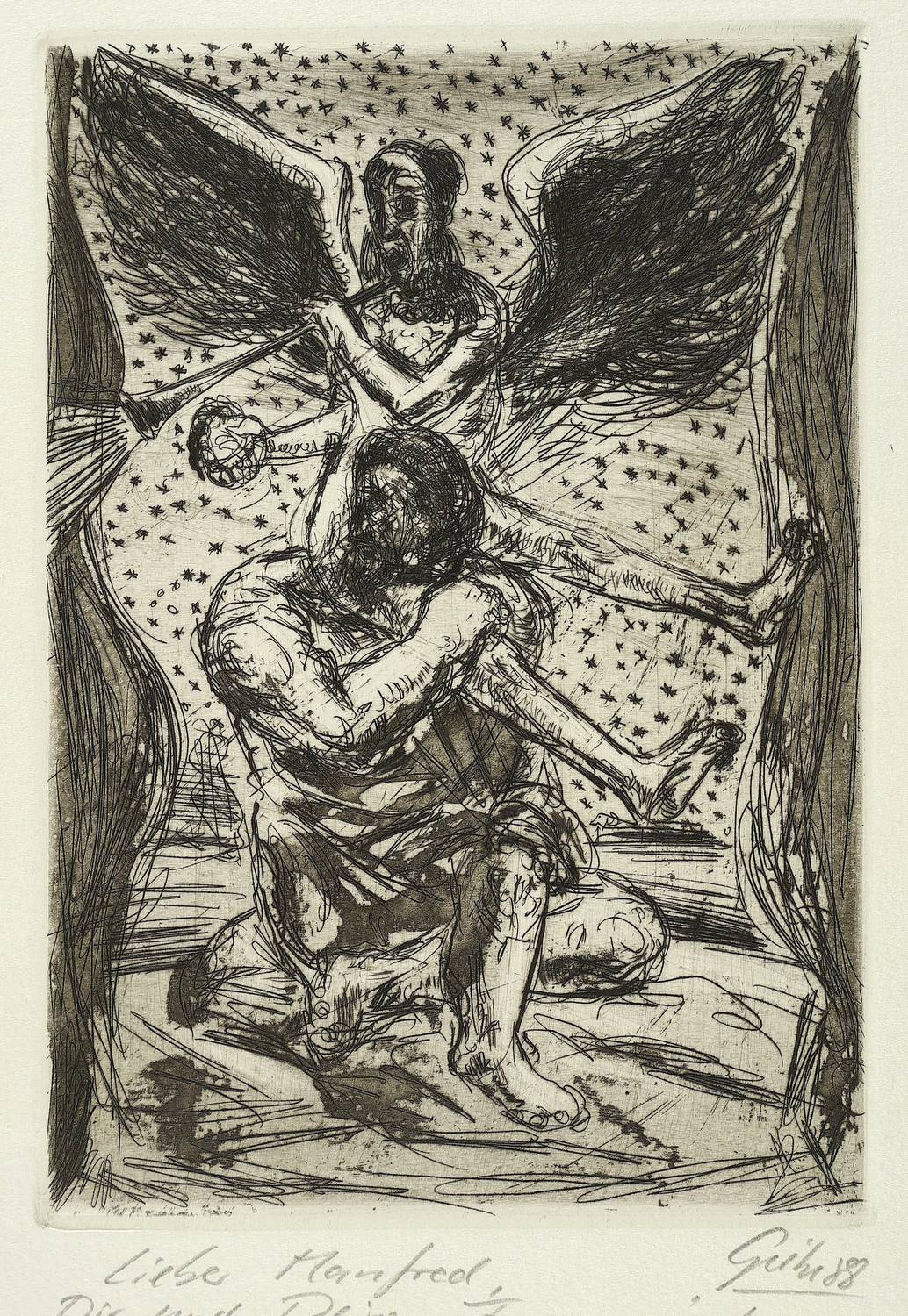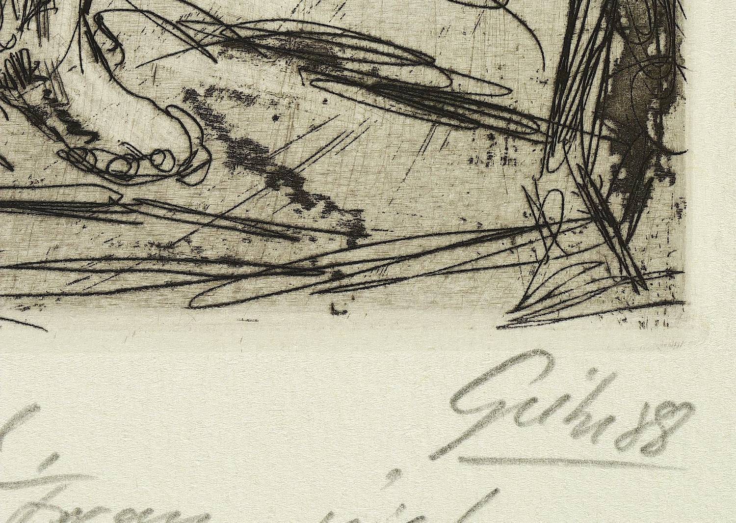 1988. Radierung / Strichätzung, mit Plattenton, in Schwarz, auf hellchamois Velin. – Originale Künstlergrafik, von Hubertus Giebe. – Künstlerexemplar (e.a.). – 21,0 x 14,5 cm (Darstellung / Platte), 30 x 20 cm (Blatt).