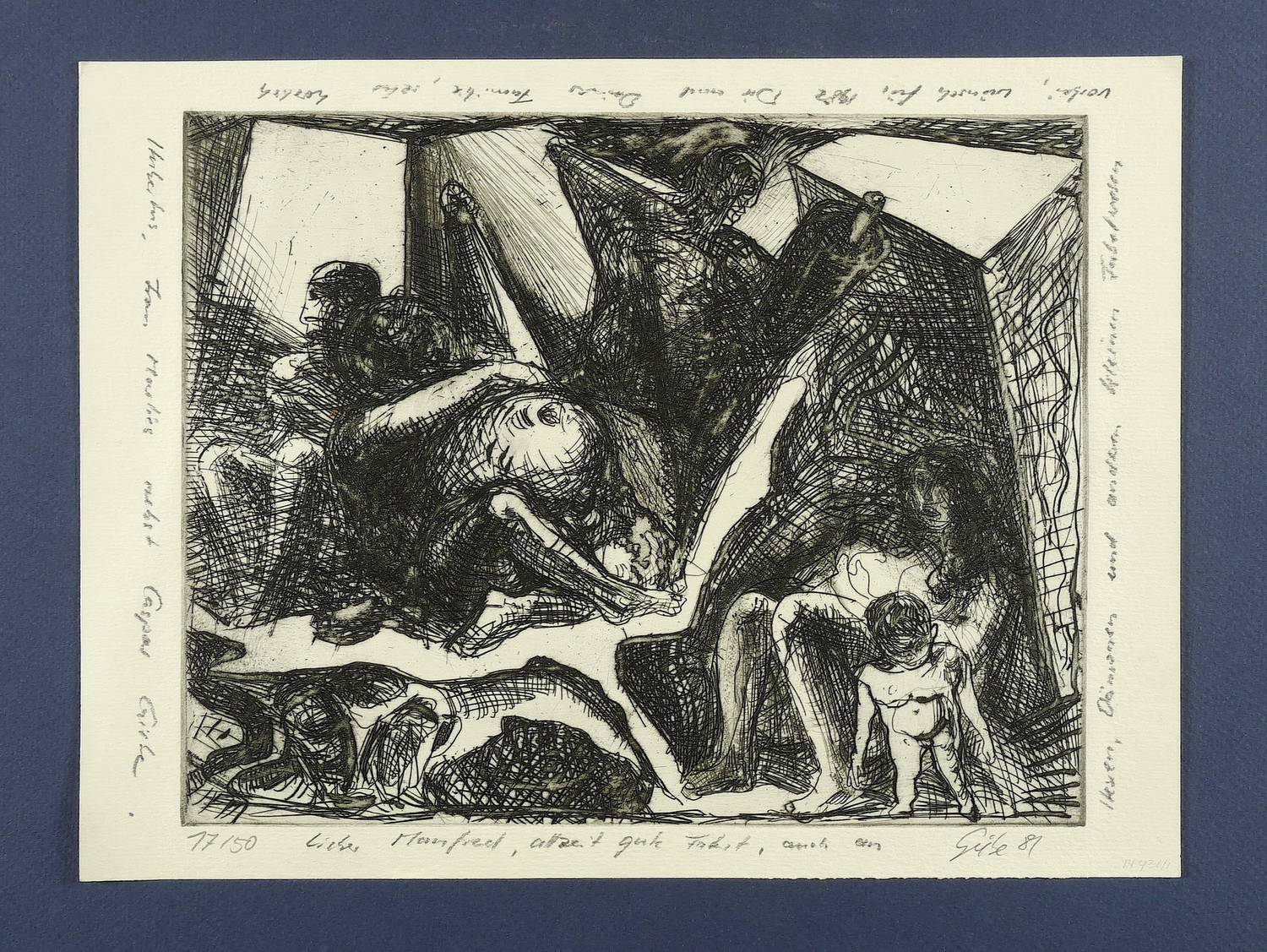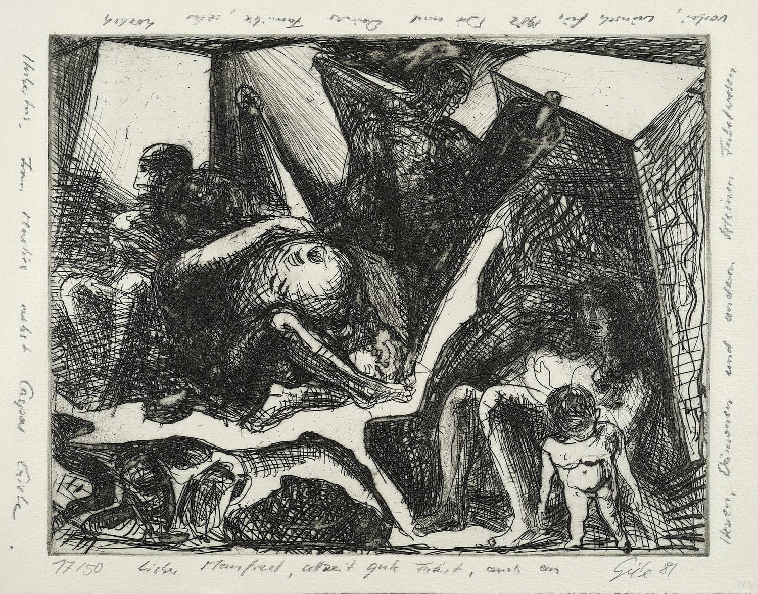 1981. Radierung / Strichätzung, in Schwarz, auf hellchamois Velin. – Originale Künstlergrafik, von Hubertus Giebe. – Auflage Exemplar Nr. 17/50. – 19,2 x 24,5 cm (Darstellung / Platte), 23 x 30 cm (Blatt).