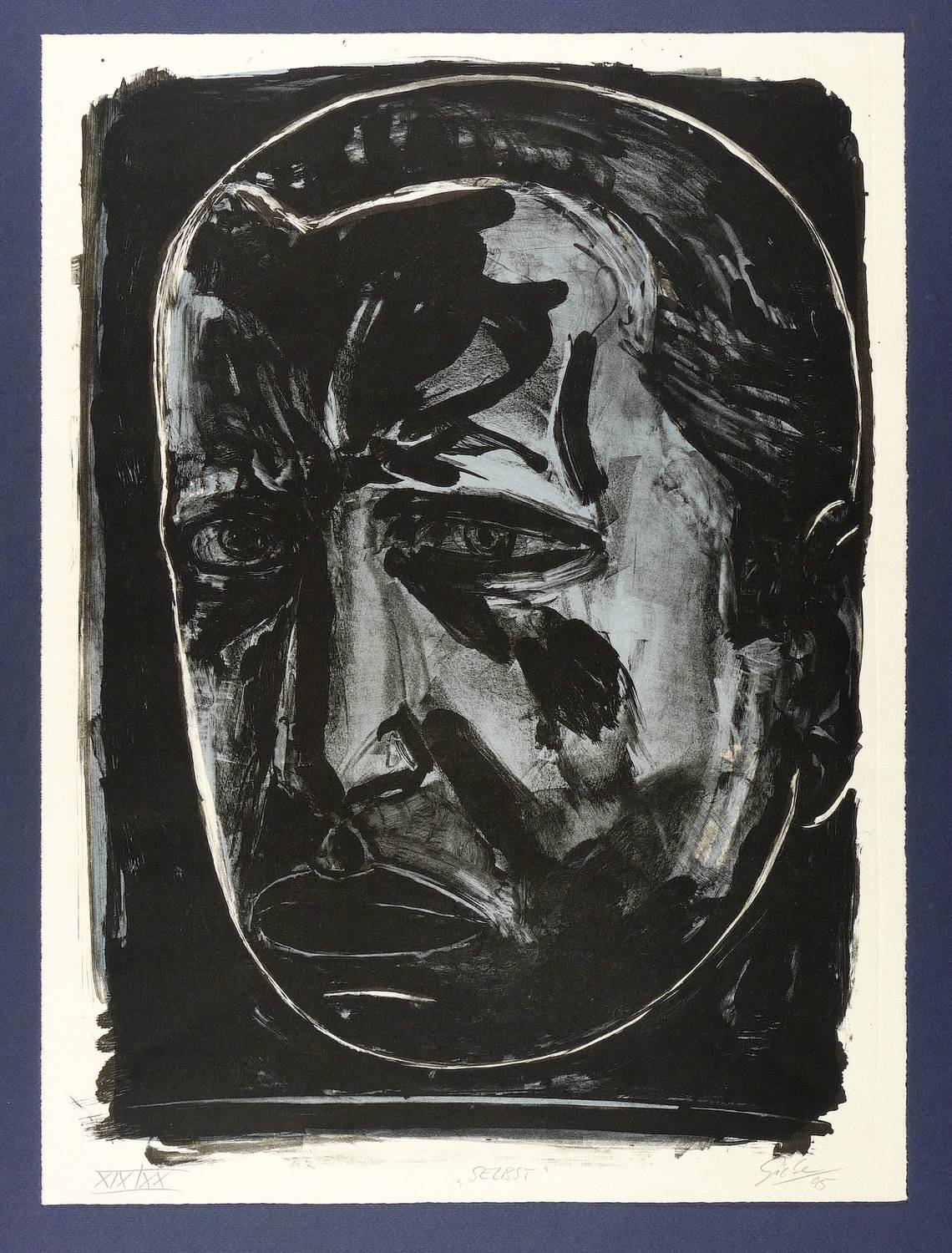 1995. Farblithografie / Kreidelithografie, in Blau und Schwarz, auf Büttenpapier. – Originale Künstlergrafik, von Hubertus Giebe. – Auflage Exemplar Nr. 19/20. – 49,0 x 35,0 cm (Darstellung / Druckbild), 53,0 x 39,0 cm (Blatt).