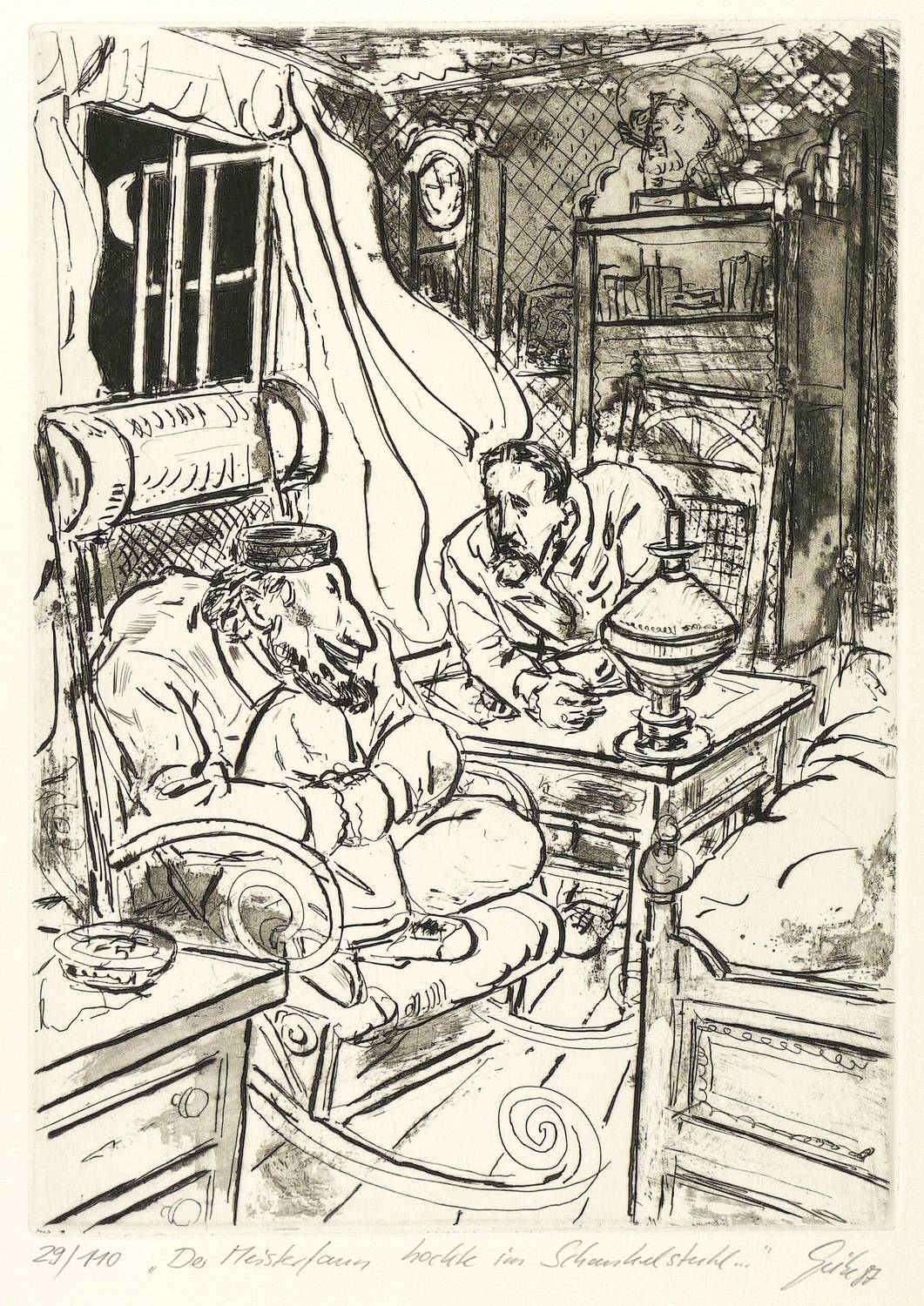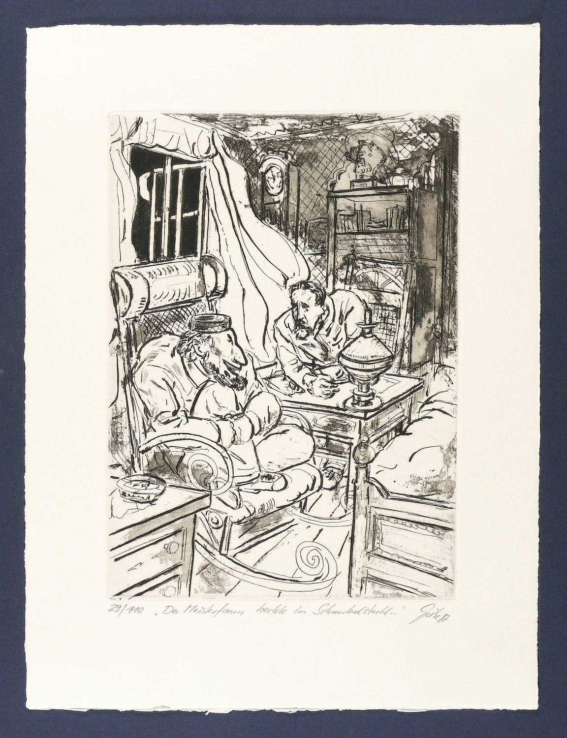 Rechts unten in Bleistift signiert und datiert. Dazu Auflagenbezeichnung und Titel: ″Der Meisterfaun hockte im Schaukelstuhl ...″ – Tadelloser Zustand.