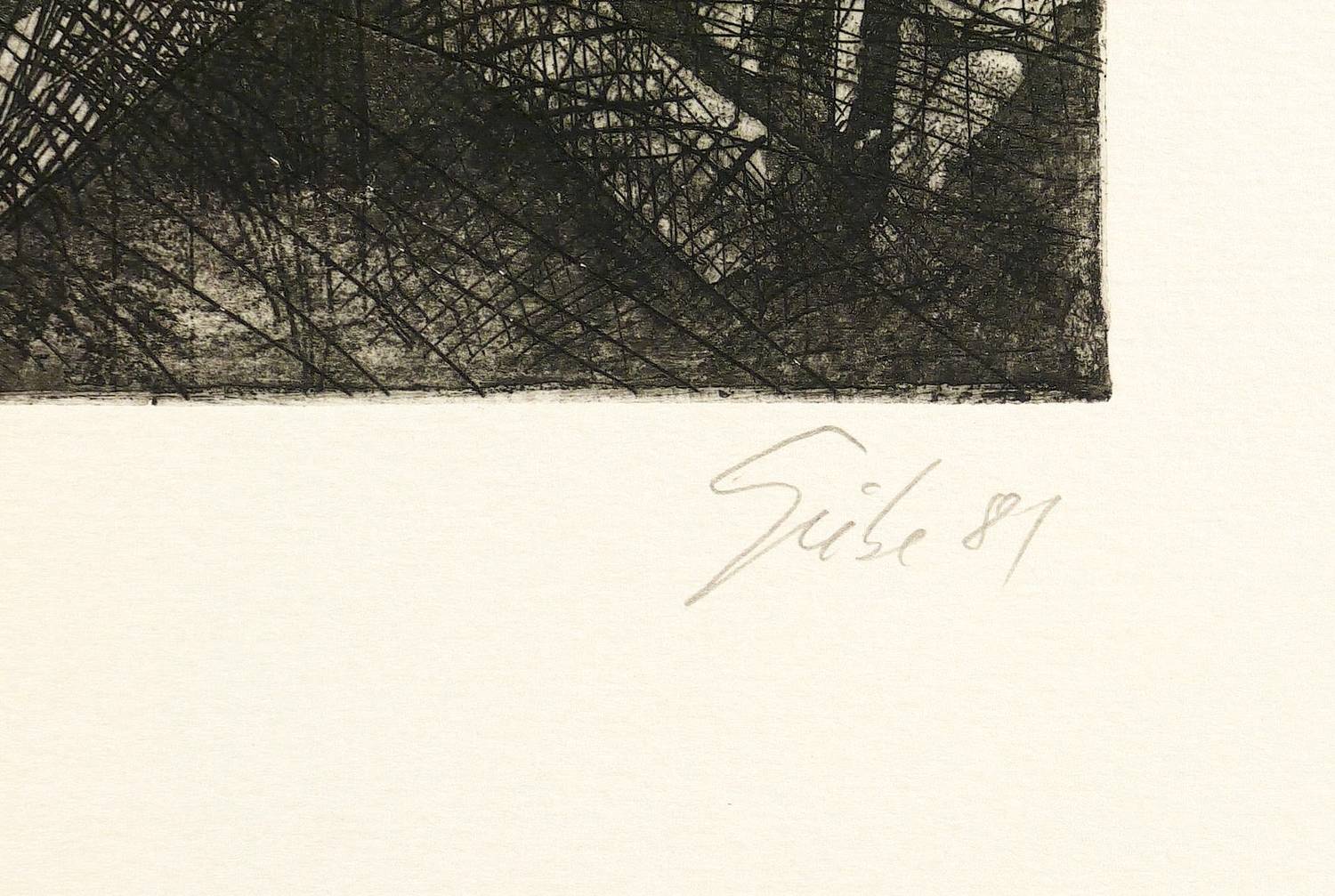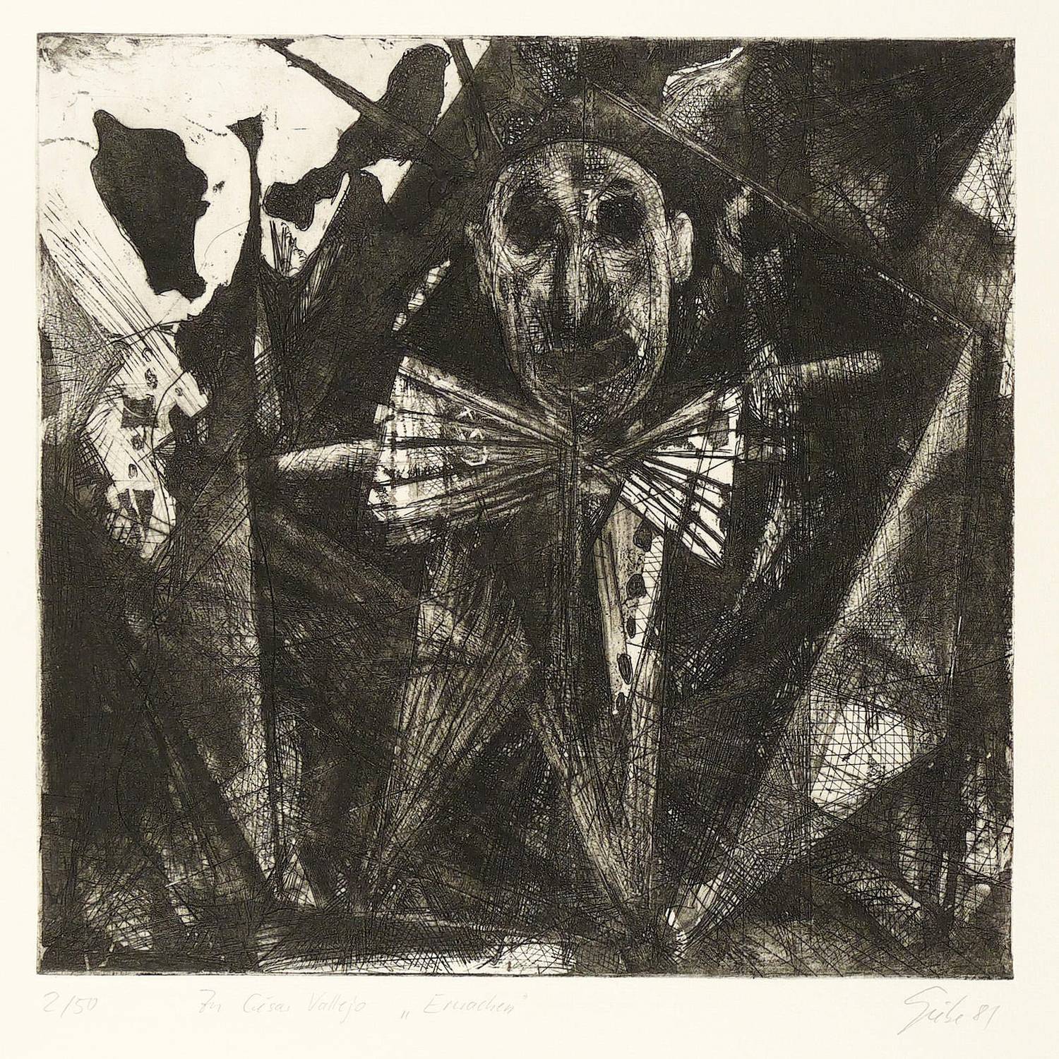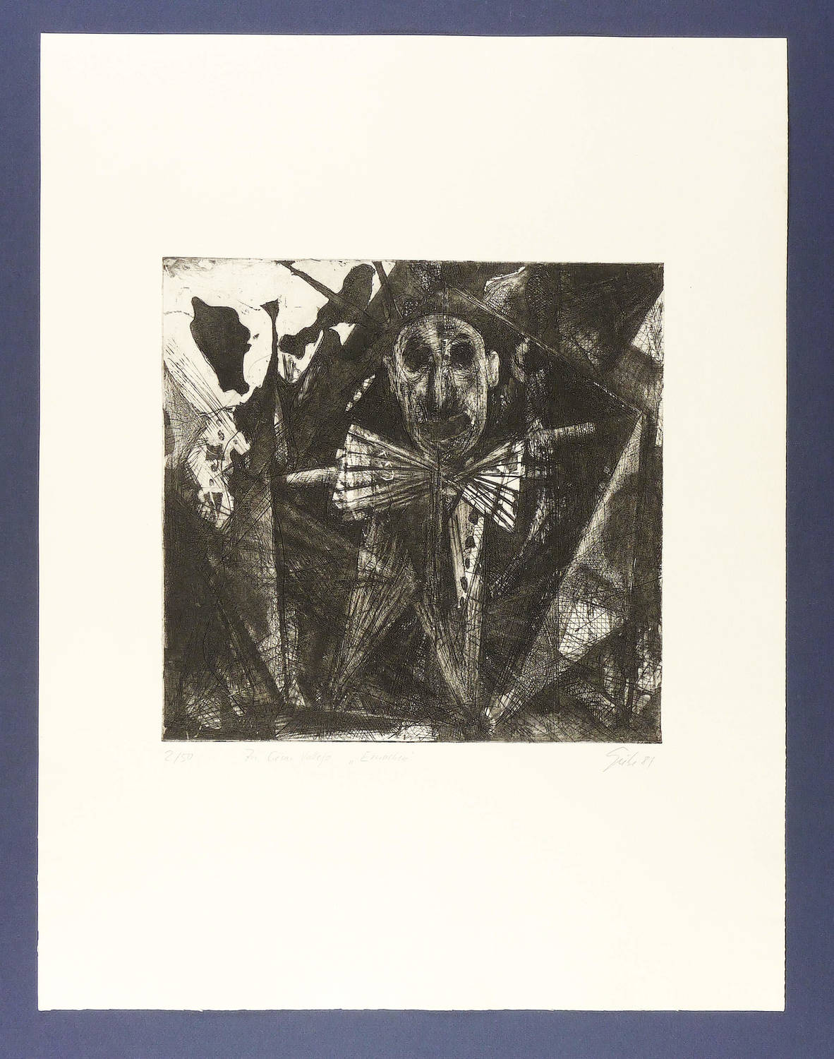 1981. Radierung / Aquatinta & Strichätzung, in Schwarz, auf hellgelbem Papier. – Originale Künstlergrafik, von Hubertus Giebe. – Auflage Exemplar Nr. 2/50. – 32,0 x 33,3 cm (Darstellung / Platte), 65 x 50 cm (Blatt).