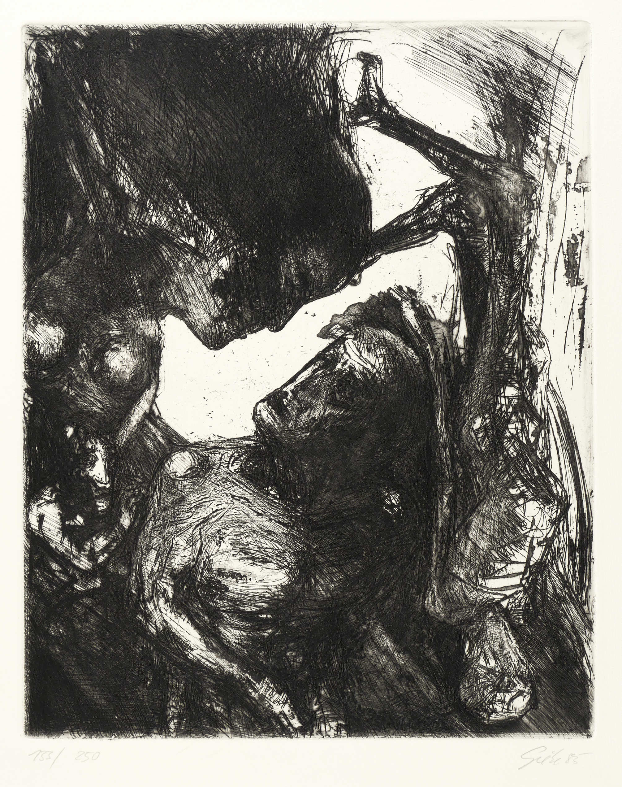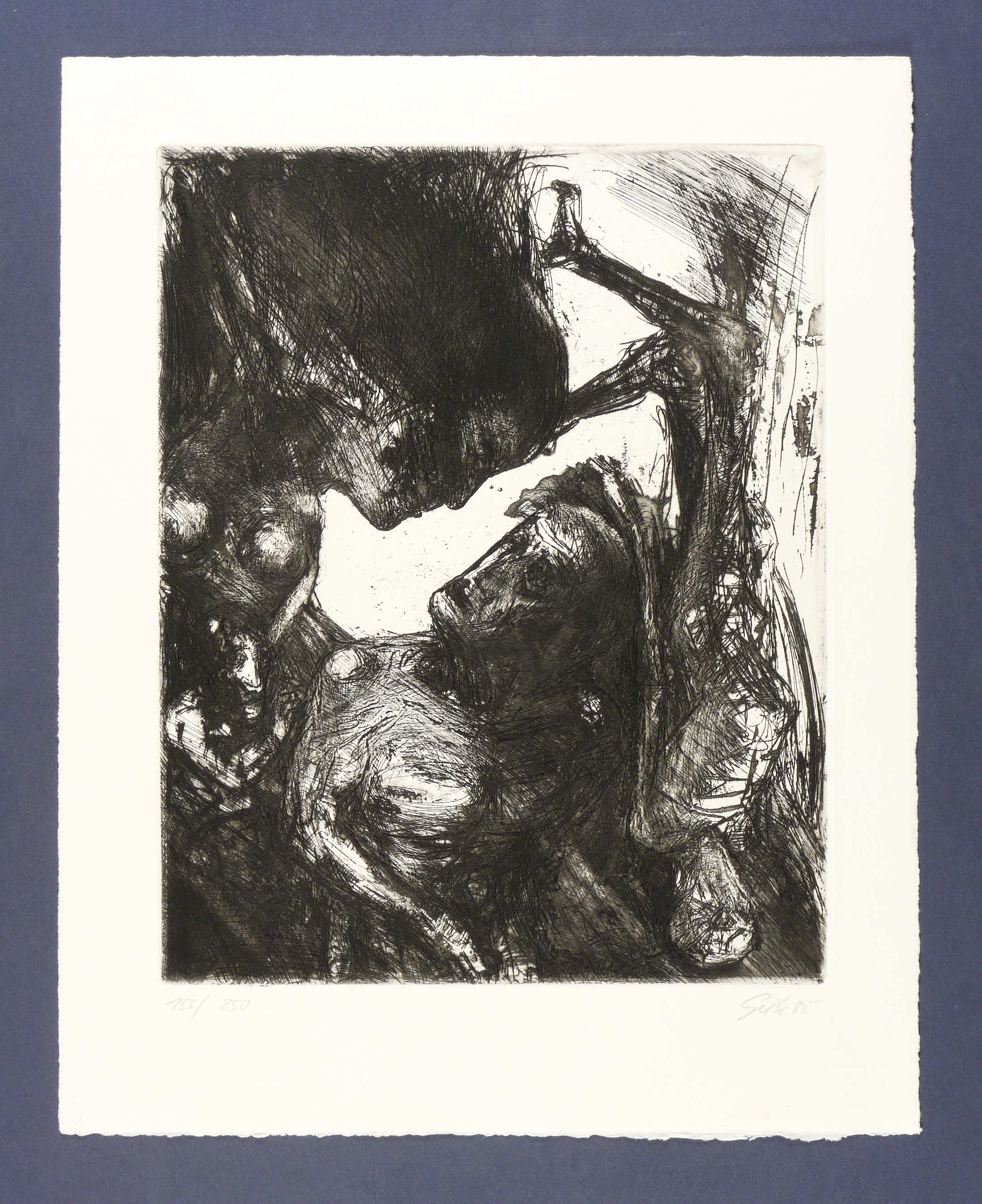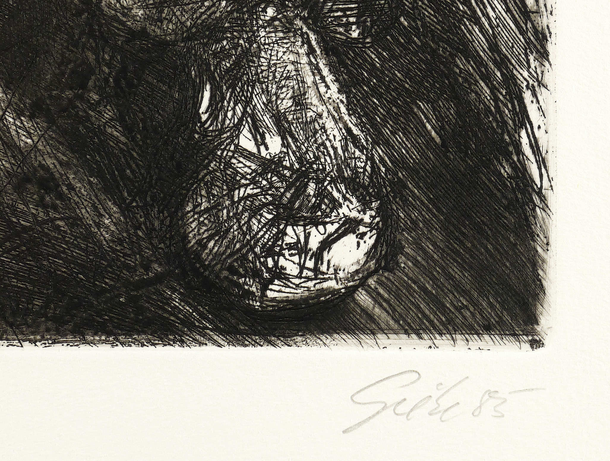 1985. Radierung / Strichätzung, in Schwarz, auf weißem Hahnemühle-Büttenkarton. – Originale Künstlergrafik, von Hubertus Giebe. – Auflage Exemplar Nr. 133/250. – 37,3 x 29,9 cm (Darstellung / Platte), 48 x 38 cm (Blatt).