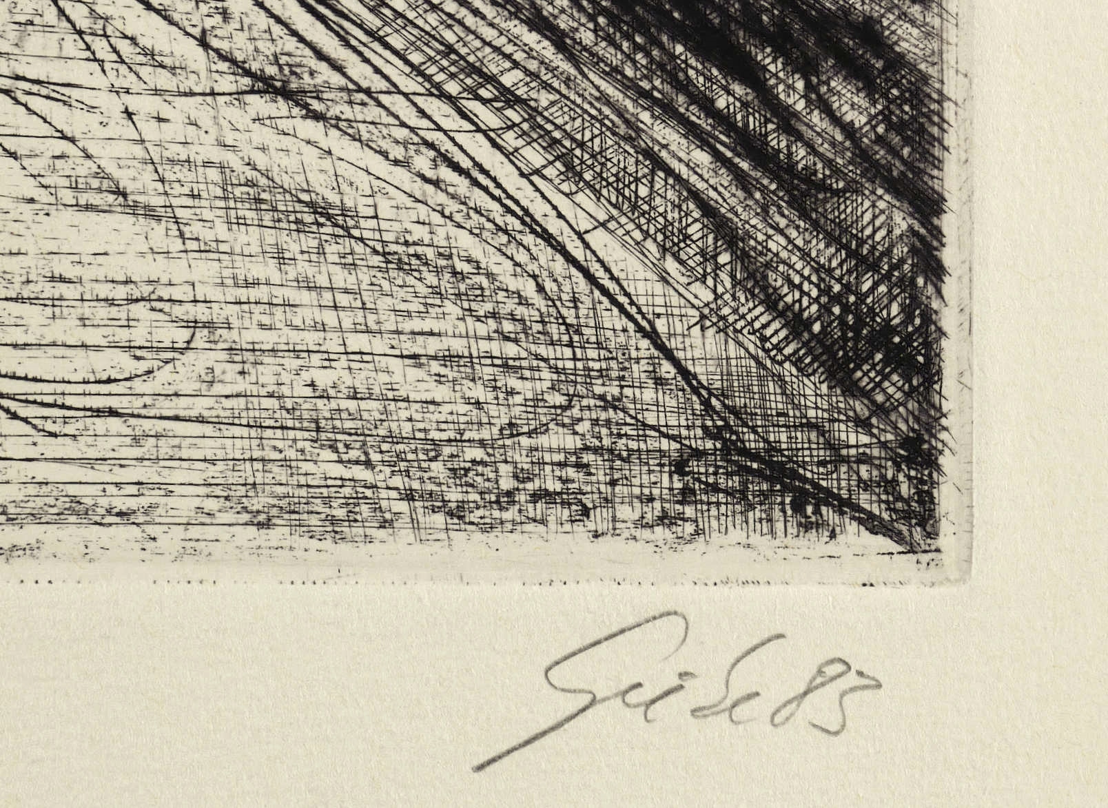 1983. Radierung / Kaltnadel & Strichätzung, teils geschabt, in Schwarz, auf gelbem Hahnemühle-Bütten. – Originale Künstlergrafik, von Hubertus Giebe. – Vorzugsdruck. – 49,6 x 63,9 cm (Darstellung / Platte), 62 x 85 cm (Blatt).