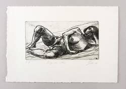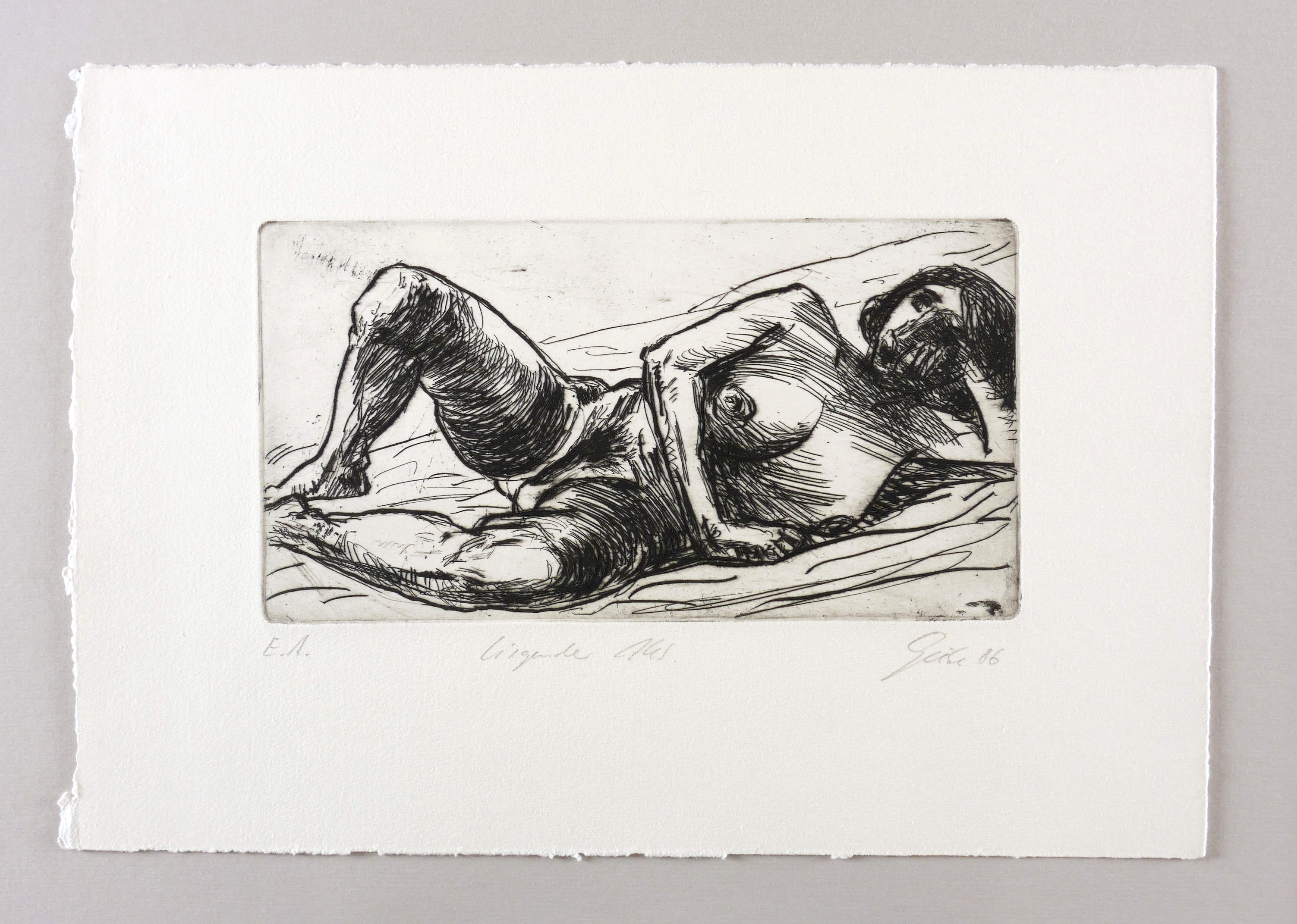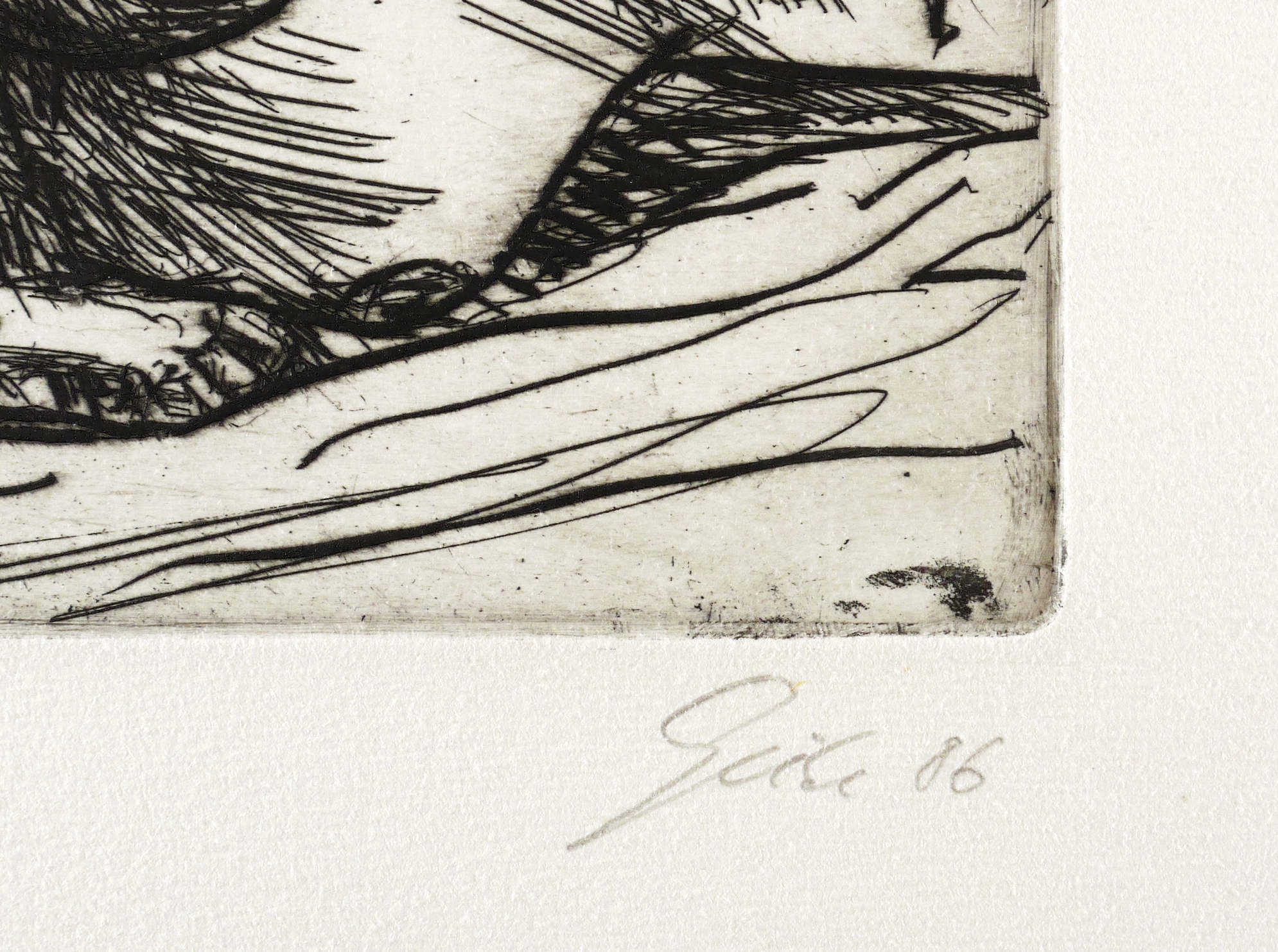 1986. Radierung / Strichätzung, in Schwarz, auf hellchamois Hahnemühle-Bütten. – Originale Künstlergrafik, von Hubertus Giebe. – Künstlerexemplar (e.a.). – 14,8 x 27,7 cm (Darstellung / Platte), 29 x 42 cm (Blatt).