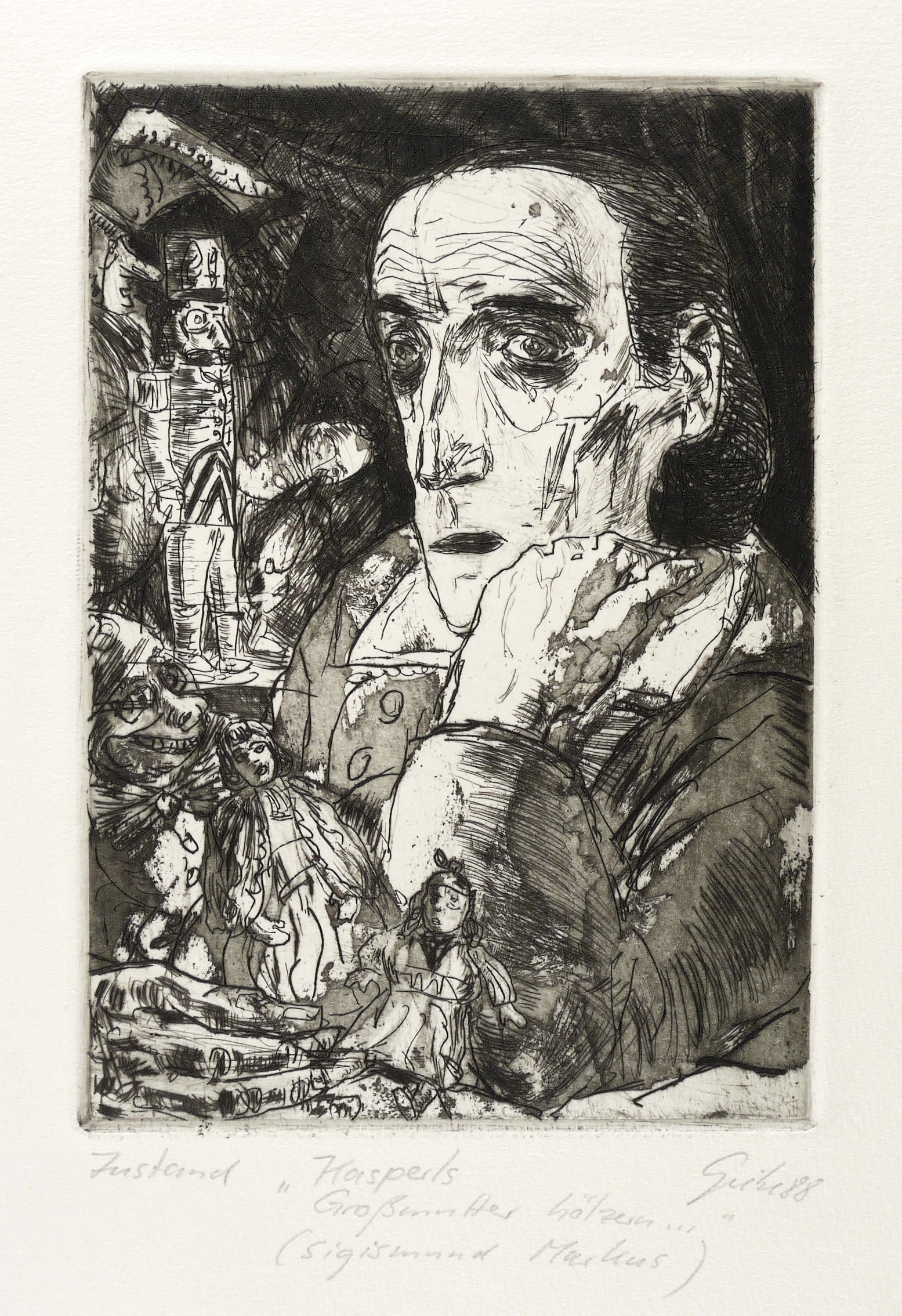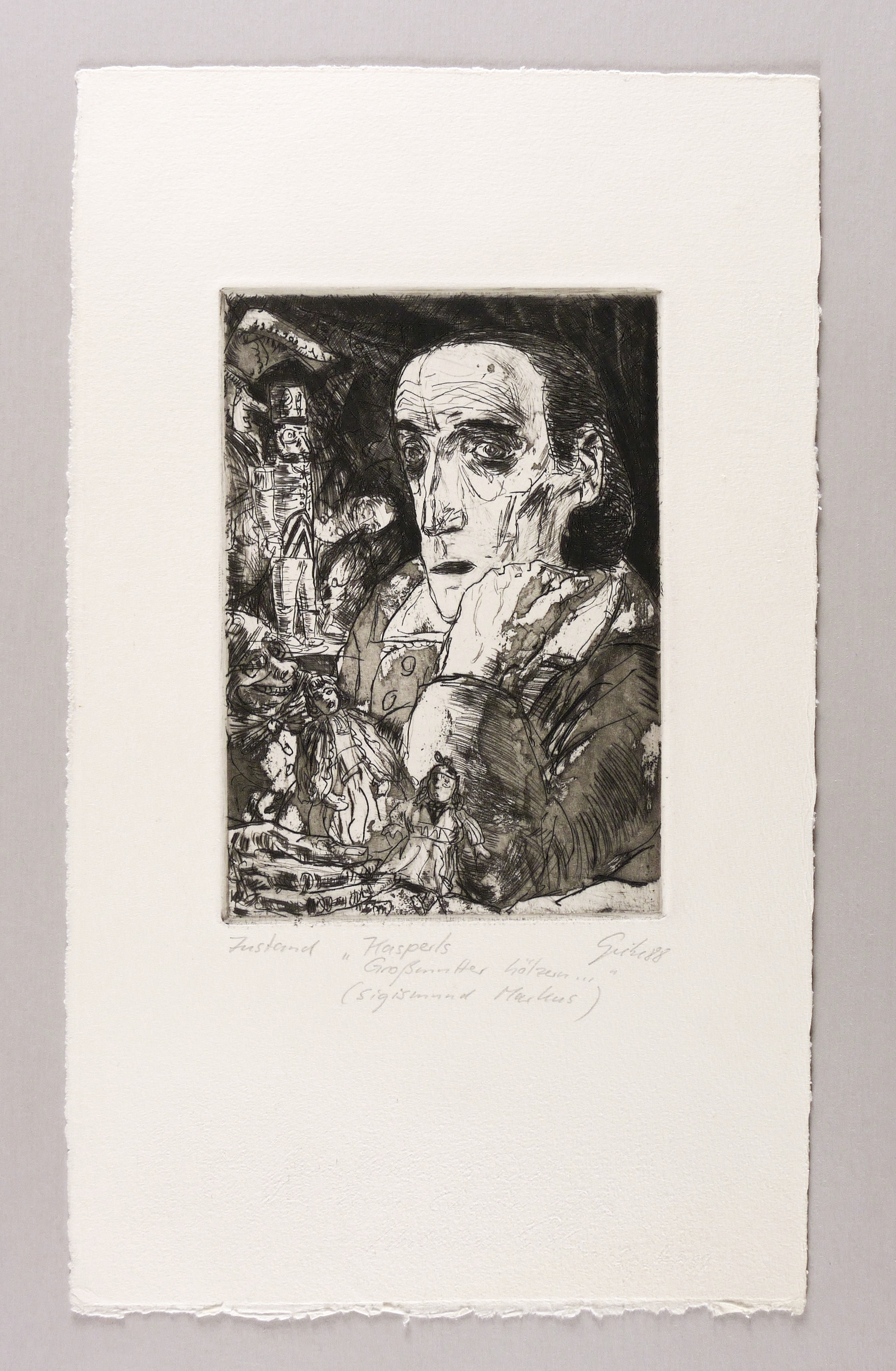 Rechts unten in Bleistift signiert und datiert: ″Giebe 88″. Links bezeichnet: ″Zustand″. Mittig Titel: ″Kasperls Großmutter hölzern ... (Sigismund Markus)″. – Tadellos. Sehr guter Zustand.