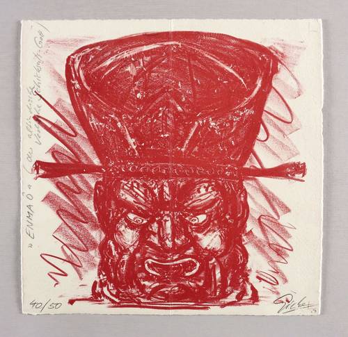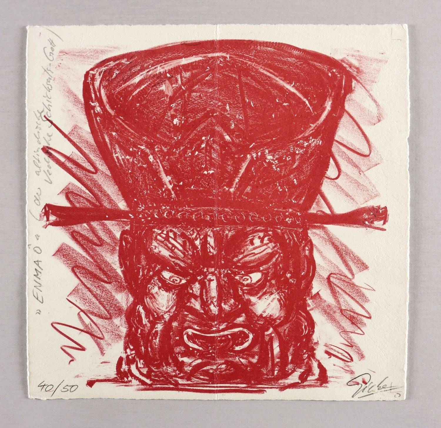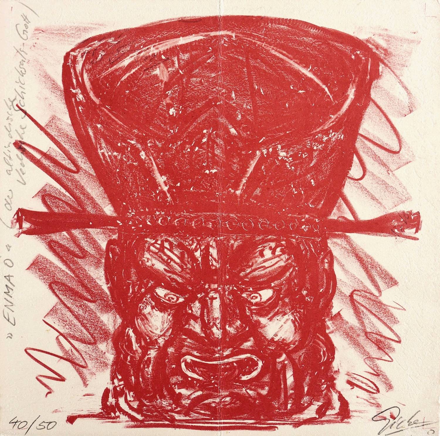 Unten rechts in Bleistift signiert und datiert. Links Auflagenbezeichnung, oben links bezeichnet: ″'ENMA Ô' (der altindische vedische Schicksals- Gott)″. – Mittig original vertikal gefaltet gewesen. Falte etwas ausgelegen. Sonst guter Zustand.