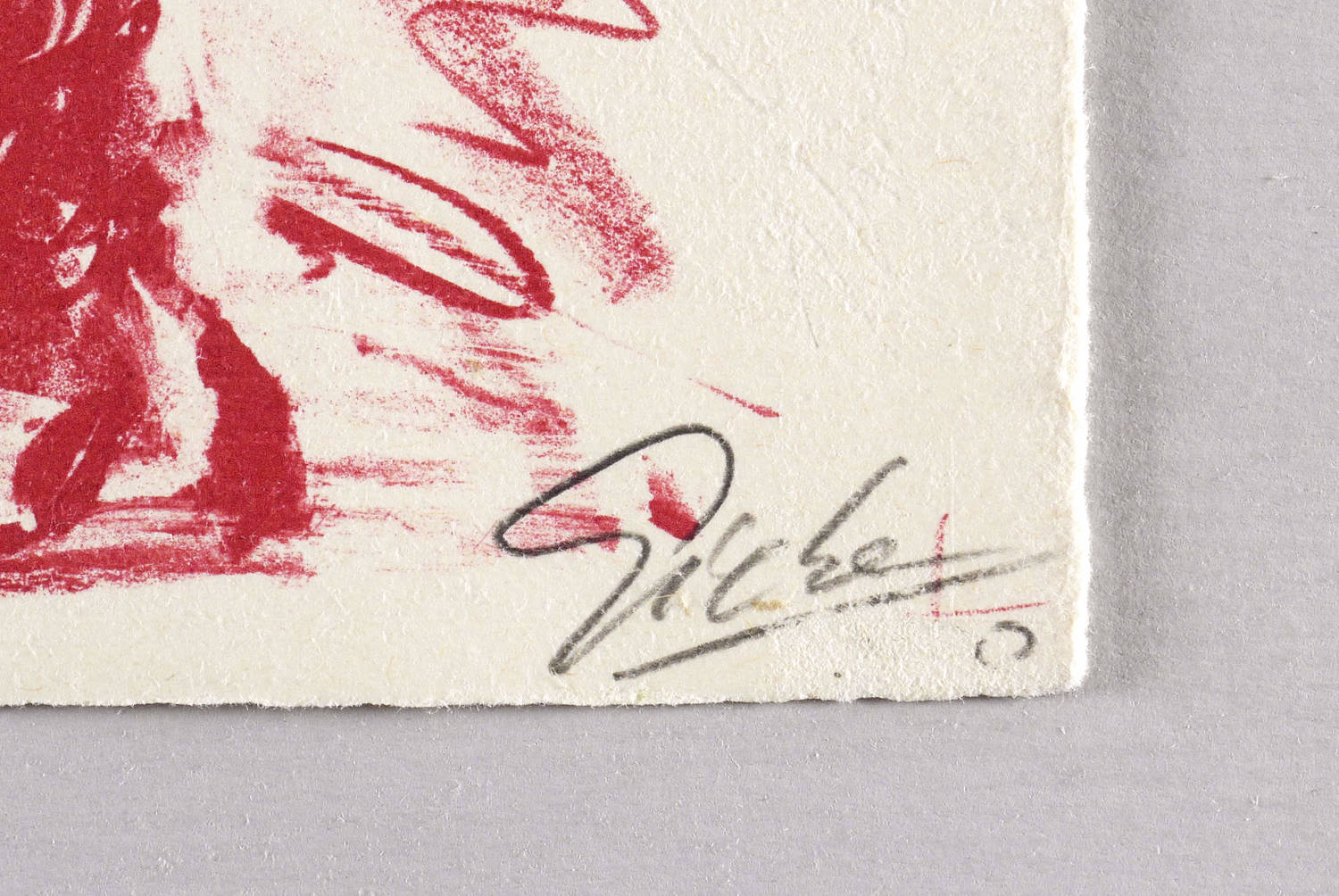 2000. Lithografie / Kreidelithografie, in Rot, auf schwerem gelbem Büttenpapier. – Originale Künstlergrafik, von Hubertus Giebe. – Auflage Exemplar Nr. 40/50. – 21,0 x 20,7 cm (Darstellung / Druckbild), 23 x 23 cm (Blatt).