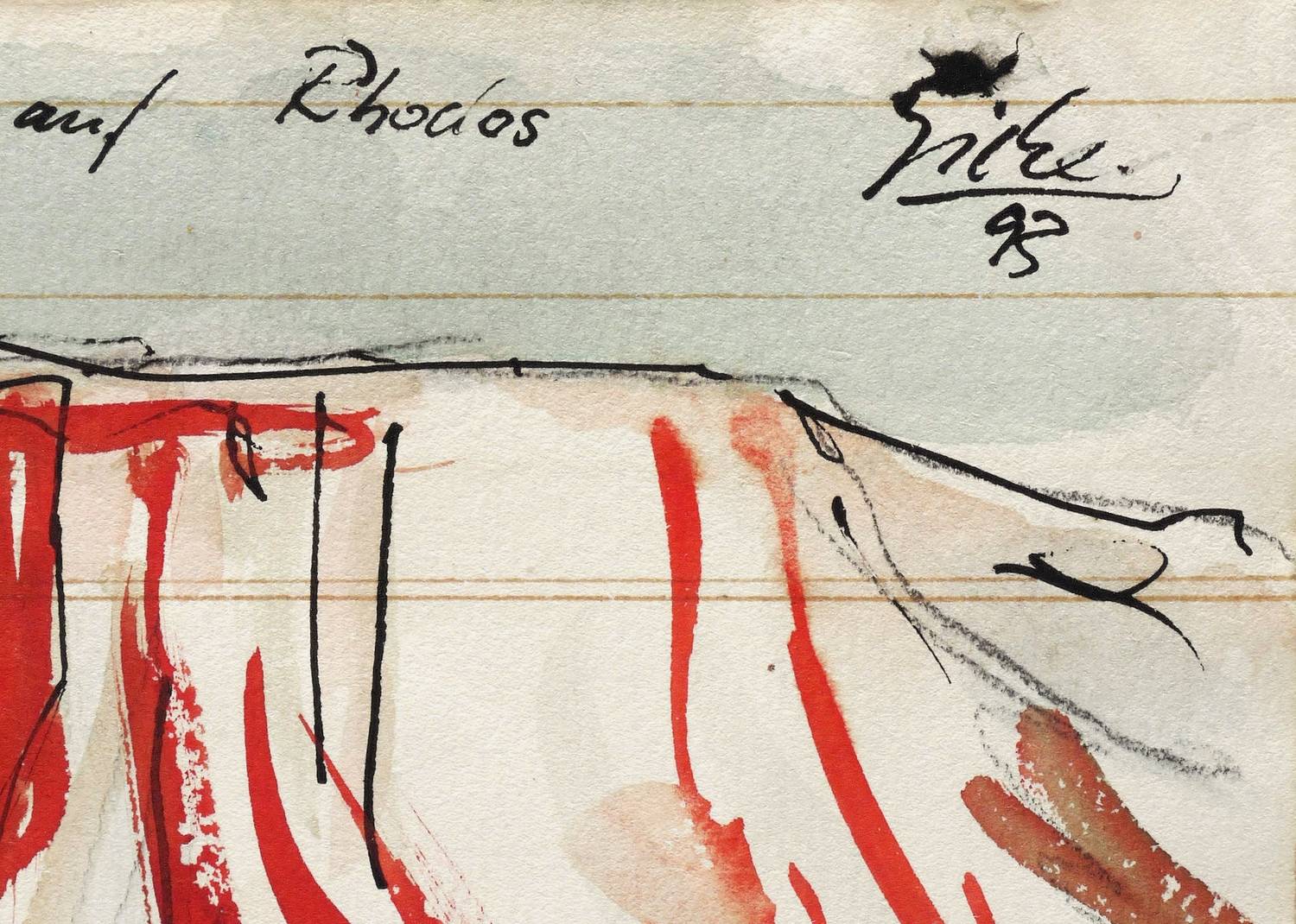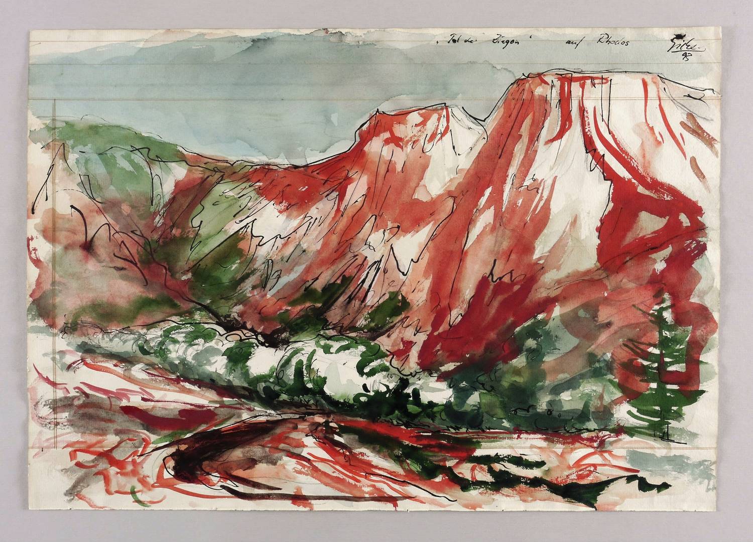 Rechts oben in schwarzer Feder signiert und datiert: ″Giebe 93″. Links daneben TItel: ″'Tal der Ziegen' auf Rhodos″. – Sehr guter Zustand.