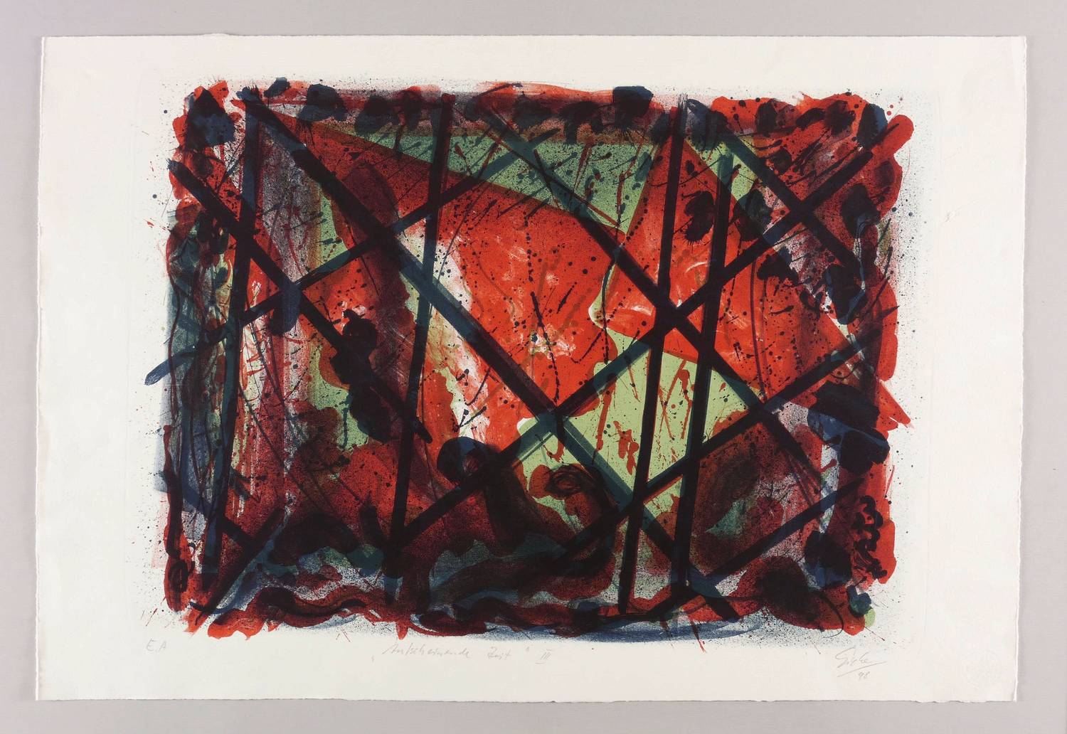 1998. Farblithografie / Kreidelithografie, in 4 Farben, auf schwerem hellchamois Hahnemühle. – Originale Künstlergrafik, von Hubertus Giebe. – Künstlerexemplar (e.a.). – 46,0 x 63,5 cm (Darstellung / Druckbild), 54 x 79 cm (Blatt).