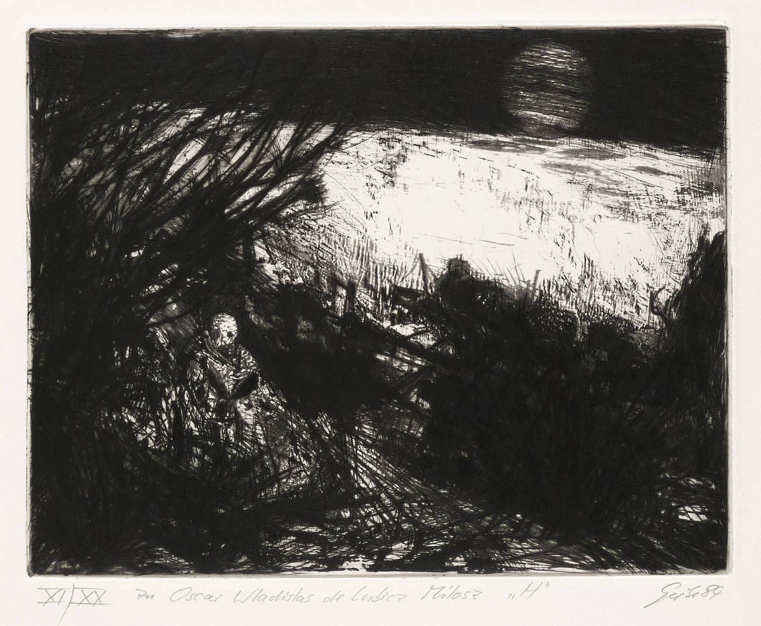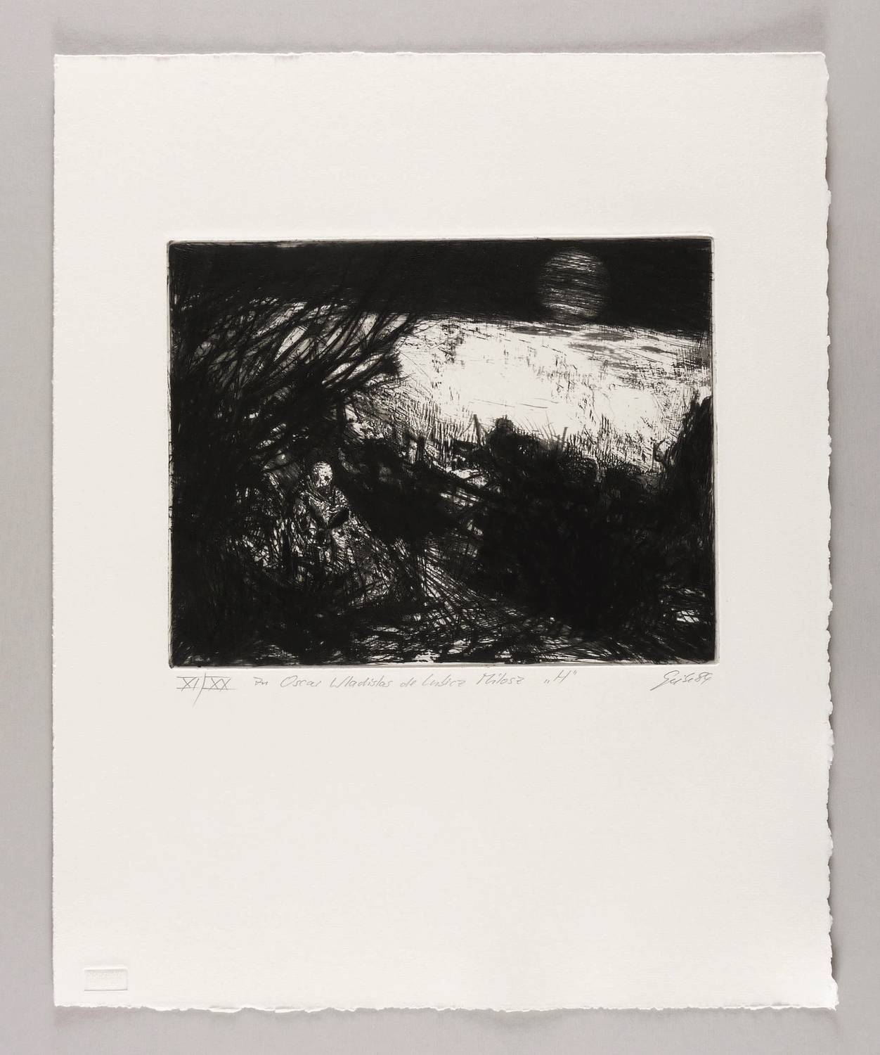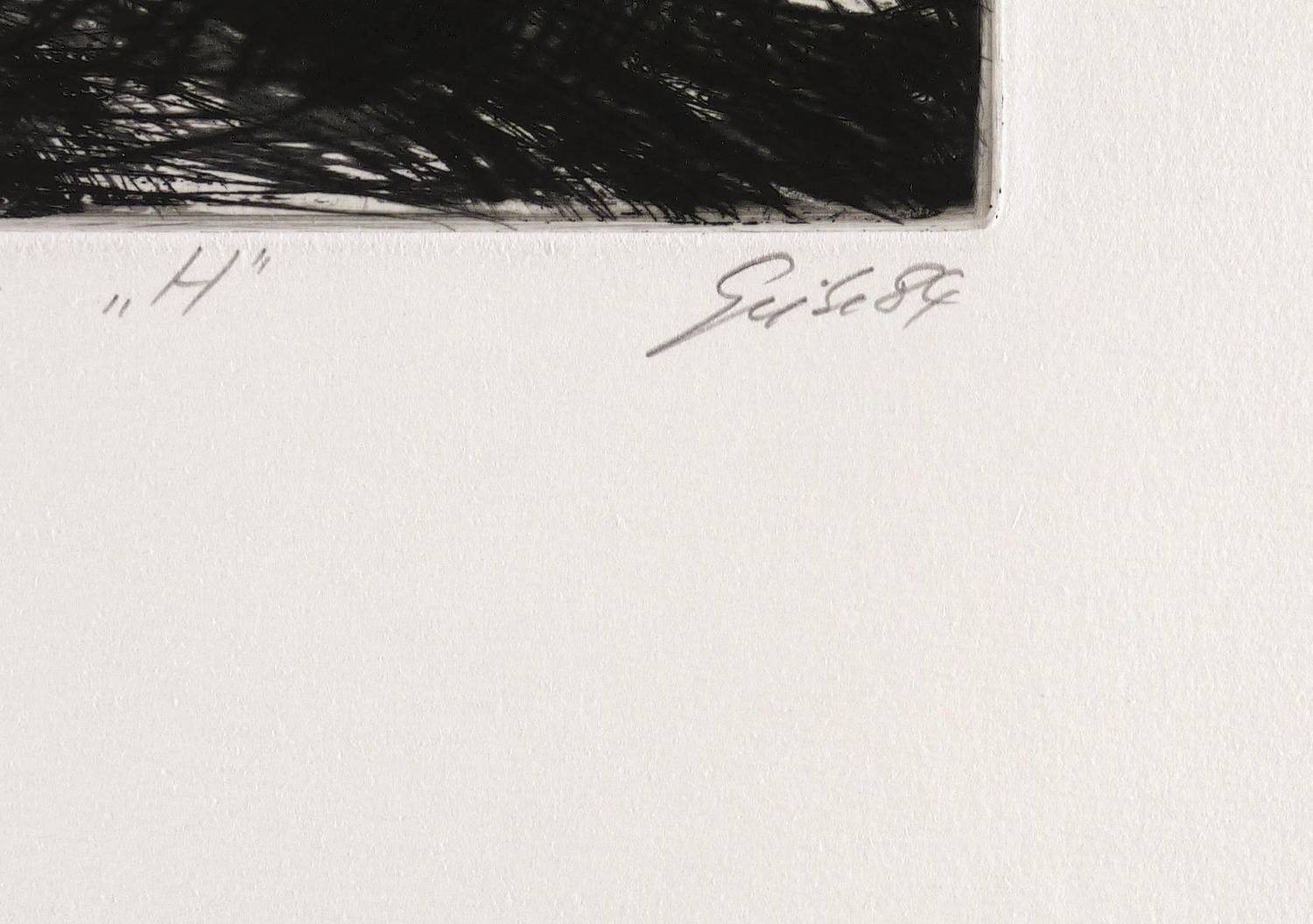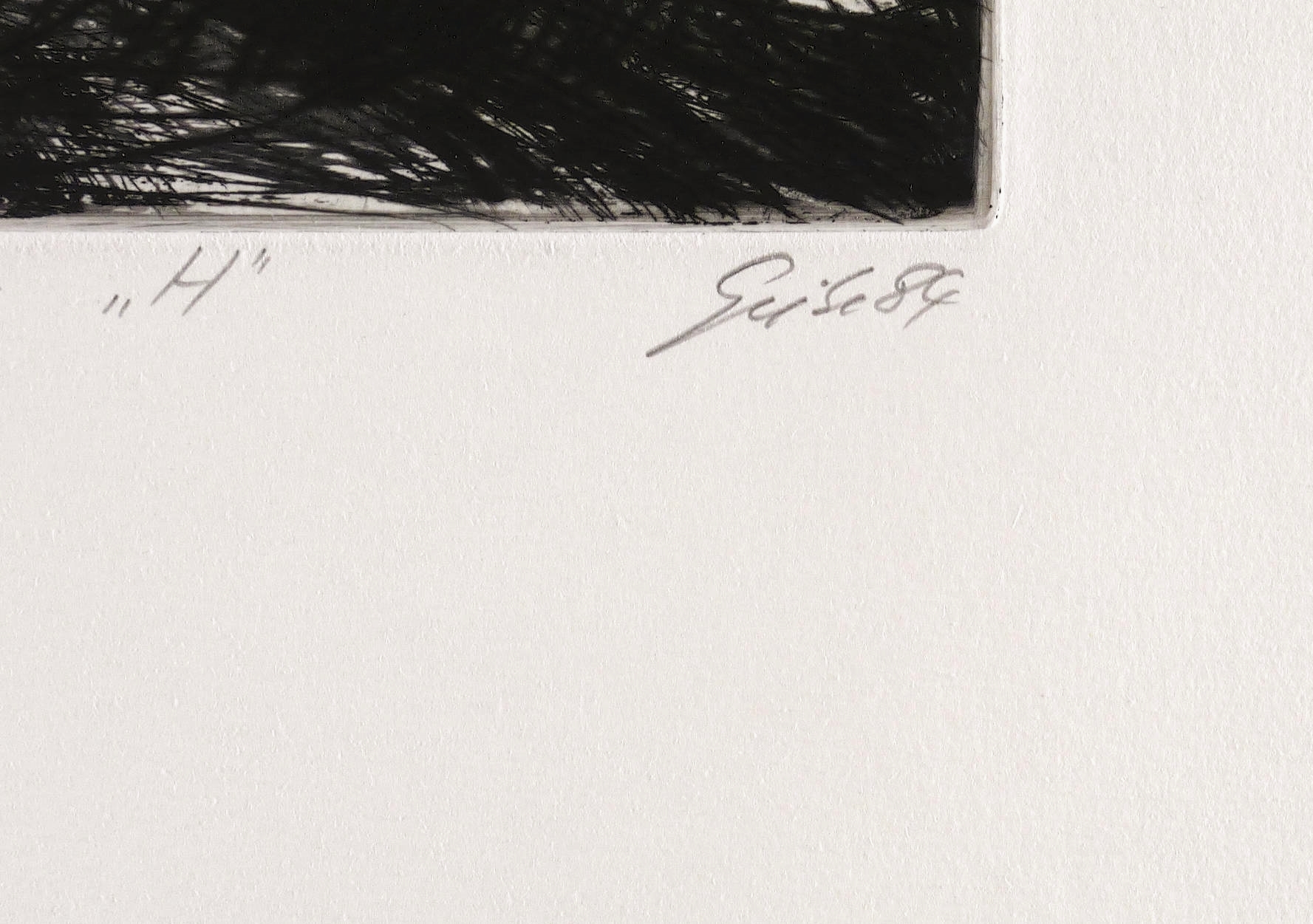 Rechts unten in Bleistift signiert und datiert: ″Giebe 84″. Links Auflagenbezeichnung und Titel: ″XI/XX // zu Oscar Wladislas de Lubicz Milosz 'H'″. Trockenstempel des Druckers Heinz Sparwart. – Exemplar der römisch nummerierten Vorzugsauflage. – Tadellos. Sehr guter Zustand.