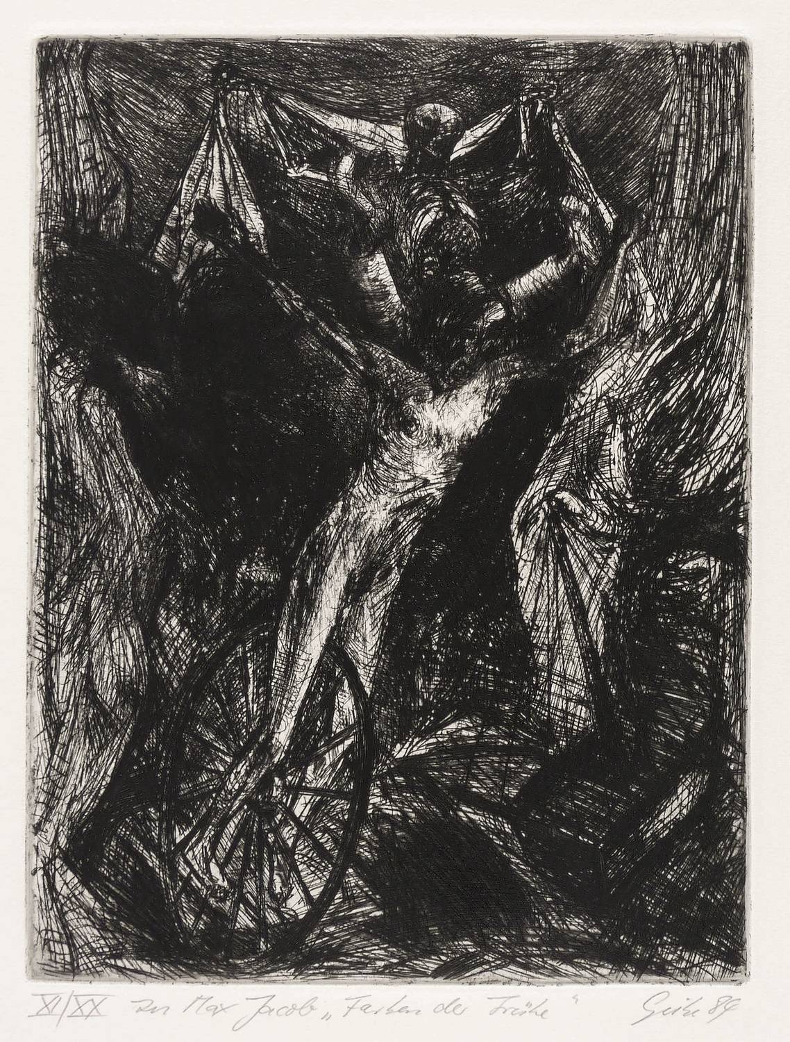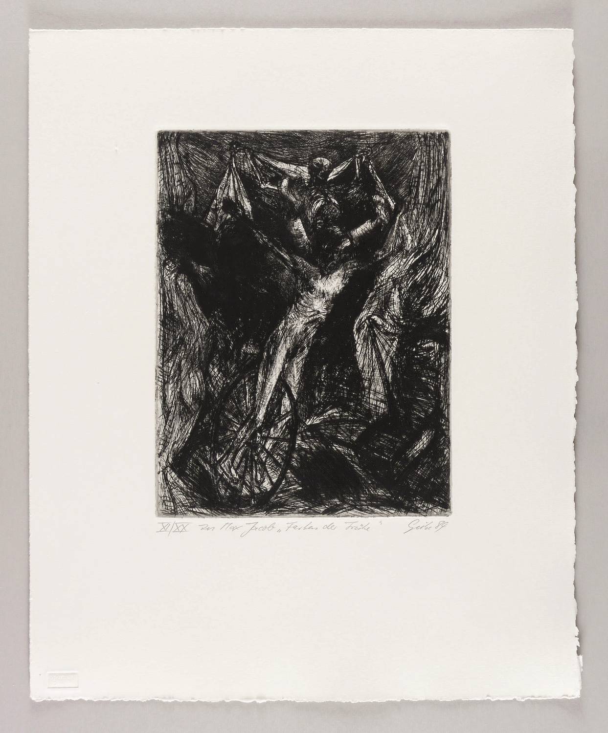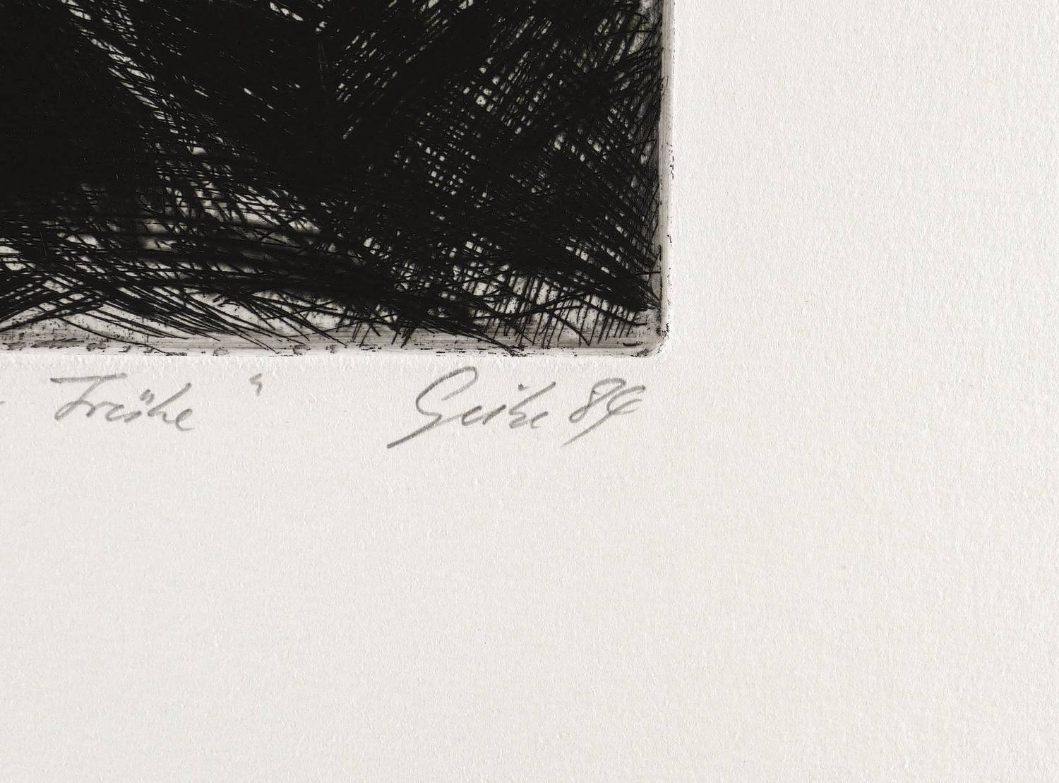 1984. Radierung / Strichätzung & Kaltnadel, in Schwarz, auf schwerem hellchamois Hahnemühle. – Originale Künstlergrafik, von Hubertus Giebe. – Auflage Exemplar Nr. XI/XX. – 32,3 x 24,5 cm (Darstellung / Platte), 56 x 45 cm (Blatt).