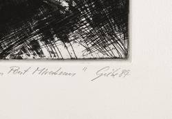 1984. Radierung / Strichätzung & Kaltnadel, in Schwarz, auf schwerem hellchamois Hahnemühle. – Originale Künstlergrafik, von Hubertus Giebe. – Auflage Exemplar Nr. XI/XX. – 39,5 x 30,5 cm (Darstellung / Platte), 56 x 45 cm (Blatt).