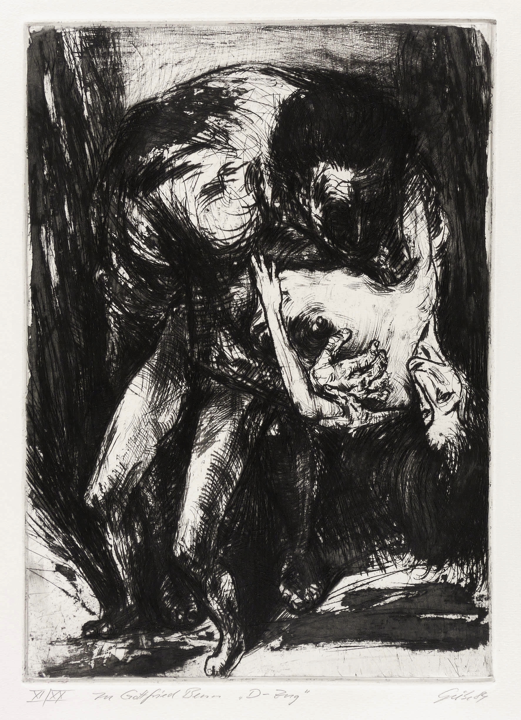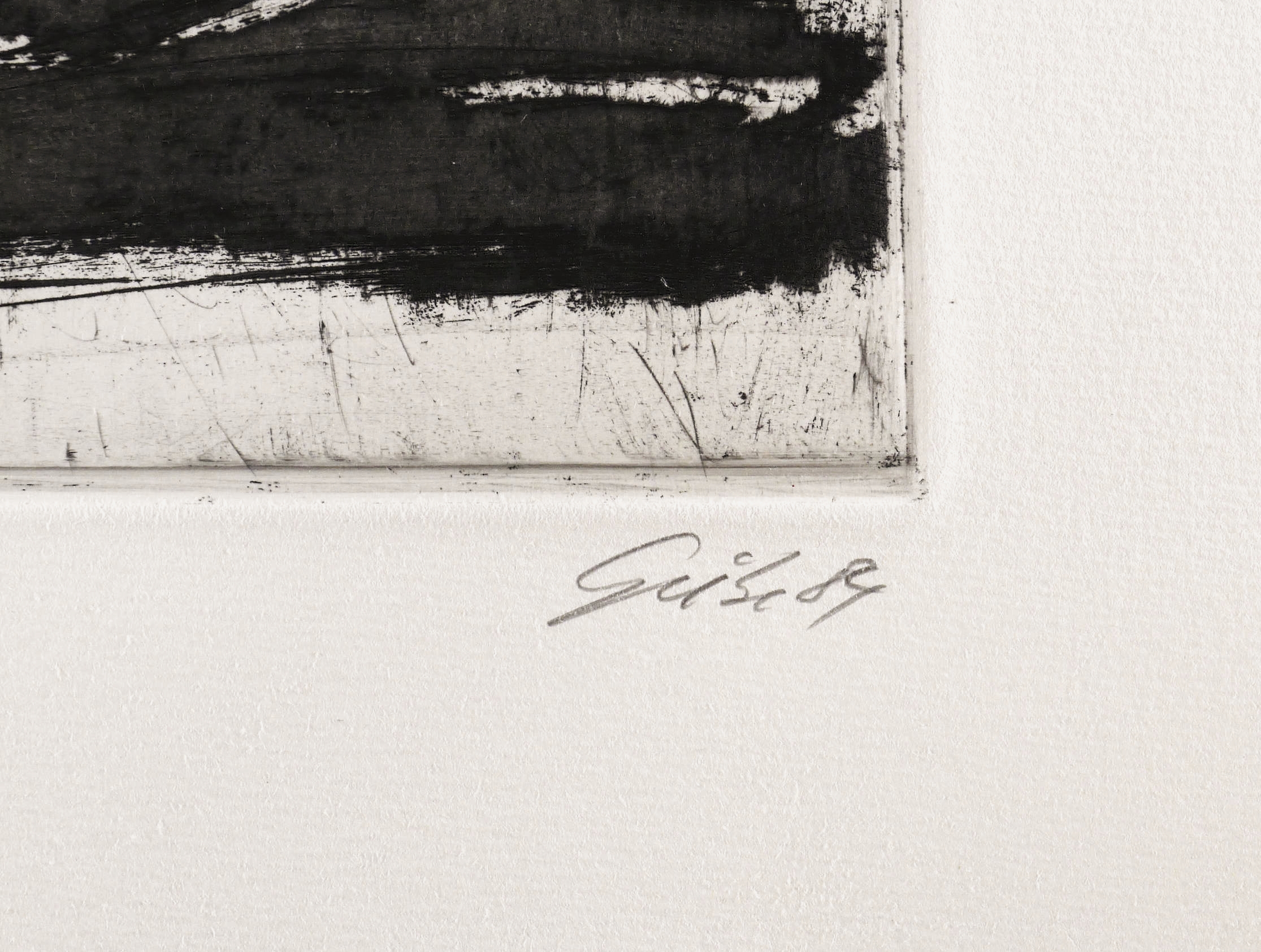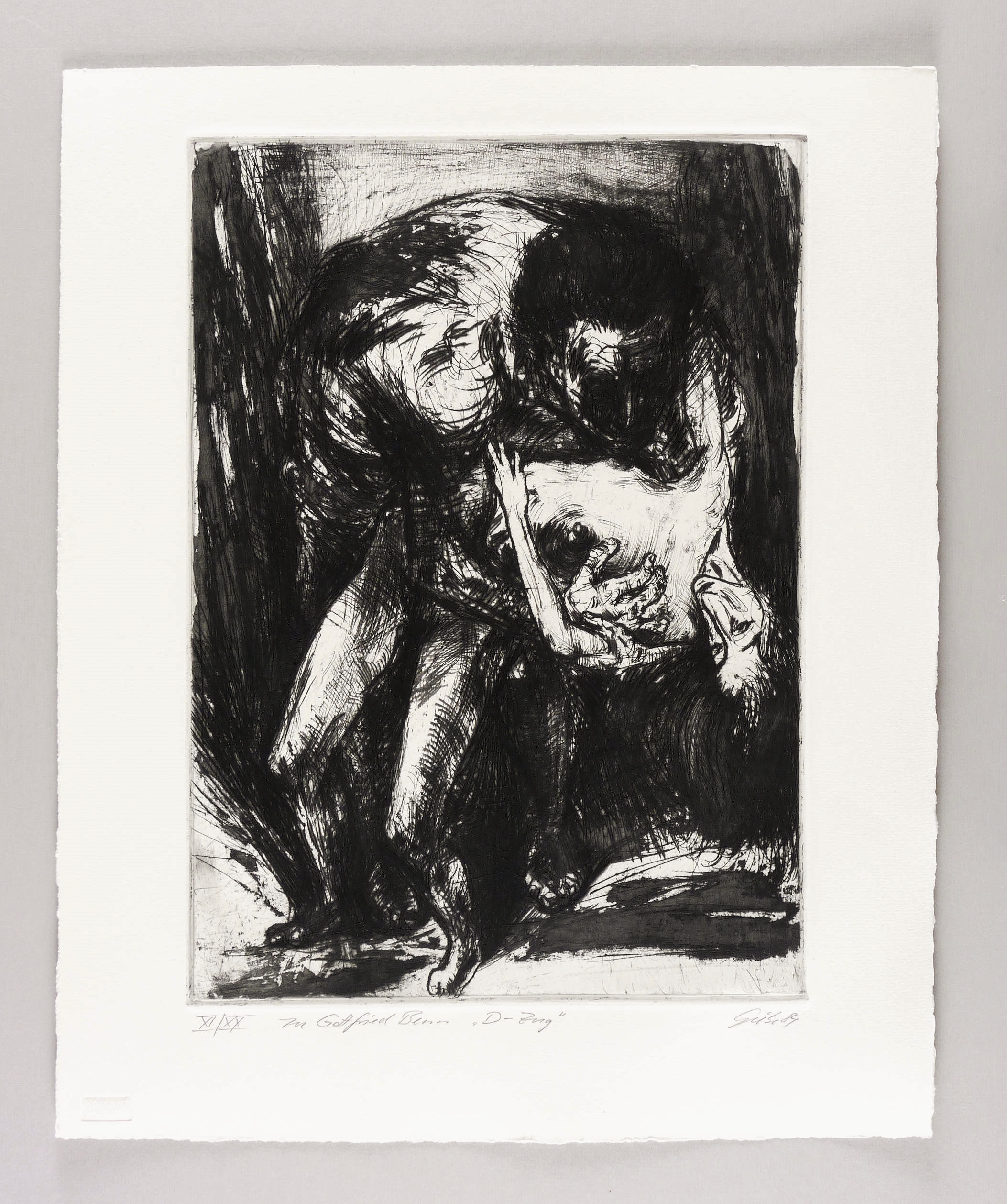 Rechts unten in Bleistift signiert und datiert: ″Giebe 84″. Links Auflagenbezeichnung und Titel: ″XI/XX // zu Gottfried Benn 'D-Zug'″. Trockenstempel des Druckers Heinz Sparwart. – Exemplar der römisch nummerierten Vorzugsauflage. – Tadellos. Sehr guter Zustand.
