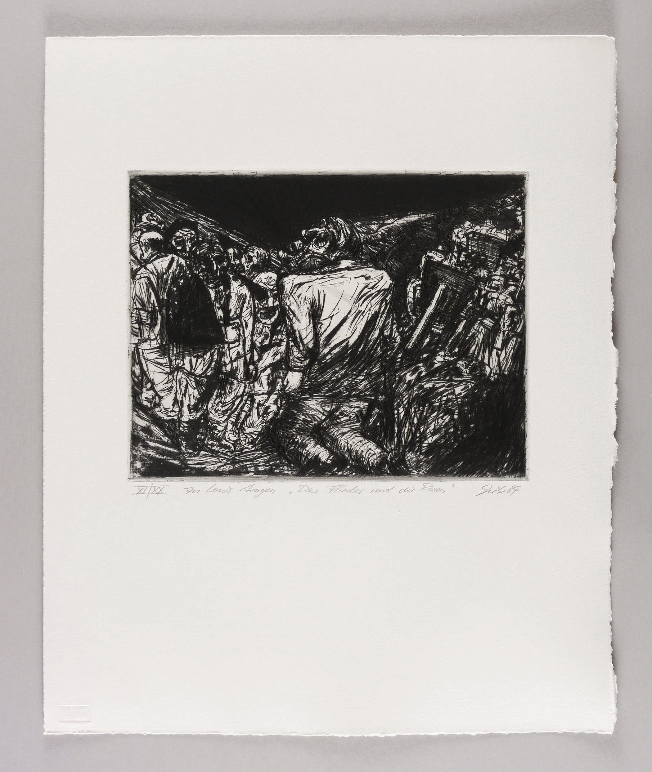 1984. Radierung / Strichätzung & Kaltnadel, in Schwarz, auf schwerem hellchamois Hahnemühle. – Originale Künstlergrafik, von Hubertus Giebe. – Auflage Exemplar Nr. XI/XX. – 24,8 x 32,0 cm (Darstellung / Platte), 56 x 46 cm (Blatt).