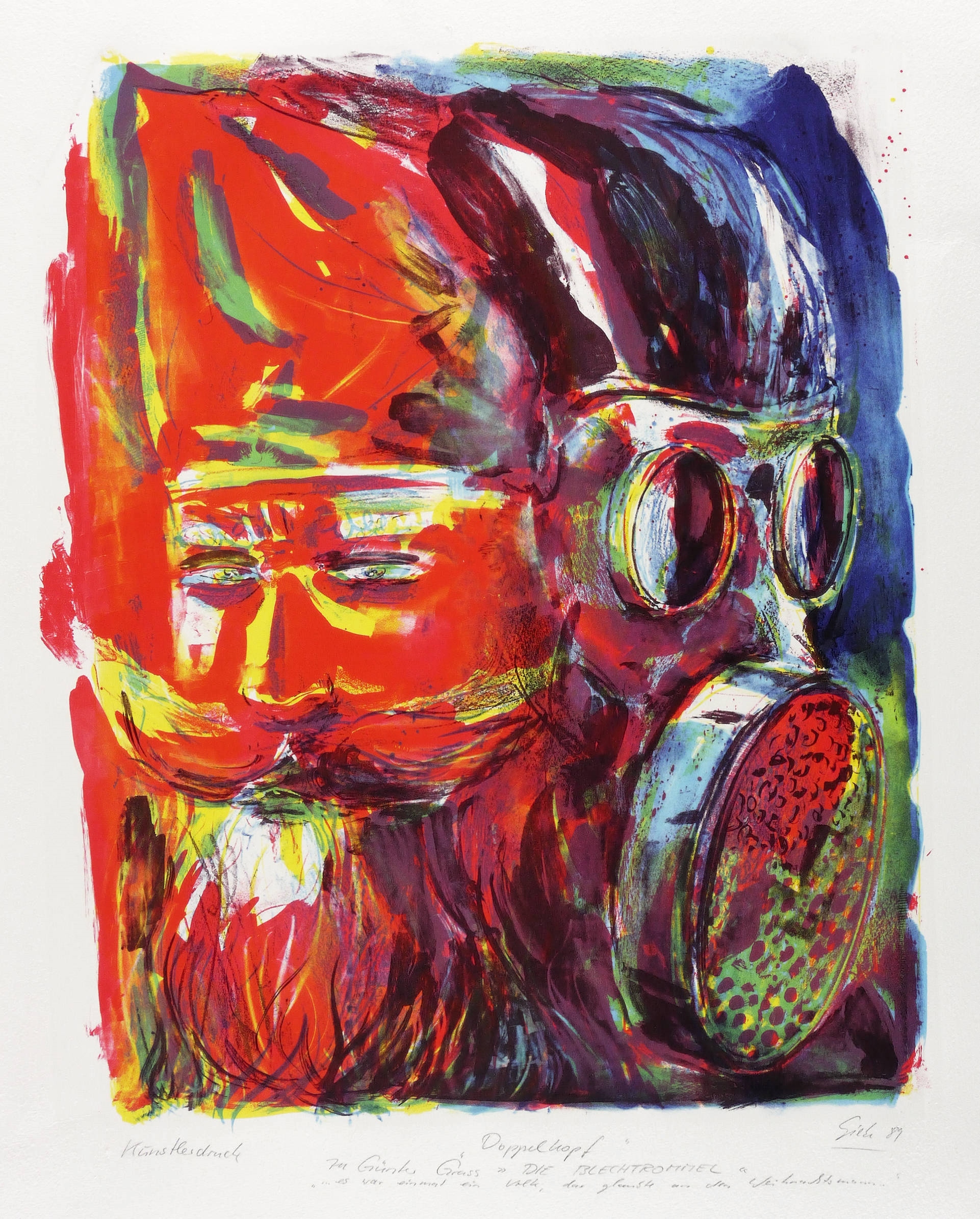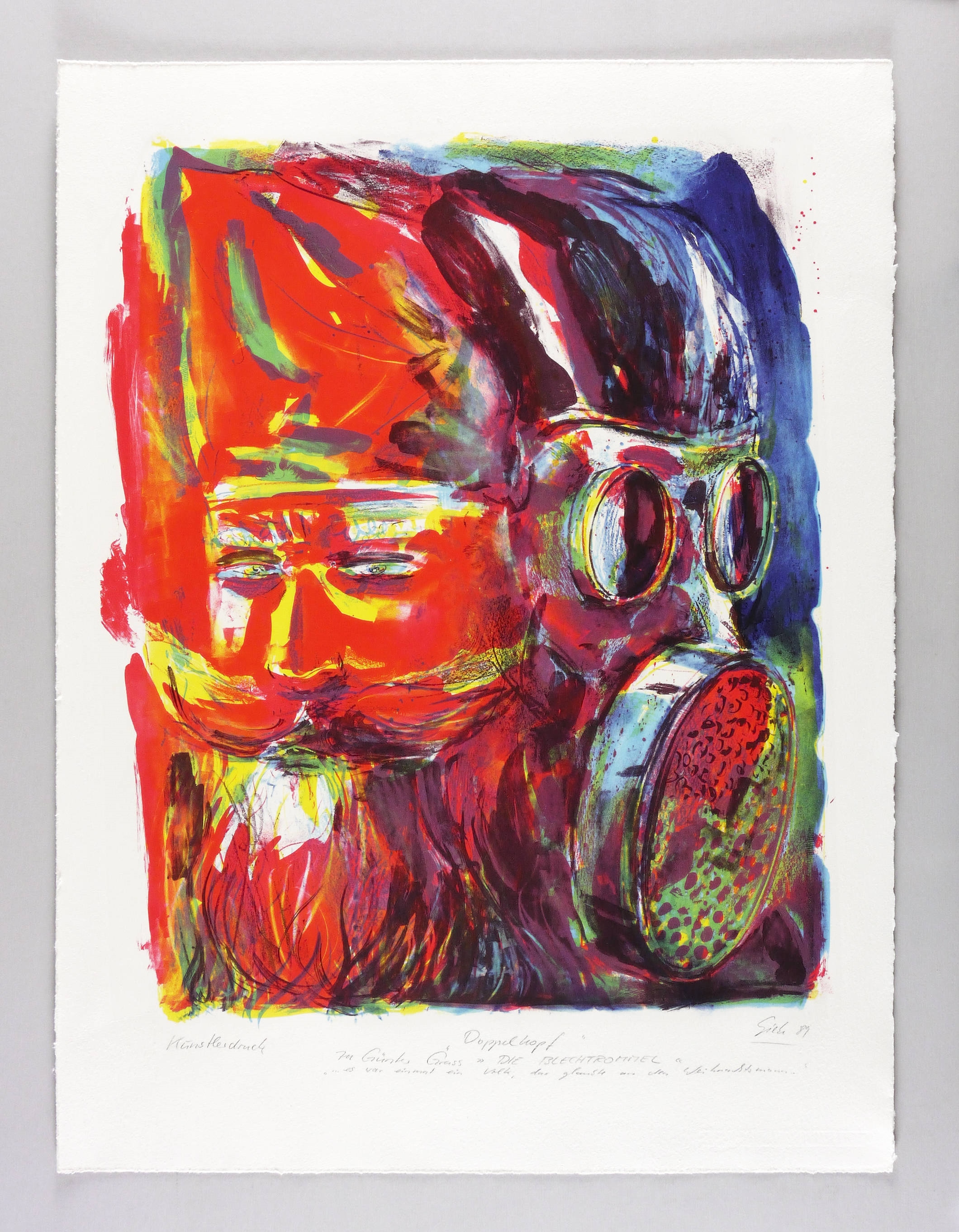 Rechts unten in Bleistift signiert und datiert: ″Giebe 89″. Links eigenhändige Auflagenbezeichnung, mittig bezeichnet: ″Doppelkopf / zu Günter Grass 'Die Blechtrommel' / '... es war einmal ein Volk, das glaubte an den Weihnachtsmann ...'″. Wasserzeichen der Hahnemühle. – Provenienz: Sammlung Dr. Ingrid und Prof. Dr. Albrecht Scholz, Dresden. – Im Rand leichte Lagerspuren. Guter Zustand.