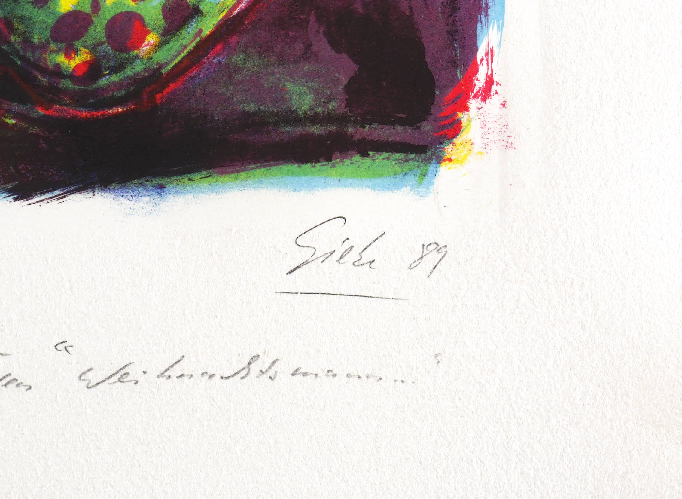 1989. Farblithografie / Kreide- & Pinsellithografie, in 4 Farben, auf schwerem hellchamois Hahnemühle. – Originale Künstlergrafik, von Hubertus Giebe. – Künstlerexemplar (e.a.). – 56,9 x 46,5 cm (Darstellung / Druckbild), 72 x 54 cm (Blatt).