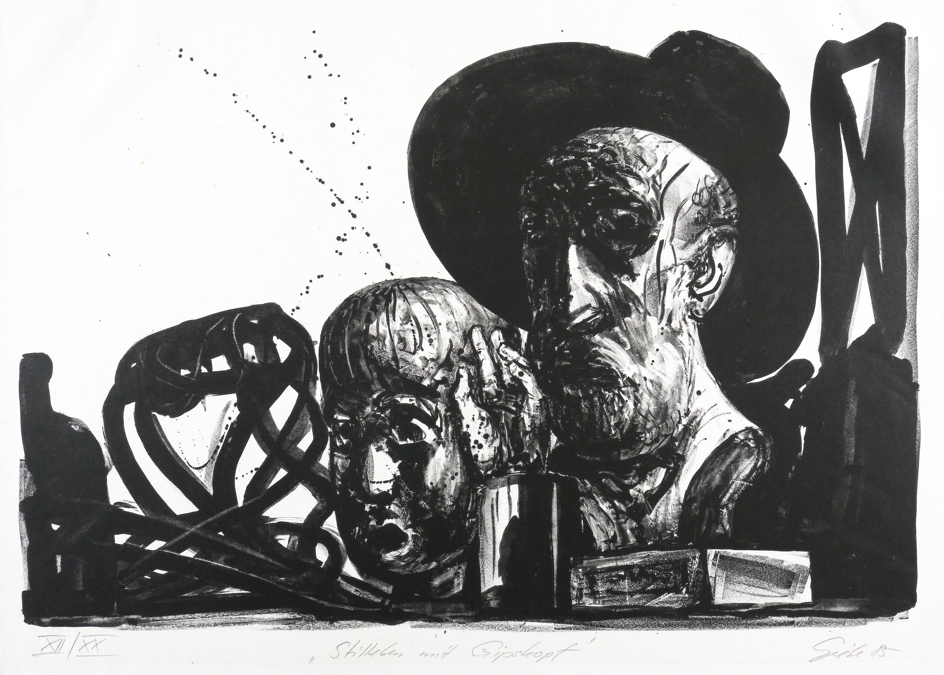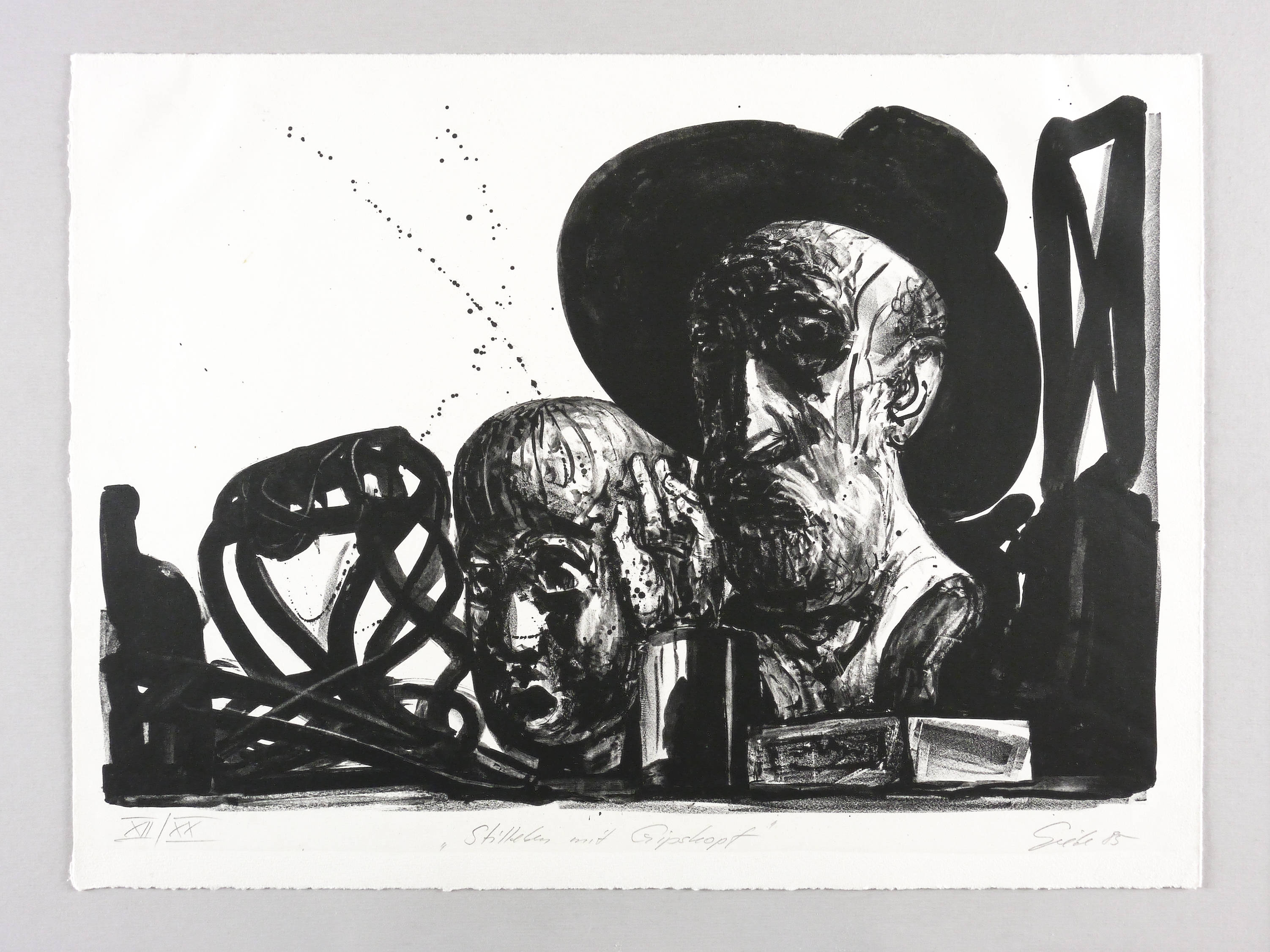 Rechts unten in Bleistift signiert und datiert: ″Giebe 85″. Links Auflagenbezeichnung: ″XII/XX″. Mittig Titel: ″Stilleben mit Gipskopf″. – Unscheinbare Lagerspuren. Guter Zustand.