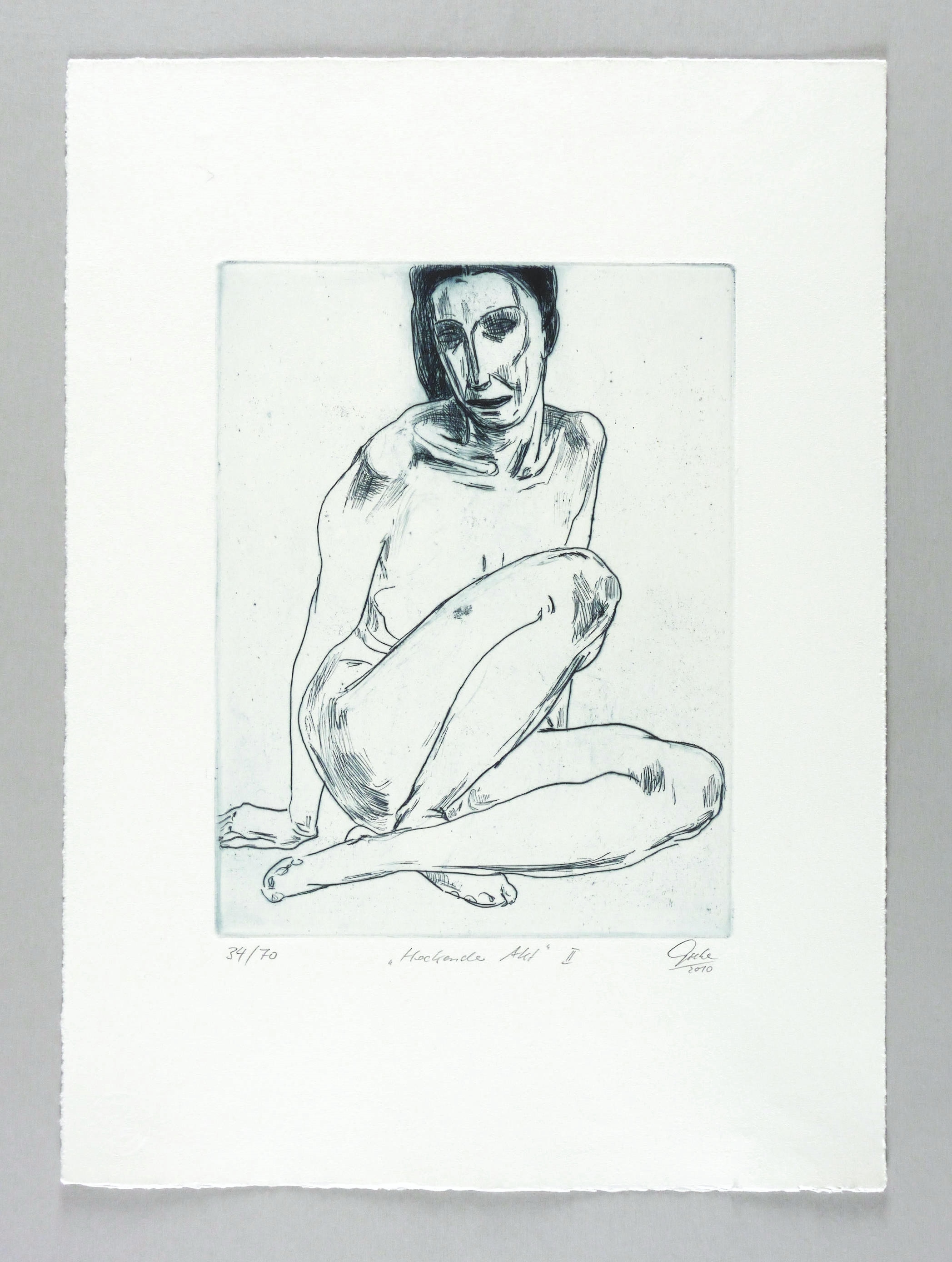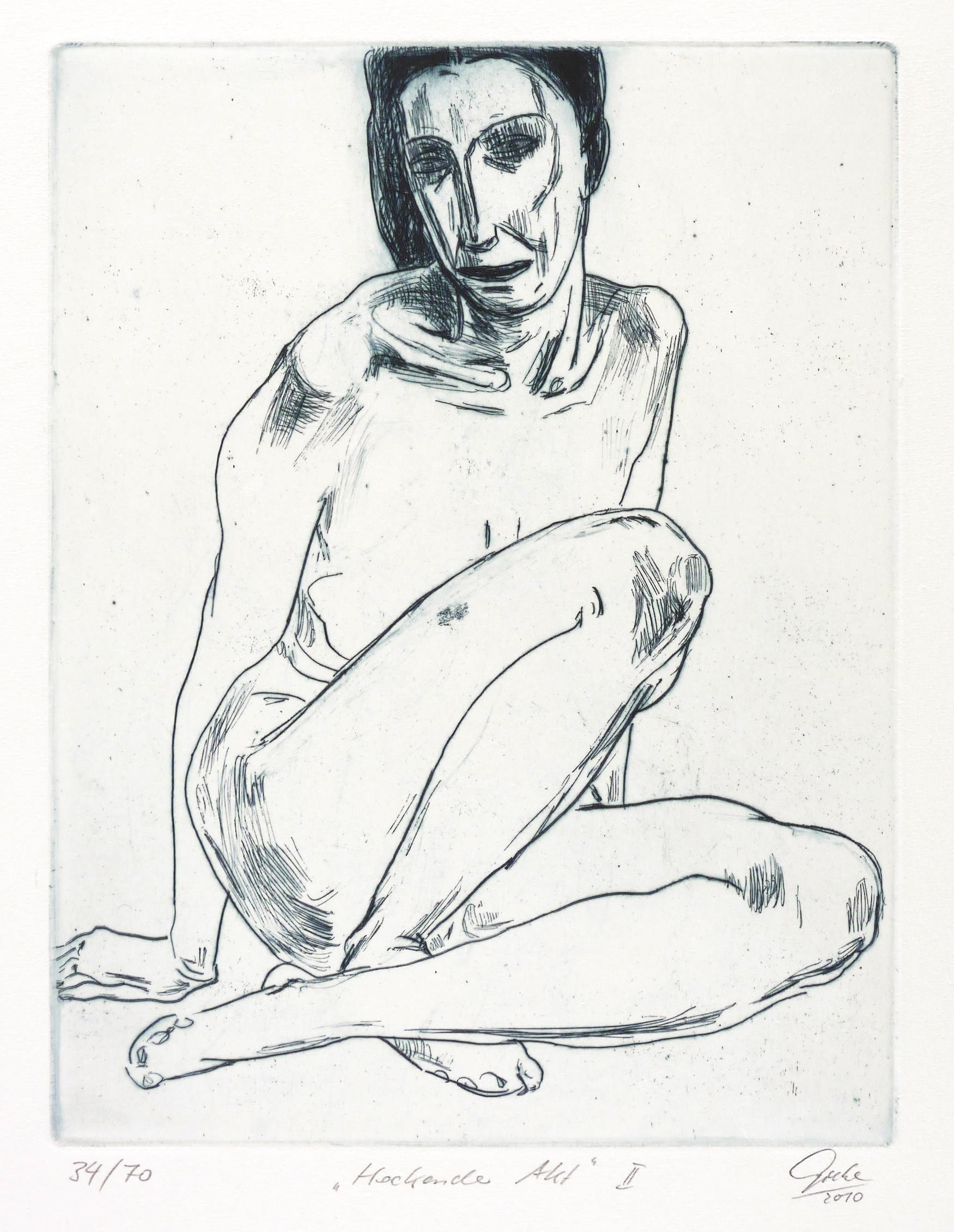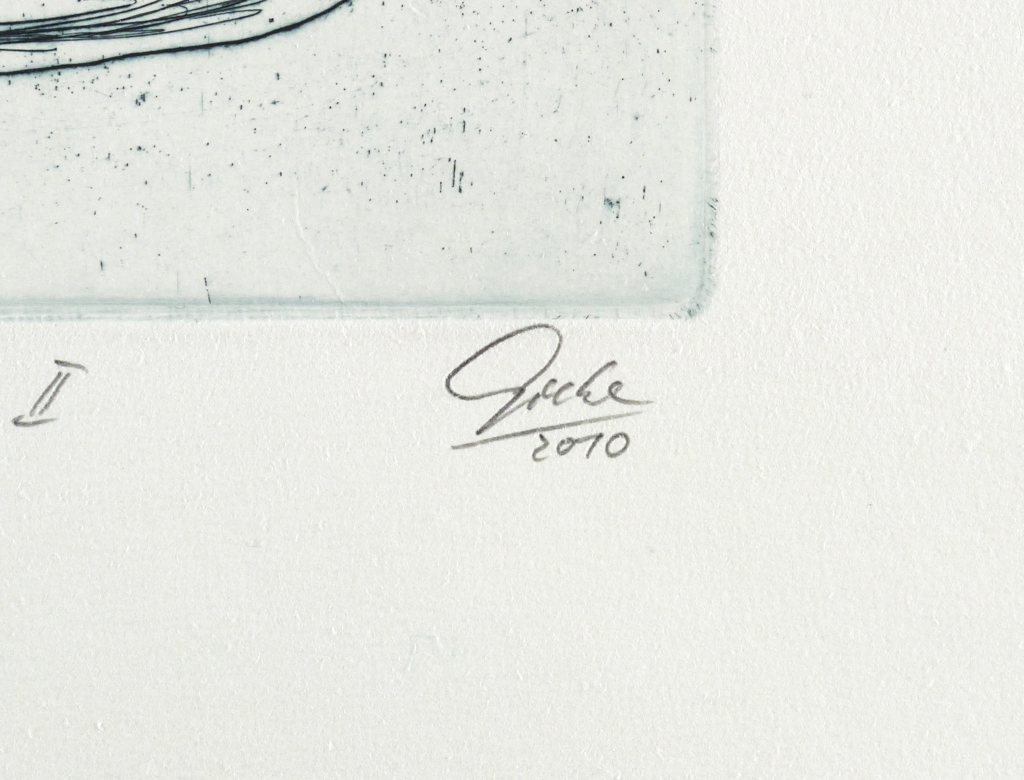 2010. Radierung / Strichätzung, mit leichtem Plattenton, in Schwarzgrün, auf hellchamois Hahnemühle. – Originale Künstlergrafik, von Hubertus Giebe. – Auflage Exemplar Nr. 34/70. – 32,2 x 24,8 cm (Darstellung / Platte), 54 x 40 cm (Blatt).