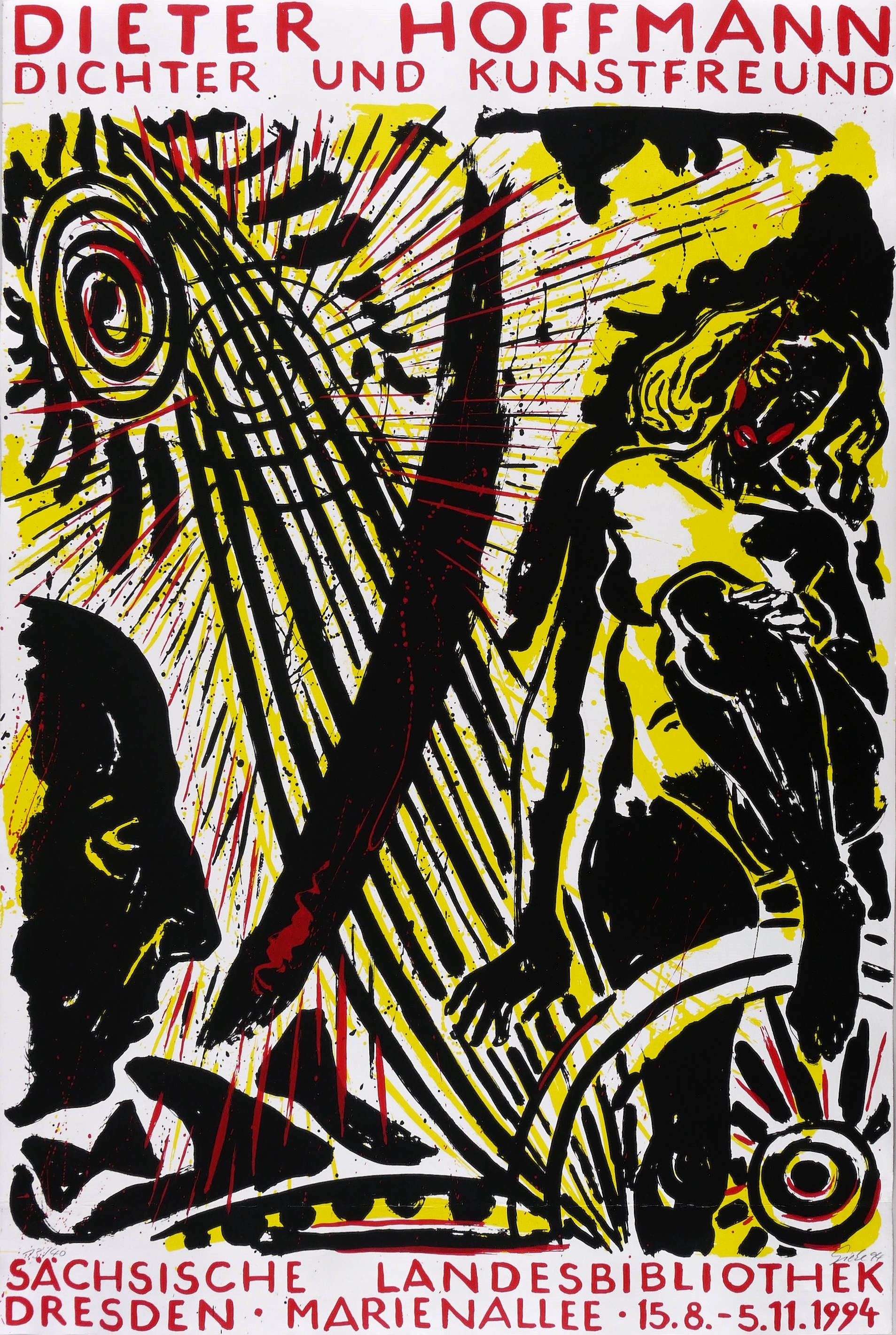Rechts unten in Bleistift signiert und datiert: ″Giebe 94″. Links Auflagenbezeichnung: ″13/40″. – Originalgrafisches Künstlerplakat zur Ausstellung ″Dieter Hoffmann. Dichter und Kunstfreund″ in der Sächsischen Landesbibliothek Dresden 15.8.-5.11.1994. – Originalrandig. Ehemaliger Horizontalfalz im unteren Randbereich weitgehend geglättet. Mäßig guter Zustand.