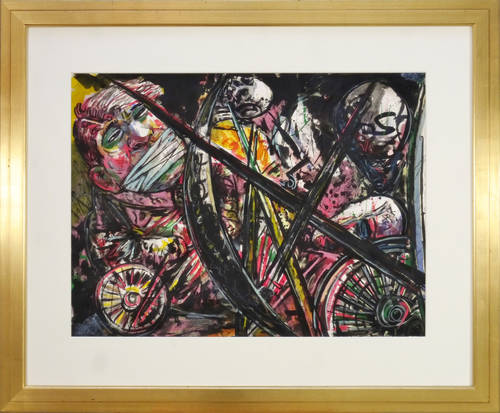 1993. Mischtechnik / Aquarell, Tusche & Gouache, auf hartem gelbem Velin. – Originale Künstlergrafik, von Hubertus Giebe. – Unikat. – 68,0 x 92,0 cm (Darstellung / Blatt), 106 x 128 cm (Rahmen).