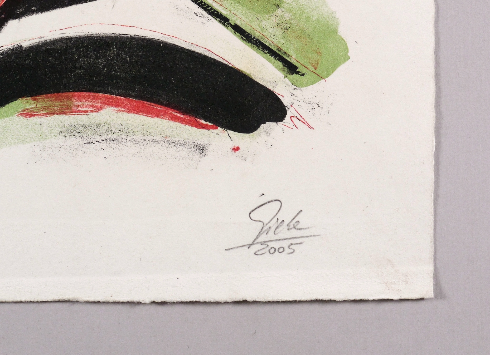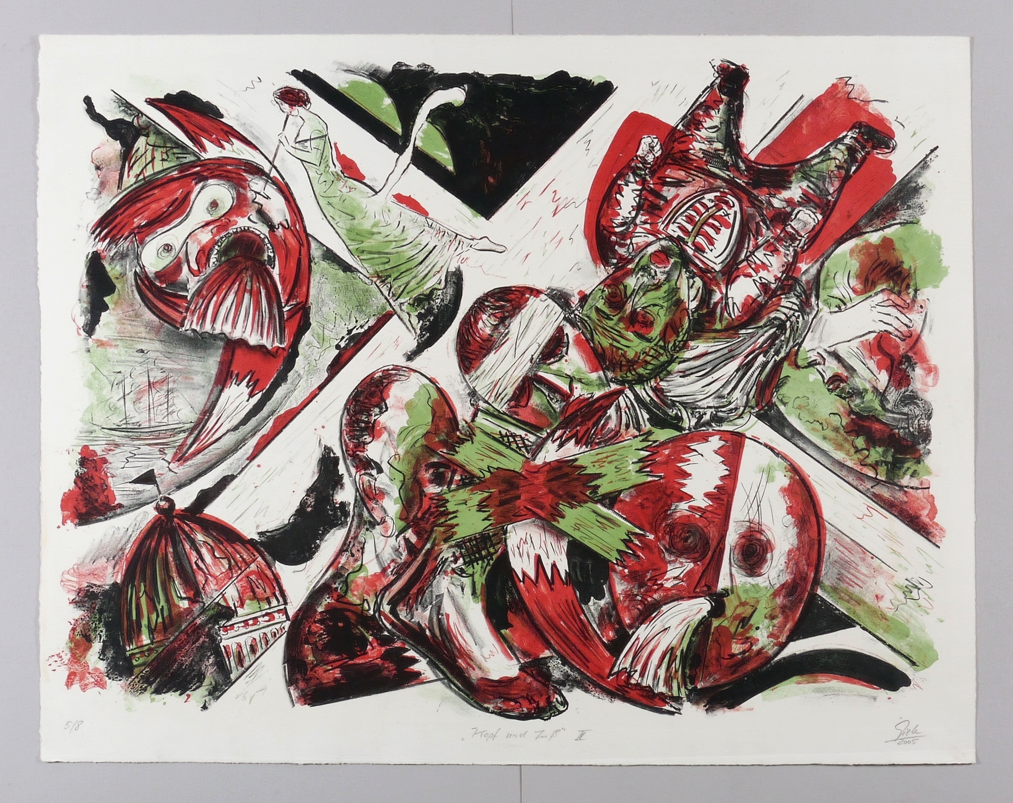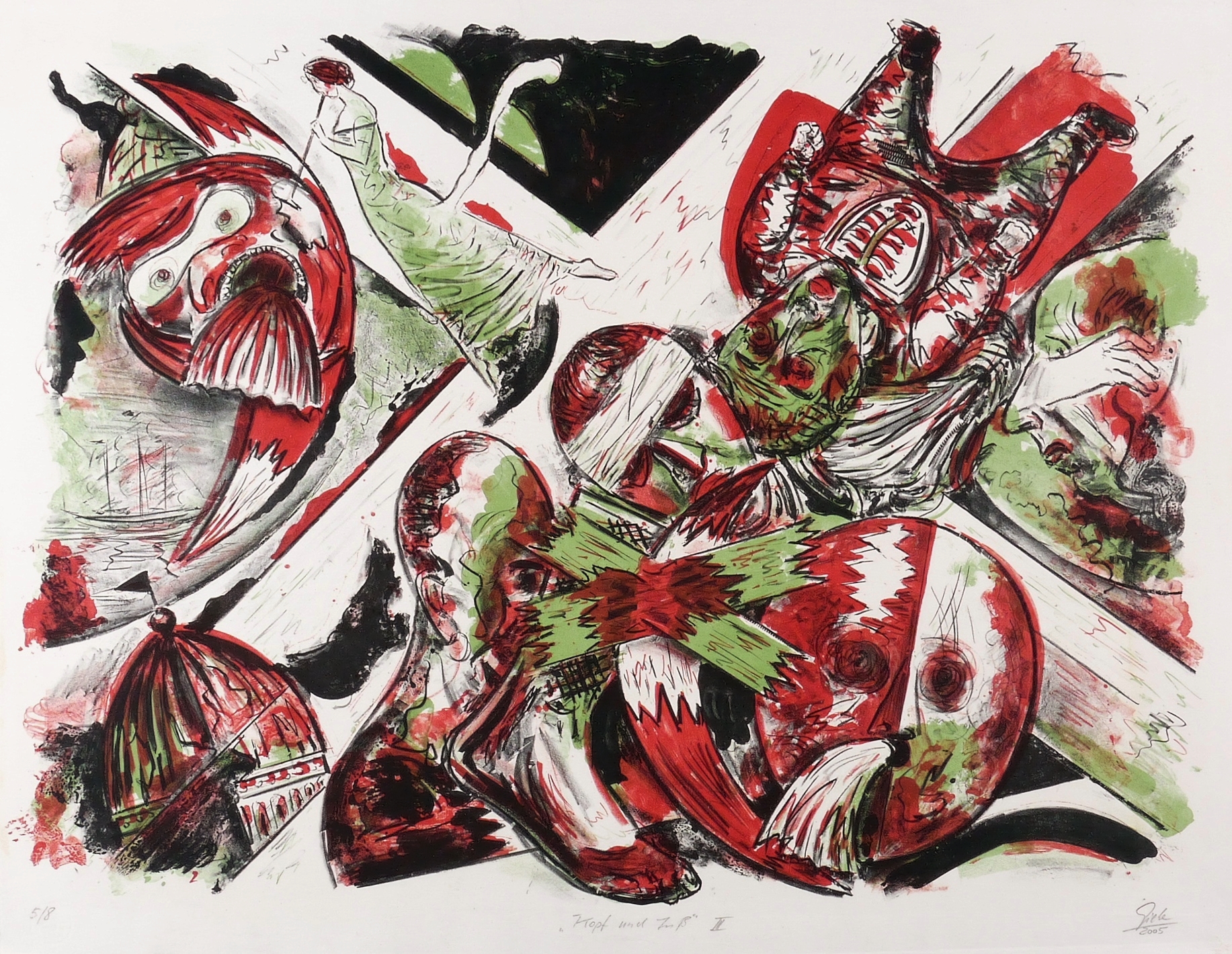 2005. Farblithografie / Kreide- & Pinsellithografie, partiell gespritzt, in Rot, Grün & Schwarz, auf Hahnemühle. – Originale Künstlergrafik, von Hubertus Giebe. – Auflage Exemplar Nr. 5/8. – 64,5 x 88,0 cm (Darstellung / Druckbild), 91 x 71 cm (Blatt).