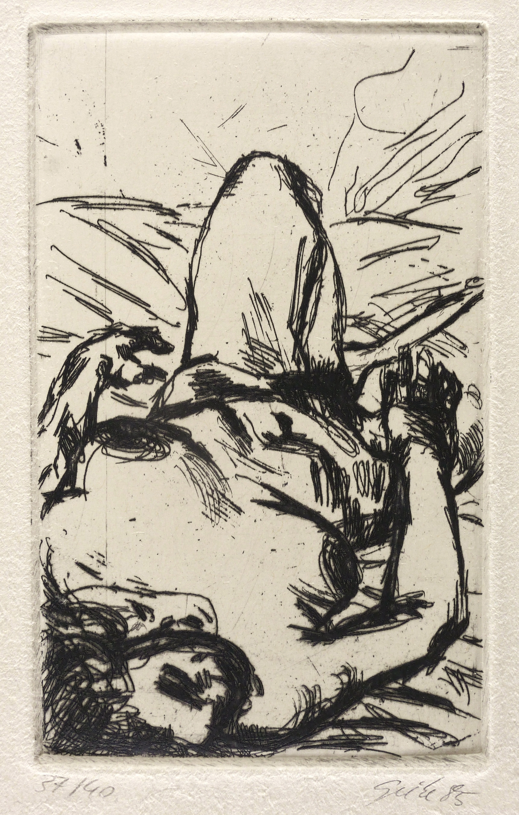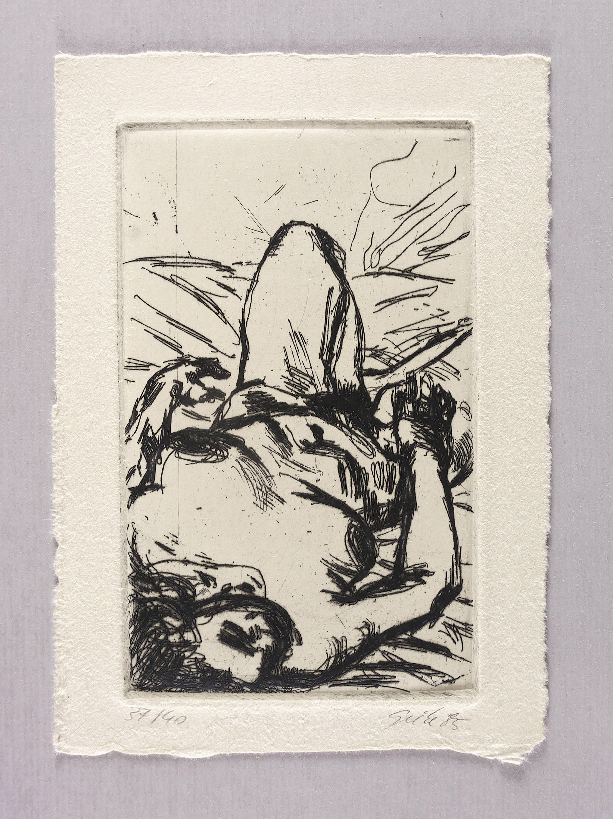 1985. Radierung / Strichätzung, in Schwarz, auf weichem hellchamois Bütten. – Originale Künstlergrafik, von Hubertus Giebe. – Auflage Exemplar Nr. 37/40. – 15,7 x 9,6 cm (Darstellung / Platte), 19 x 14 cm (Blatt).