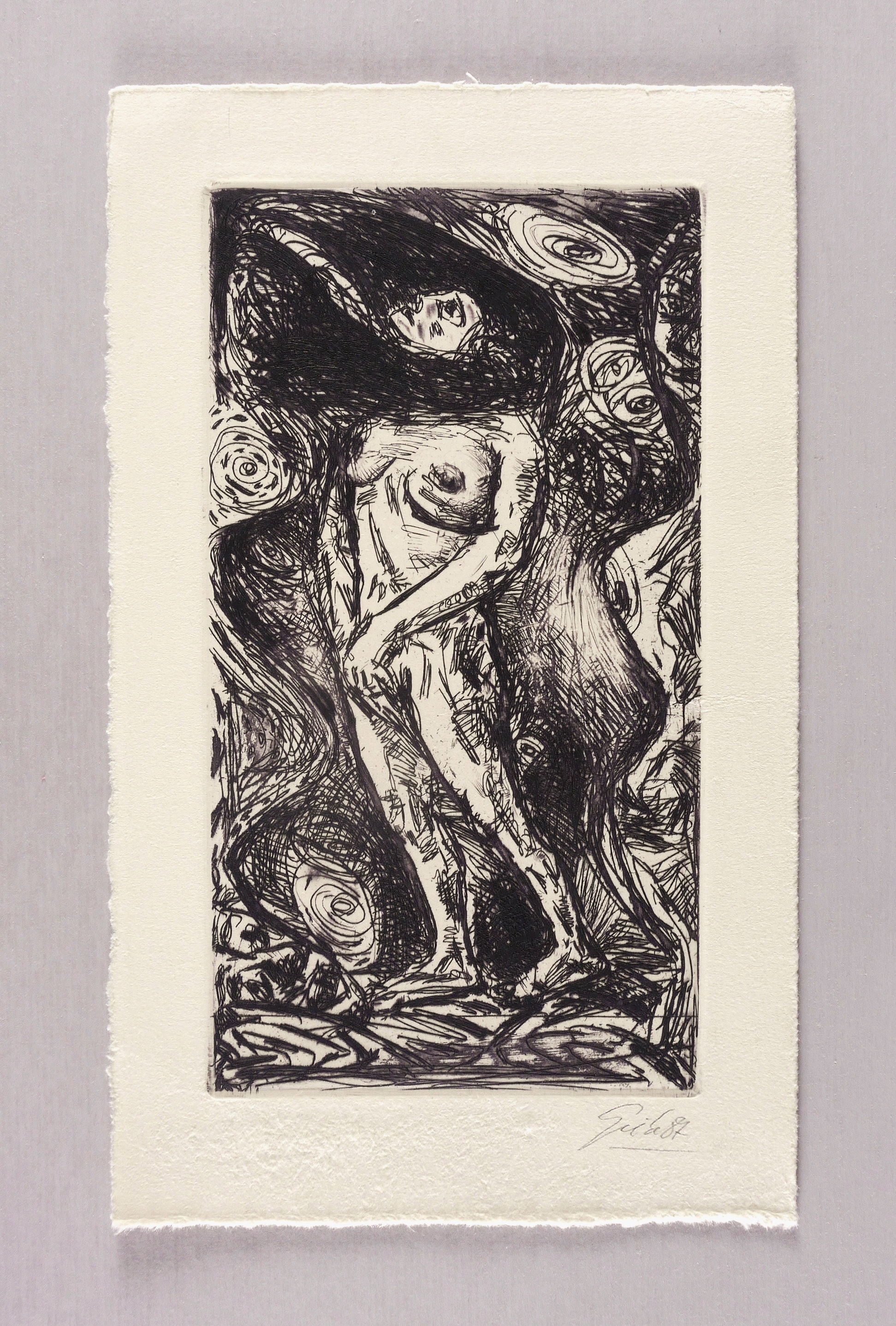 1987. Radierung / Strichätzung, in Schwarz, auf hellchamois Hahnemühle. – Originale Künstlergrafik, von Hubertus Giebe. – 21,6 x 11,5 cm (Darstellung / Platte), 27 x 17 cm (Blatt).