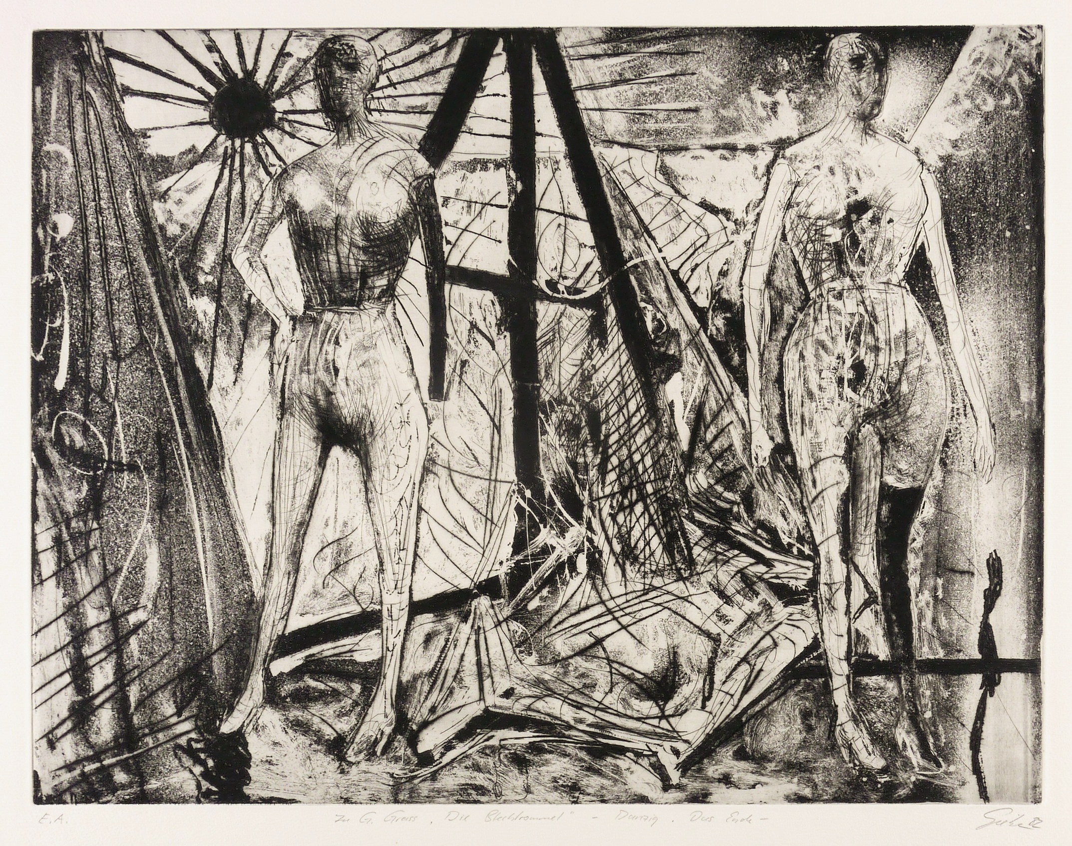 Rechts unten in Bleistift signiert und datiert: ″Giebe 82″. Links Auflagenbezeichnung: E.A.″ Mittig Titel: ″zu G. Grass 'Die Blechtrommel' - Danzig. Das Ende″. Blindstempel des Druckers Heinz Sparwart, Dresden. Wasserzeichen der Hahnemühle. – Sehr guter Zustand.