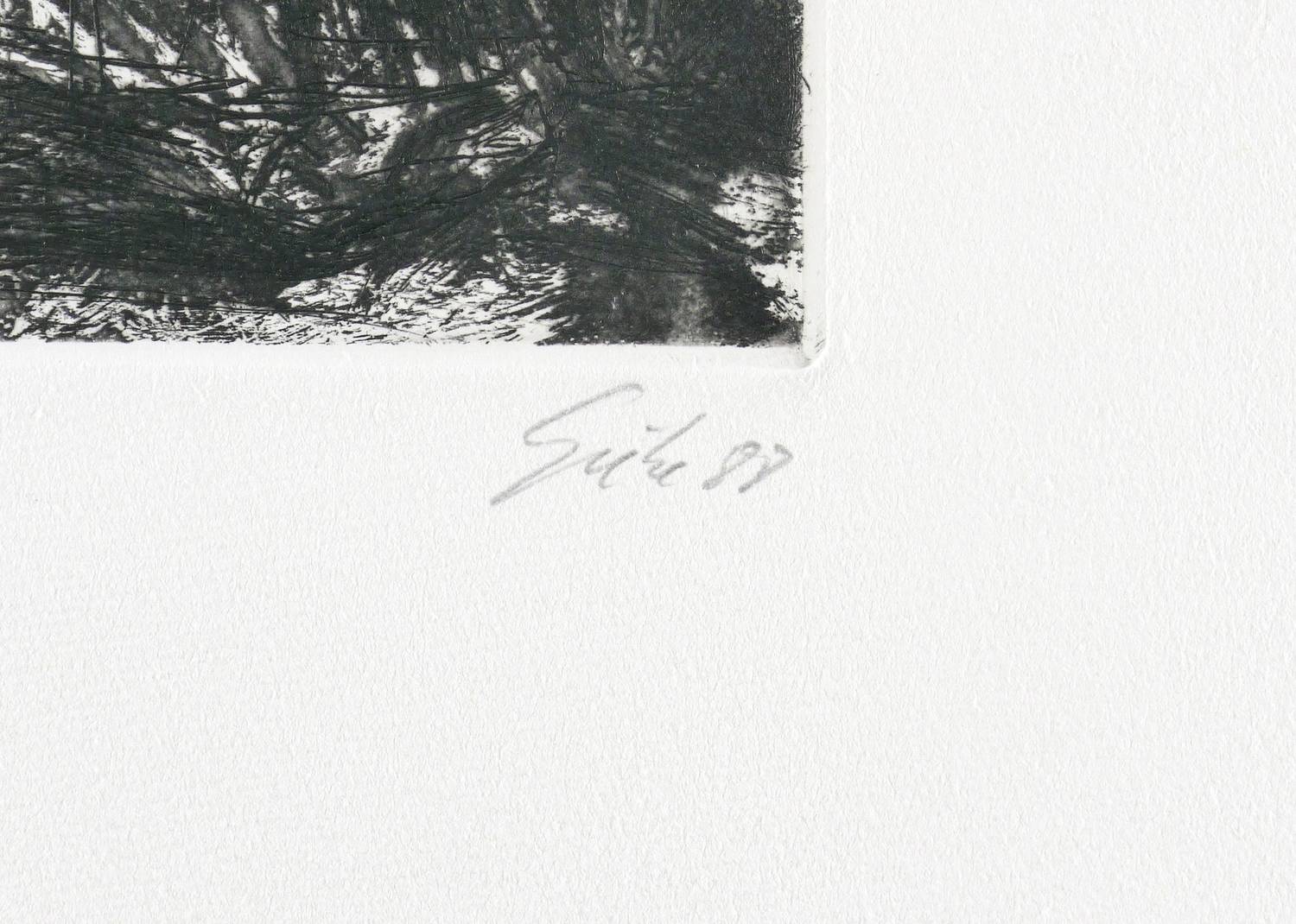 1988. Radierung / Strichätzung, Aquatinta & Roulette, in Schwarz, auf schwerem hellchamois Hahnemühle. – Originale Künstlergrafik, von Hubertus Giebe. – Druckerexemplar. – 25,6 x 32,3 cm (Darstellung / Platte), 38 x 49 cm (Blatt).