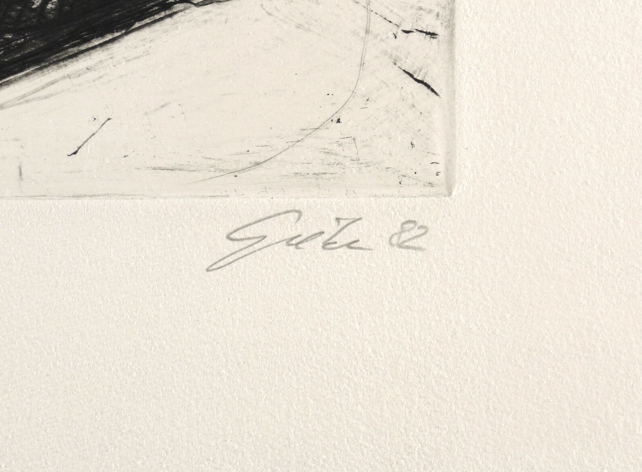 1982. Radierung / Strichätzung & Kaltnadel, in Schwarz, auf kräftigem hellchamois Hahnemühle. – Originale Künstlergrafik, von Hubertus Giebe. – Künstlerexemplar (e.a.). – 49,6 x 64,3 cm (Darstellung / Platte), 66 x 79 cm (Blatt).