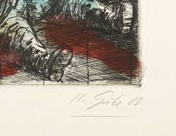 1988. Radierung / Strichätzung, Aquatointa & Kaltnadel, in Schwarz, aquarelliert, auf festem hellchamois Velin. – Originale Künstlergrafik, von Hubertus Giebe. – Zustandsdruck. – 27,1 x 40,3 cm (Darstellung / Platte), 35 x 49 cm (Blatt).