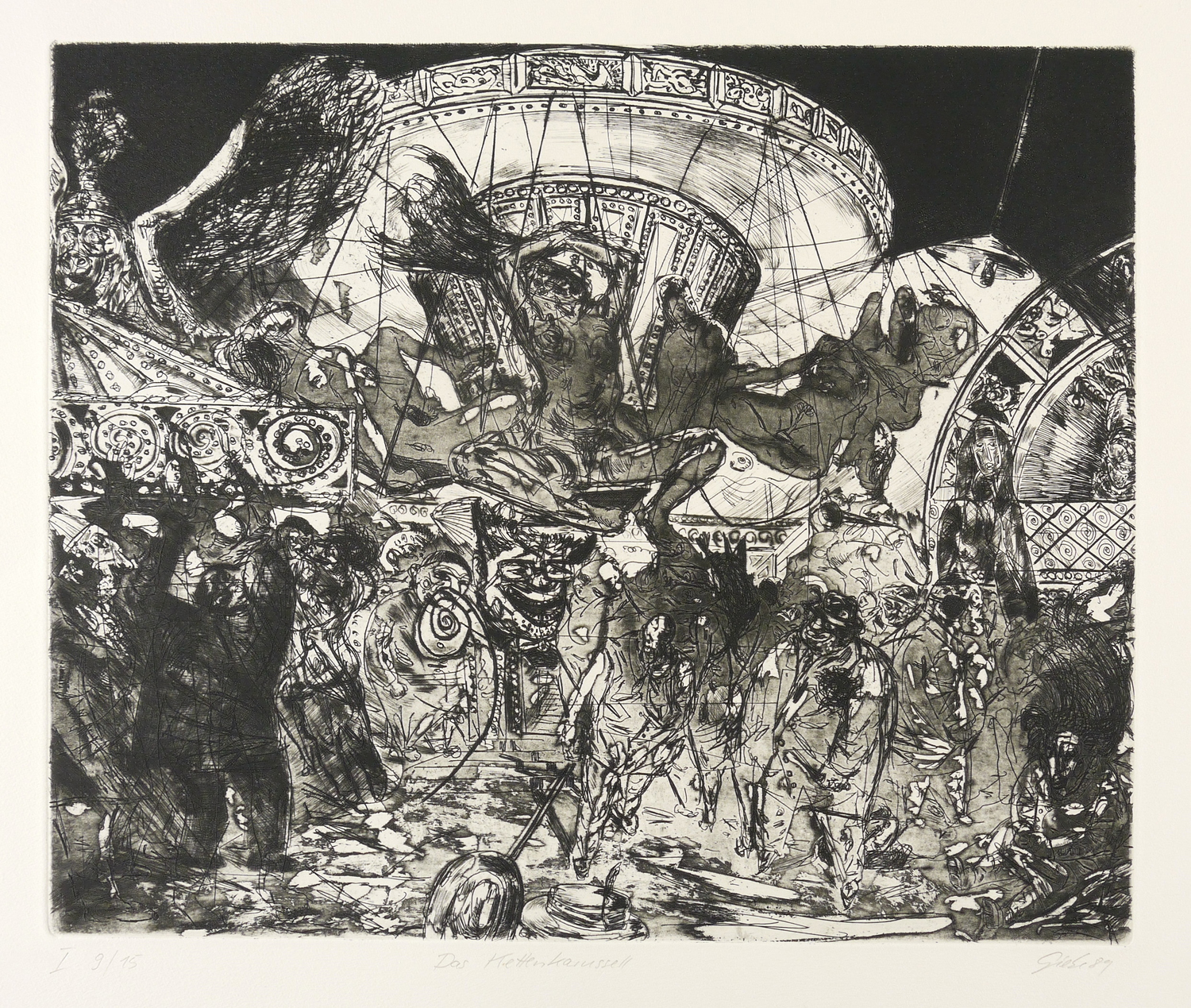 Rechts unten in Bleistift signiert und datiert: ″Giebe 89″. Links Auflagenbezeichnung: ″I 9/15″. Mittig Titel: ″Das Kettenkarussell″. Trockenstempel de Druckers Heinz Sparwart. Wasserzeichen der Hahnemühle. – In den Blattecken rückseitig Papier minimal ausgedünnt. Sonst ohne Mängel. Guter Zustand.