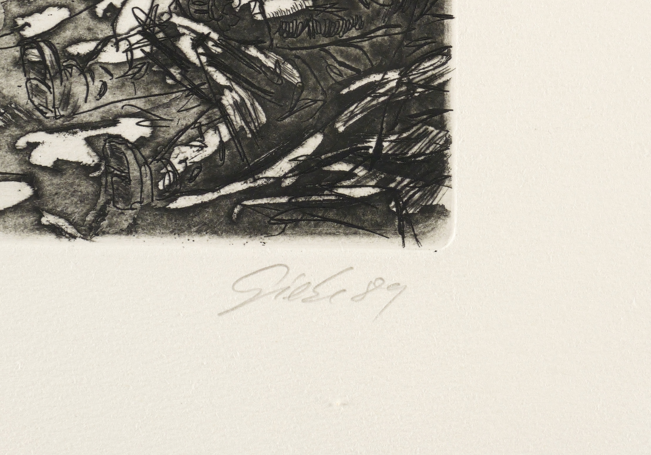 1989. Radierung / Strichätzung, Reservage, Aquatinta & Kaltnadel, in Schwarz, auf kräftigem hellchamois Hahnemühle. – Originale Künstlergrafik, von Hubertus Giebe. – Auflage Exemplar Nr. 9/15. – 41,0 x 49,7 cm (Darstellung / Platte), 54 x 64 cm (Blatt).