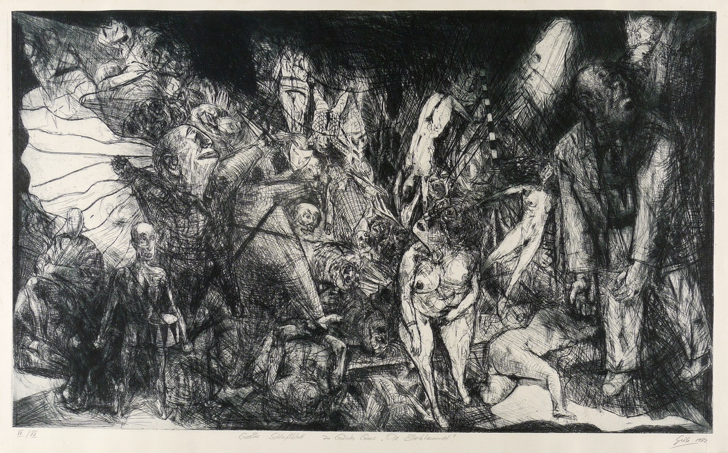 Rechts unten in Bleistift signiert und datiert: ″Giebe 82″. Links Auflagenbezeichnung: ″VII/XII″. Mittig Titel: ″'Großes Schlußblatt' zu Günter Grass 'Die Blechtrommel'″. Wasserzeichen der Hahnemühle. – Hauptwerk aus dem druckgrafischen Ouevre des Künstlers. – Leichte kaum merkliche Randmängel, minimal griffspurig. Guter Zustand.