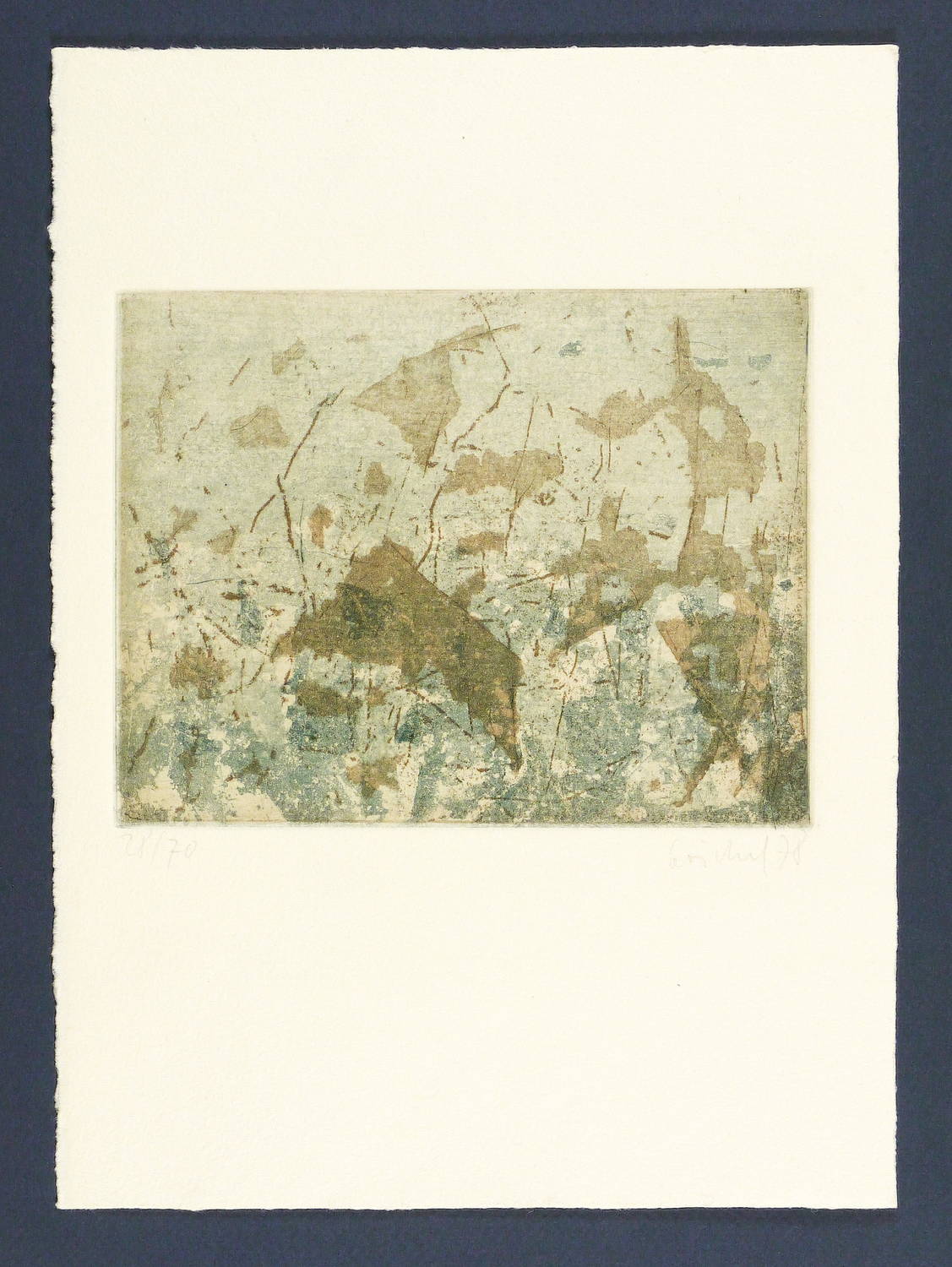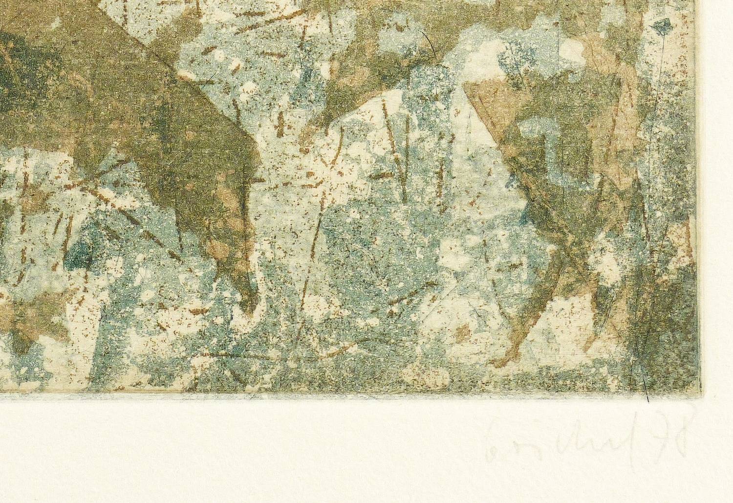 1978. Farbradierung / Farbaquatinta, in Blau & Ocker, auf Maschinenbütten. – Originale Künstlergrafik, von Eberhard Göschel. – Auflage Exemplar Nr. 28/70. – 12,5 x 16,1 cm (Darstellung / Platte), 27 x 20 cm (Blatt).