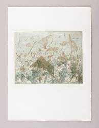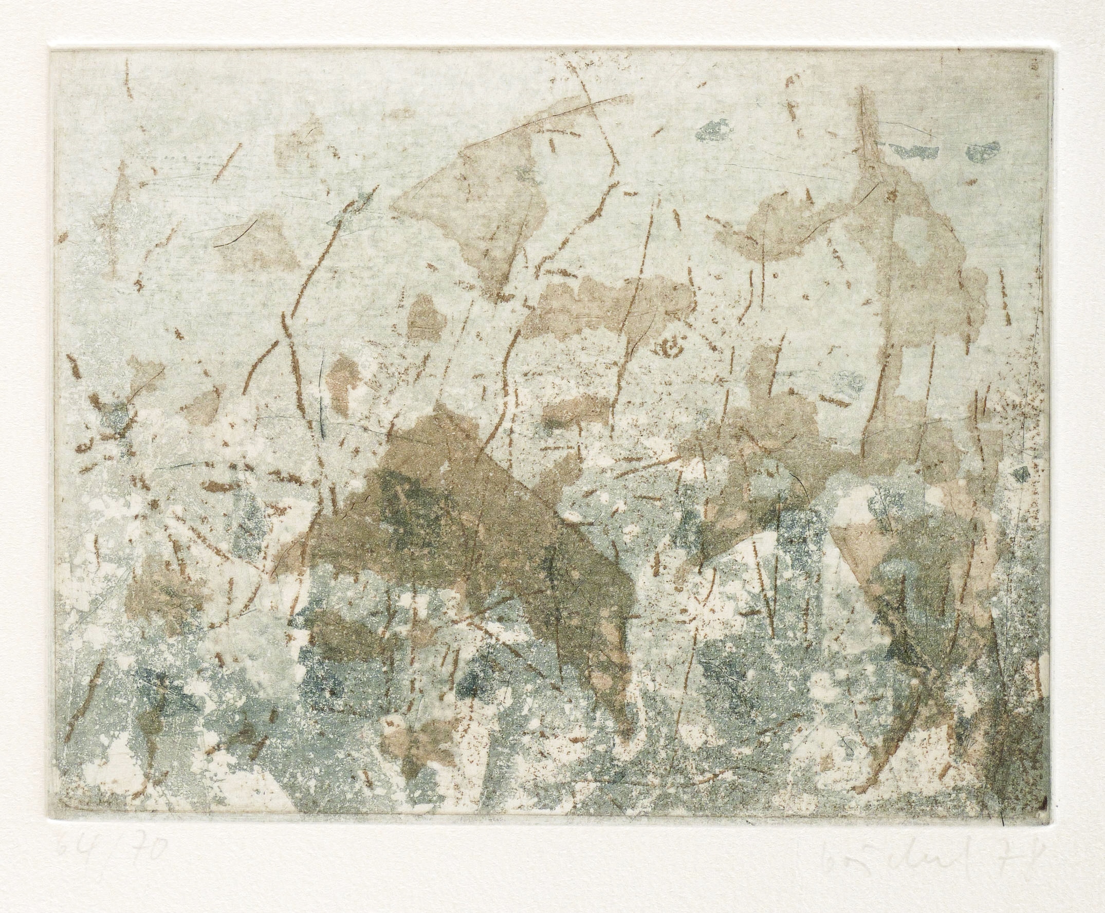 1978. Farbradierung / Farbaquatinta, in Blau, Hellgrau & Ocker, auf weichem chamois Velin. – Originale Künstlergrafik, von Eberhard Göschel. – Auflage Exemplar Nr. 64/70. – 12,5 x 16,1 cm (Darstellung / Platte), 27 x 20 cm (Blatt).