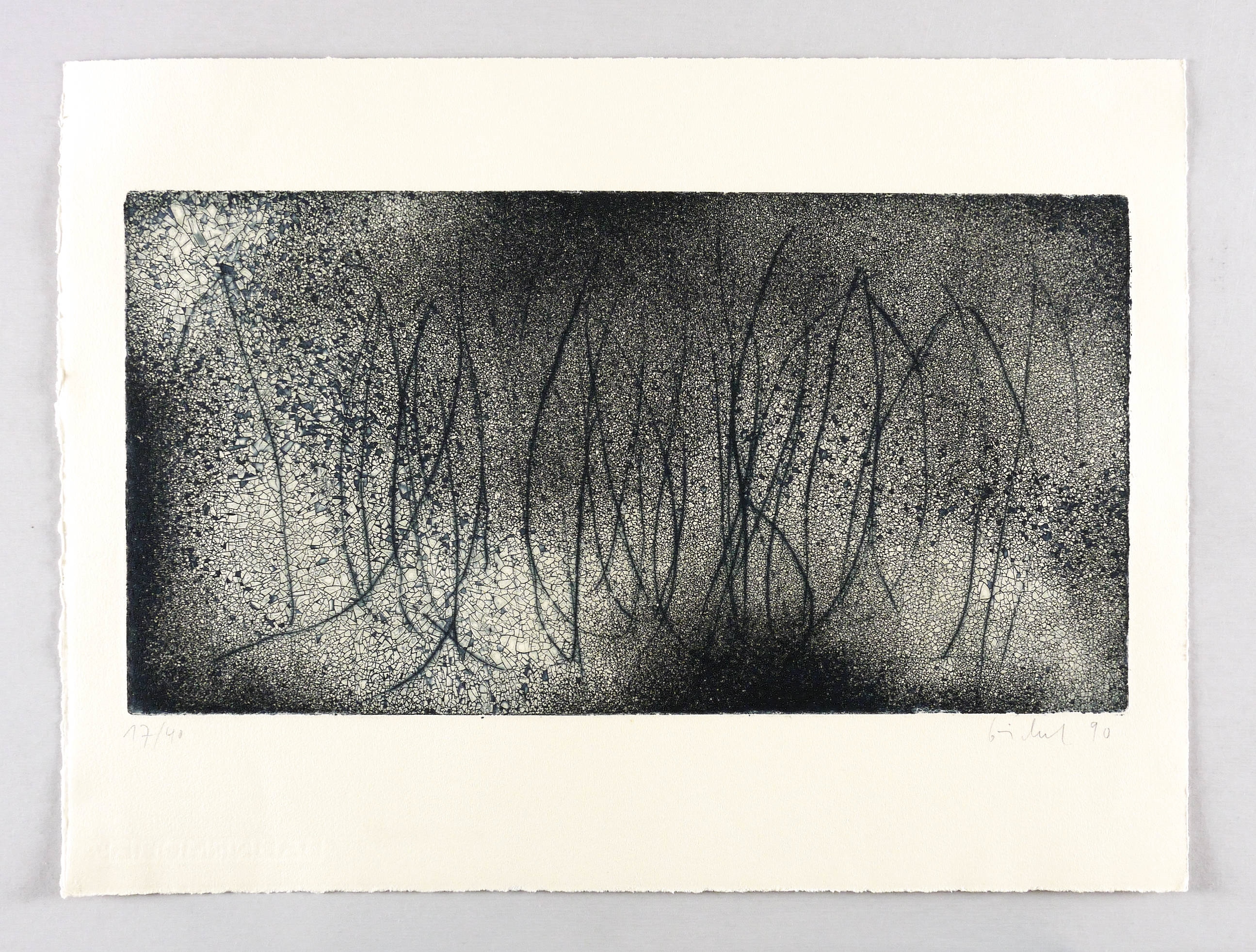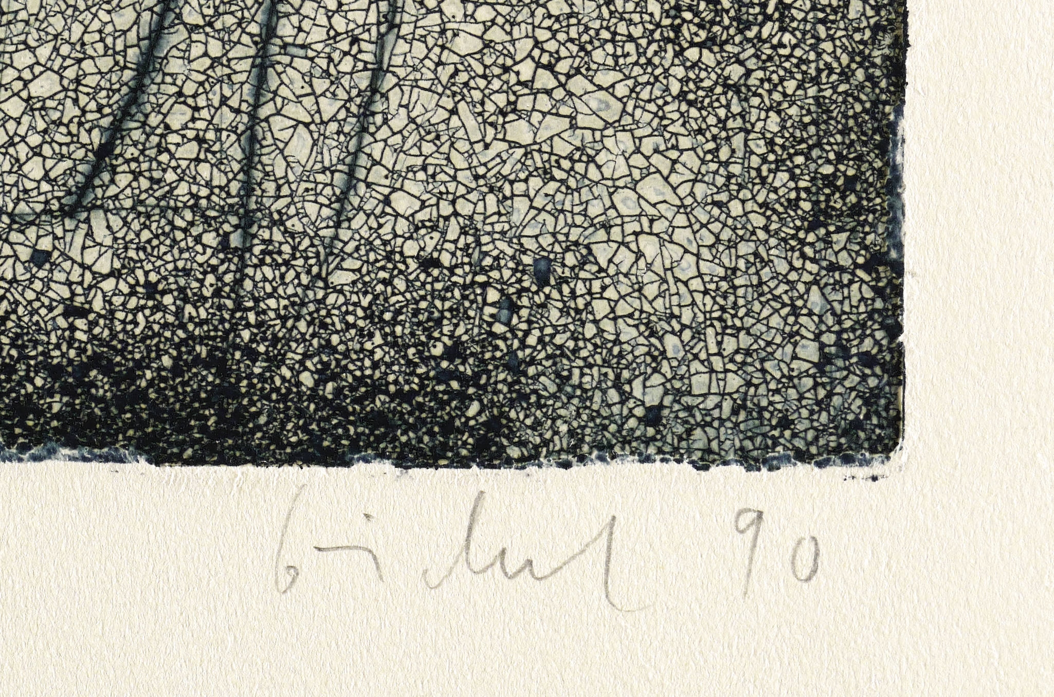 1990. Farbradierung / Farbaquatinta, in Blaugrün &Schwarz, auf chamois Hahnemühle. – Originale Künstlergrafik, von Eberhard Göschel. – Auflage Exemplar Nr. 17/40. – 24,7 x 47,6 cm (Darstellung / Platte), 40 x 54 cm (Blatt).
