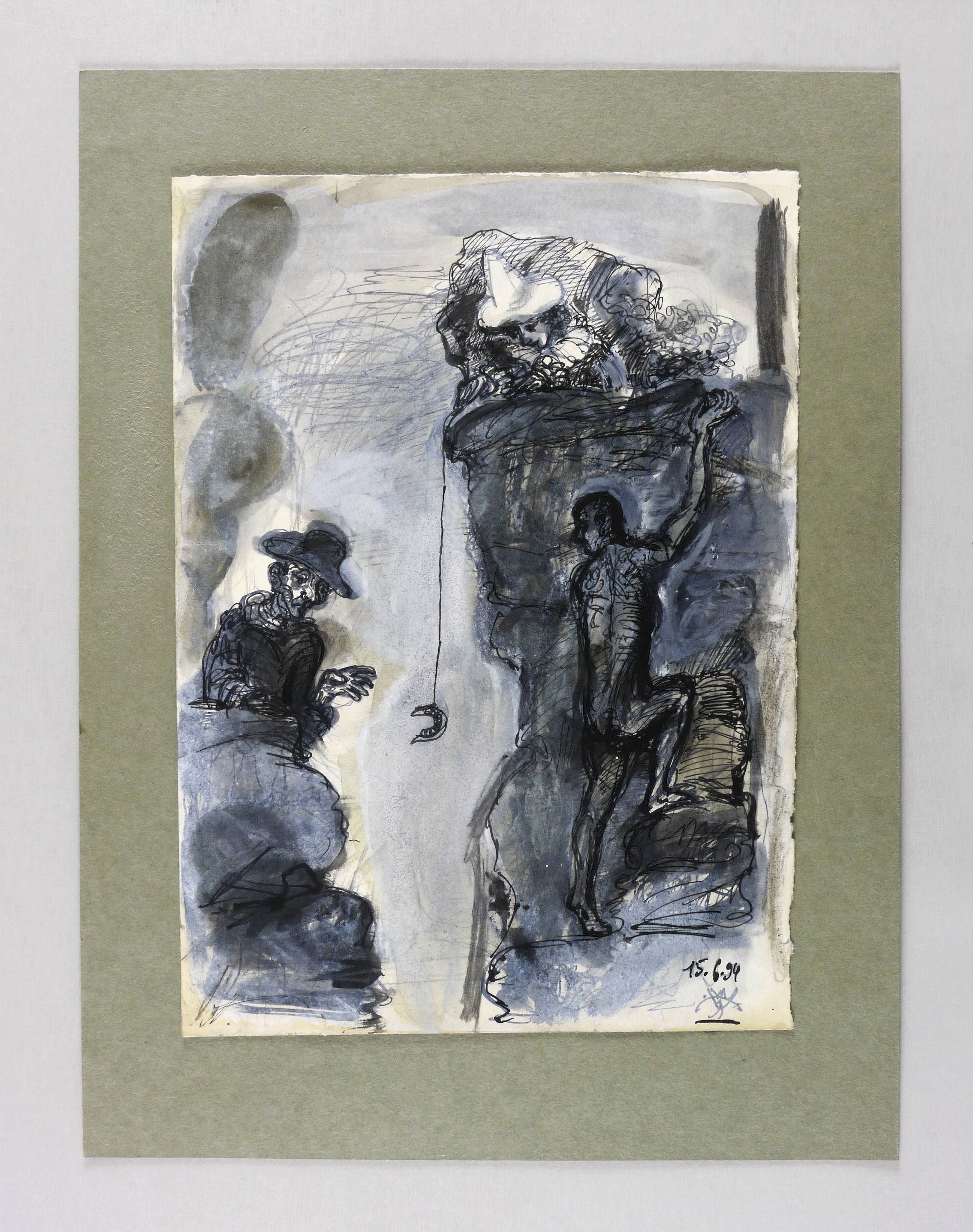 1994. Zeichnung / Federzeichnung, in schwarzer Tusche, über Graphit, in Blau & Grau laviert, auf Velin. – Originale Künstlergrafik, von Peter Graf. – Unikat. – 37,0 x 27,0 cm (Darstellung / Blatt), 47 x 36 cm (Trägerkarton).