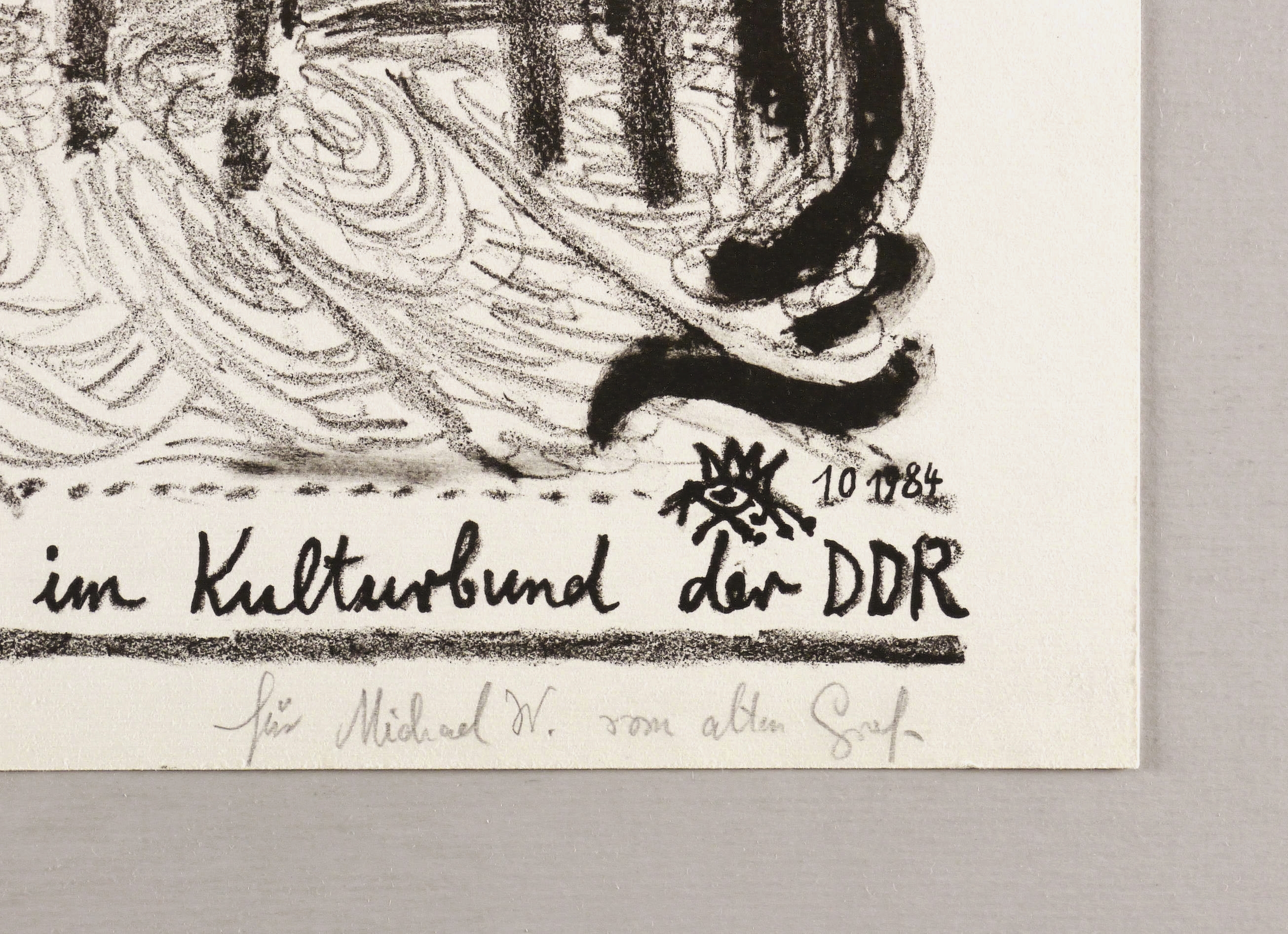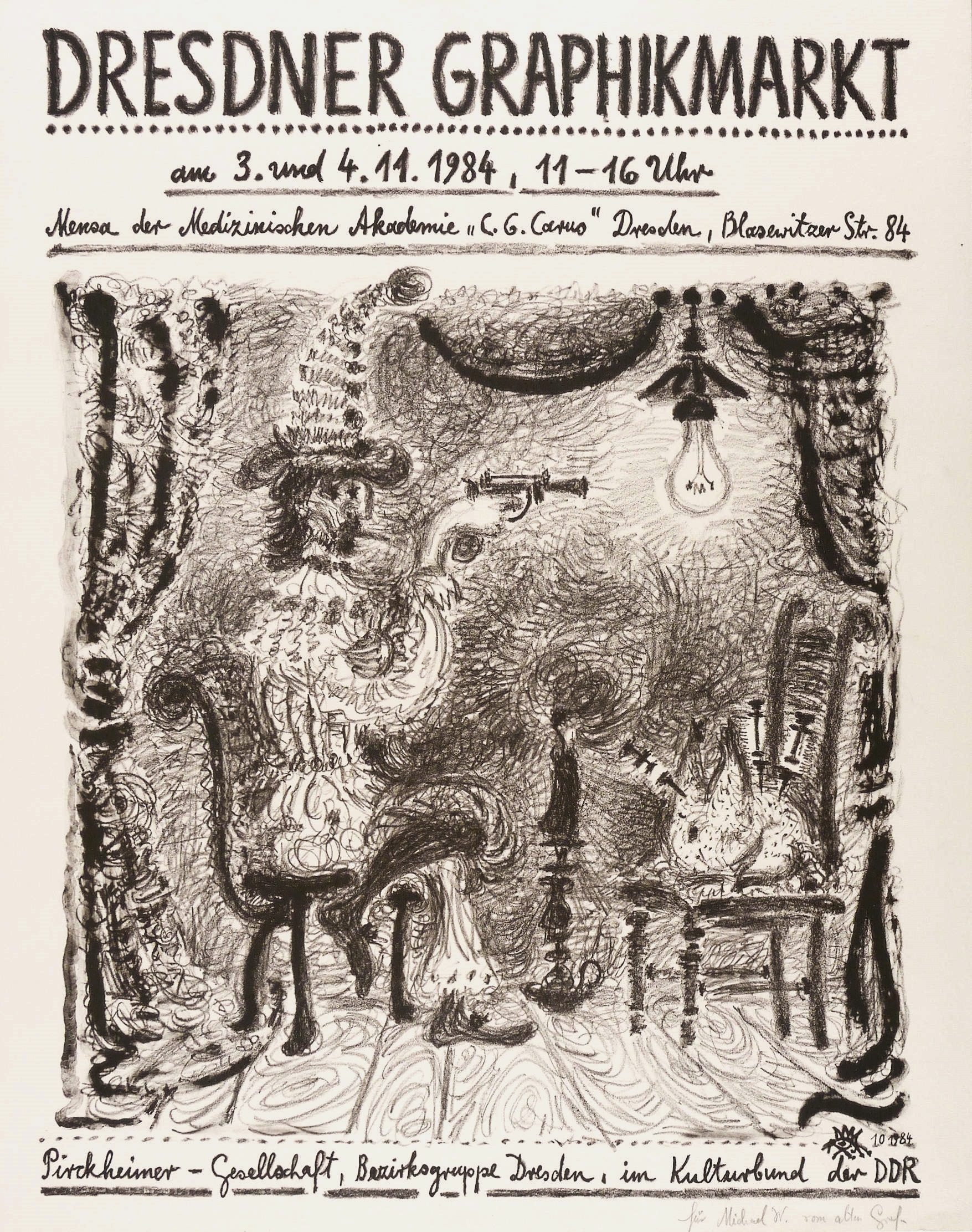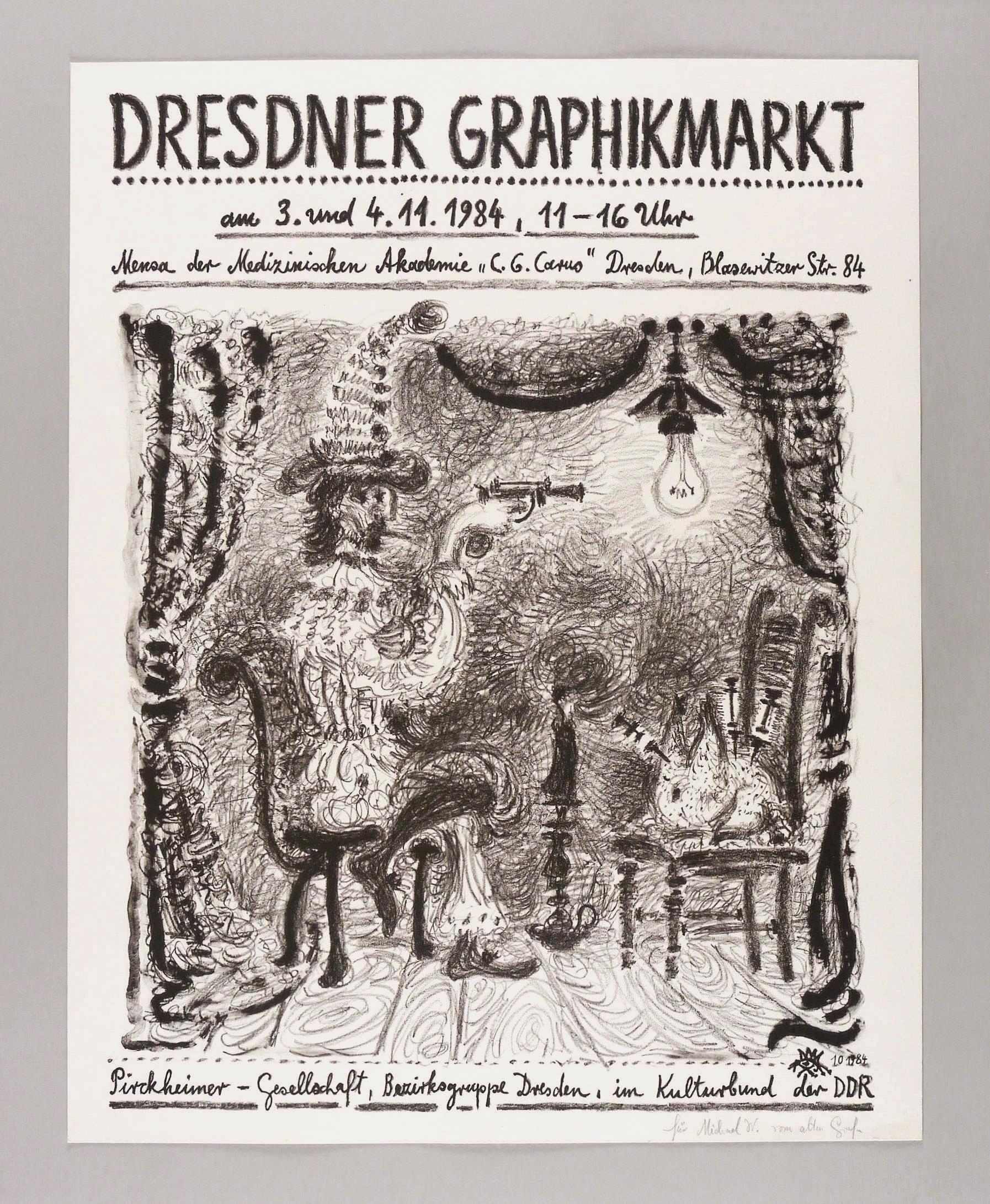 Rechts unten in Bleistift signiert und mit Widmung versehen: ″für Michael W. vom alten Graf″. – Originales Künstlerplakat zum ″Dresdner Graphikmarkt″ am 3./4.11.1984 in der Mensa der Medizinischen Akademie ″Carl Gustav Carus″ in Dresden, veranstaltet von der Pirckheimer-Gesellschaft Dresden. – Tadellos. Sehr guter Zustand.