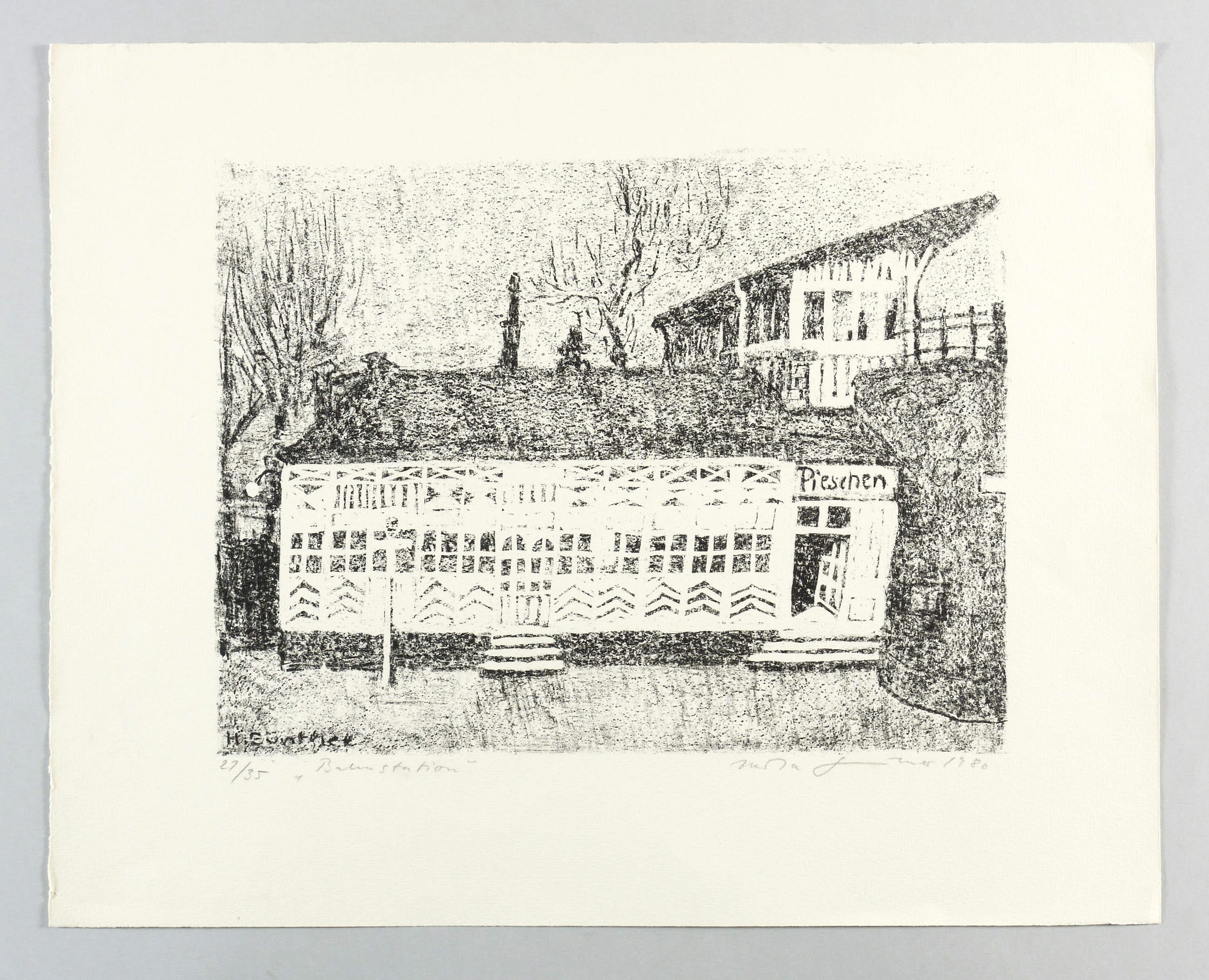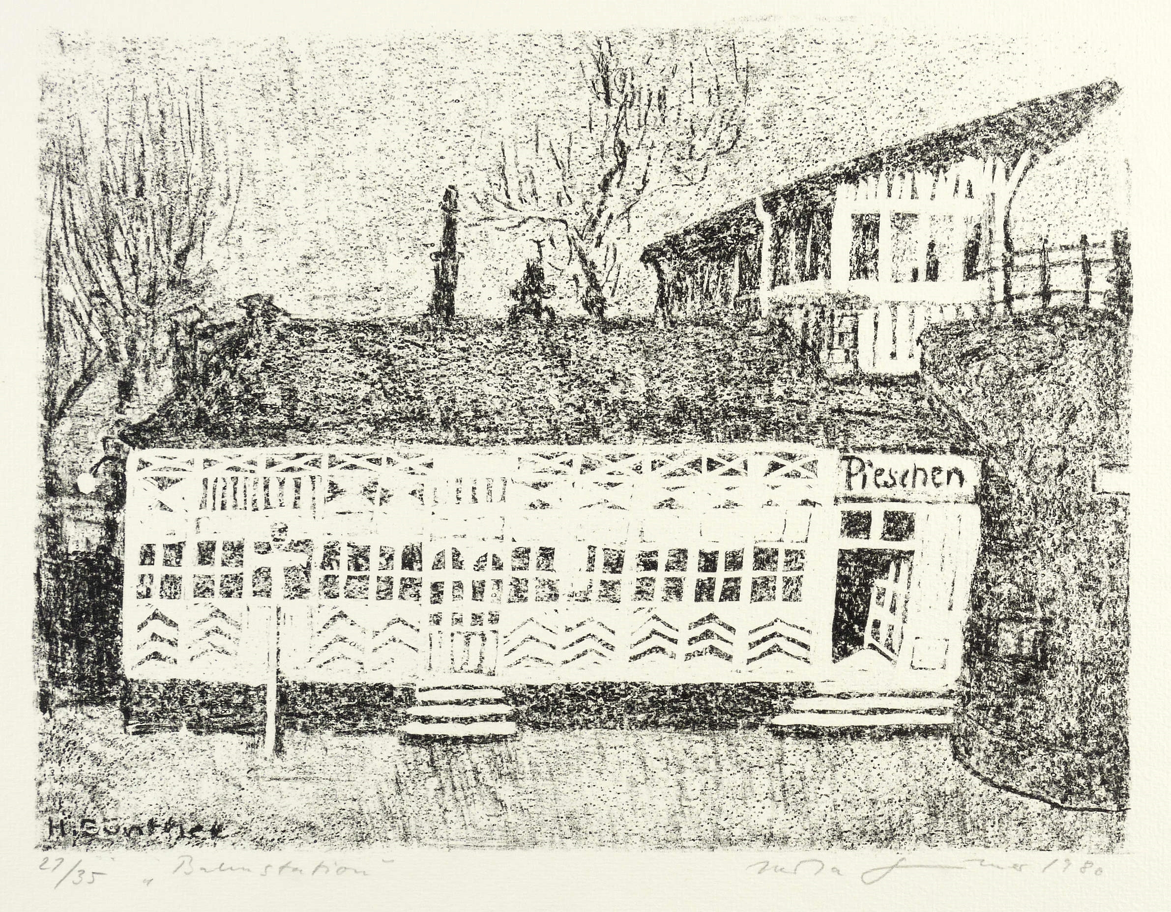 Schmidt 401. – Rechts unten in Bleistift signiert und datiert. Links Auflagenbezeichnung und Titel: ″Bahnstation″. – Kaum merkliche Lagerspuren. Ecken leicht bestoßen. Insgesamt gut erhalten.