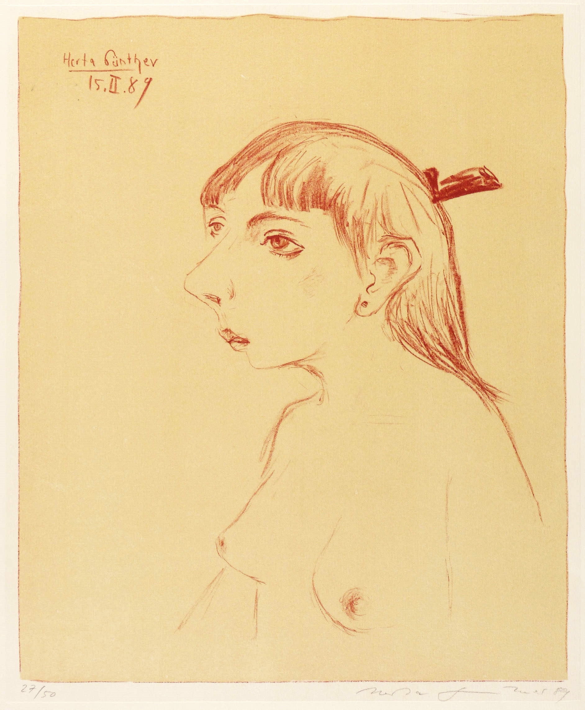 1989. Farblithografie / Kreidelithografie, in 2 Farben, auf hellchamois Maschinenbütten. – Originale Künstlergrafik, von Herta Günther. – Auflage Exemplar Nr. 27/50. – 48,8 x 40,1 cm (Darstellung / Druckbild), 67 x 55 cm (Blatt).