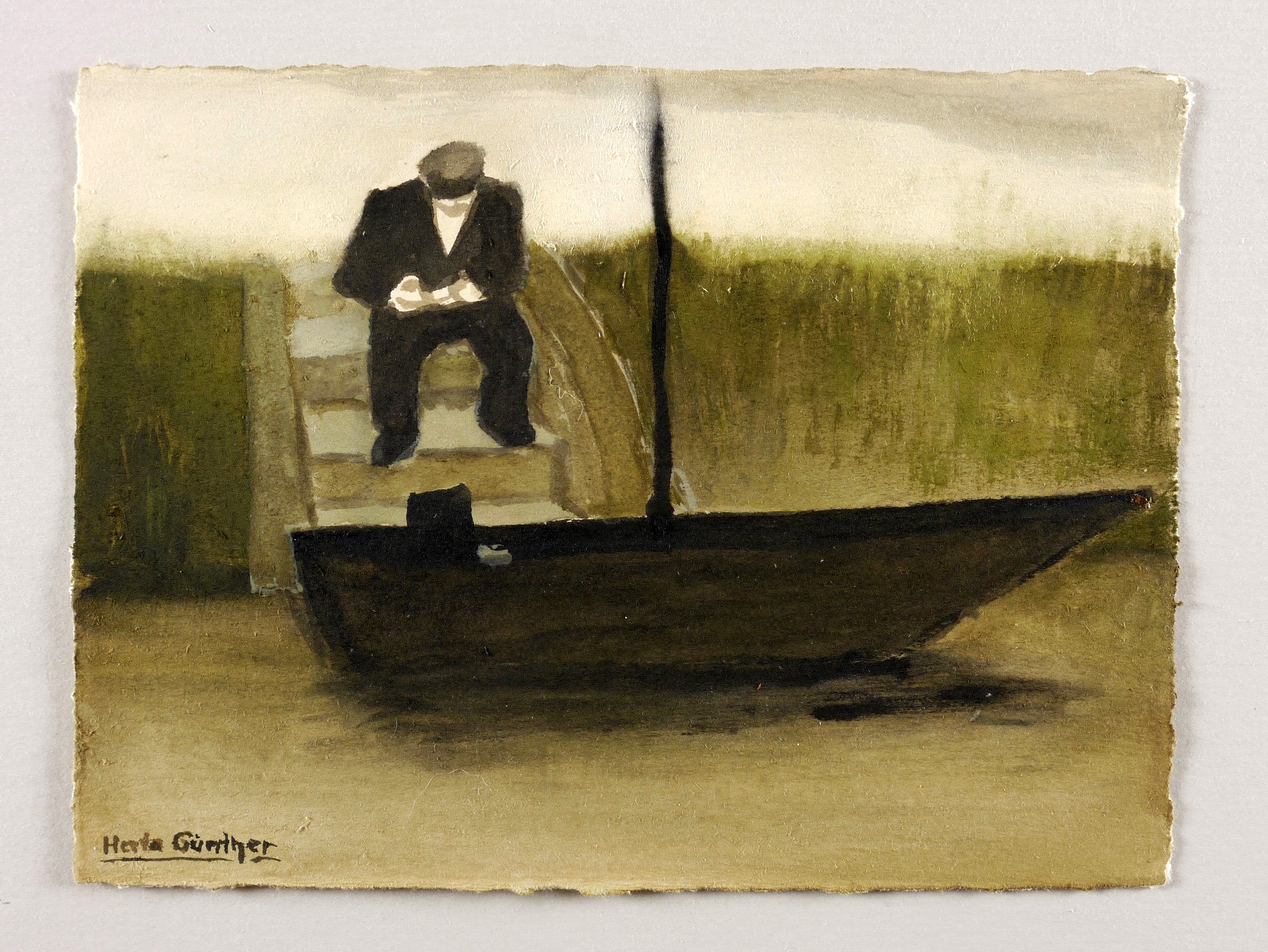 1981. Zeichnung / Aquarell, auf hellgelbem Büttenkarton. – Originale Künstlergrafik, von Herta Günther. – Unikat. – 14,2 x 19,1 cm (Darstellung / Blatt), 30 x 40 cm (Passepartout).