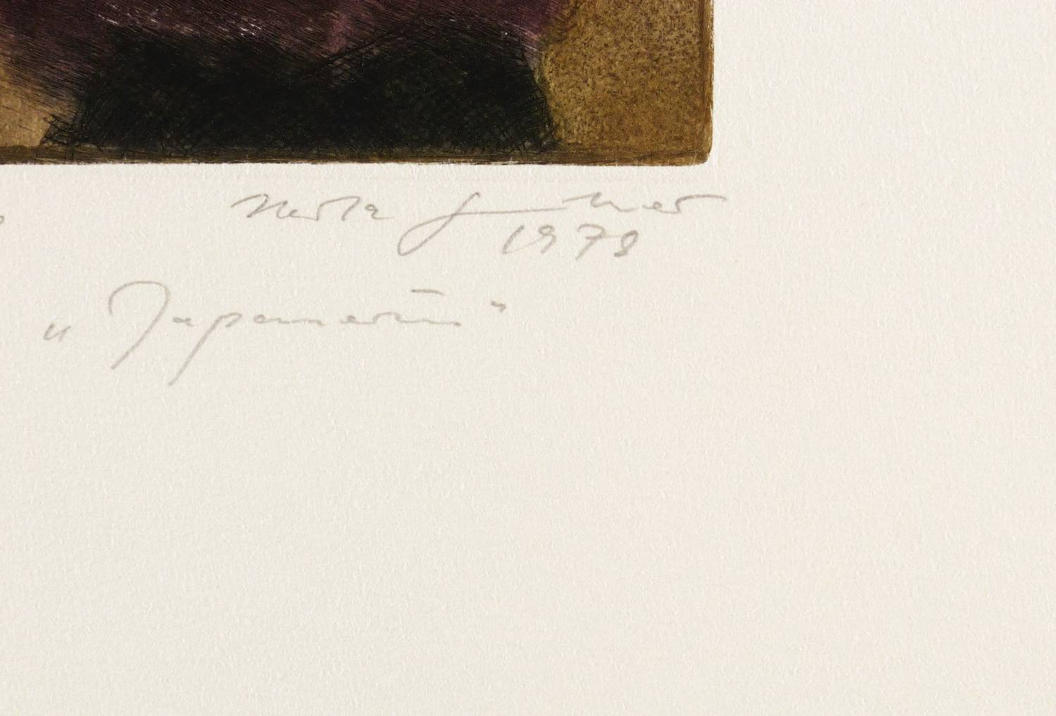 1978. Farbradierung / Aquatinta & Kaltnadel, in Ocker, Violett & Schwarz, auf schwerem hellem Hahnemühle. – Originale Künstlergrafik, von Herta Günther. – Auflage Exemplar Nr. 7/20. – 13,4 x 12,3 cm (Darstellung / Platte), 48 x 38 cm (Blatt).