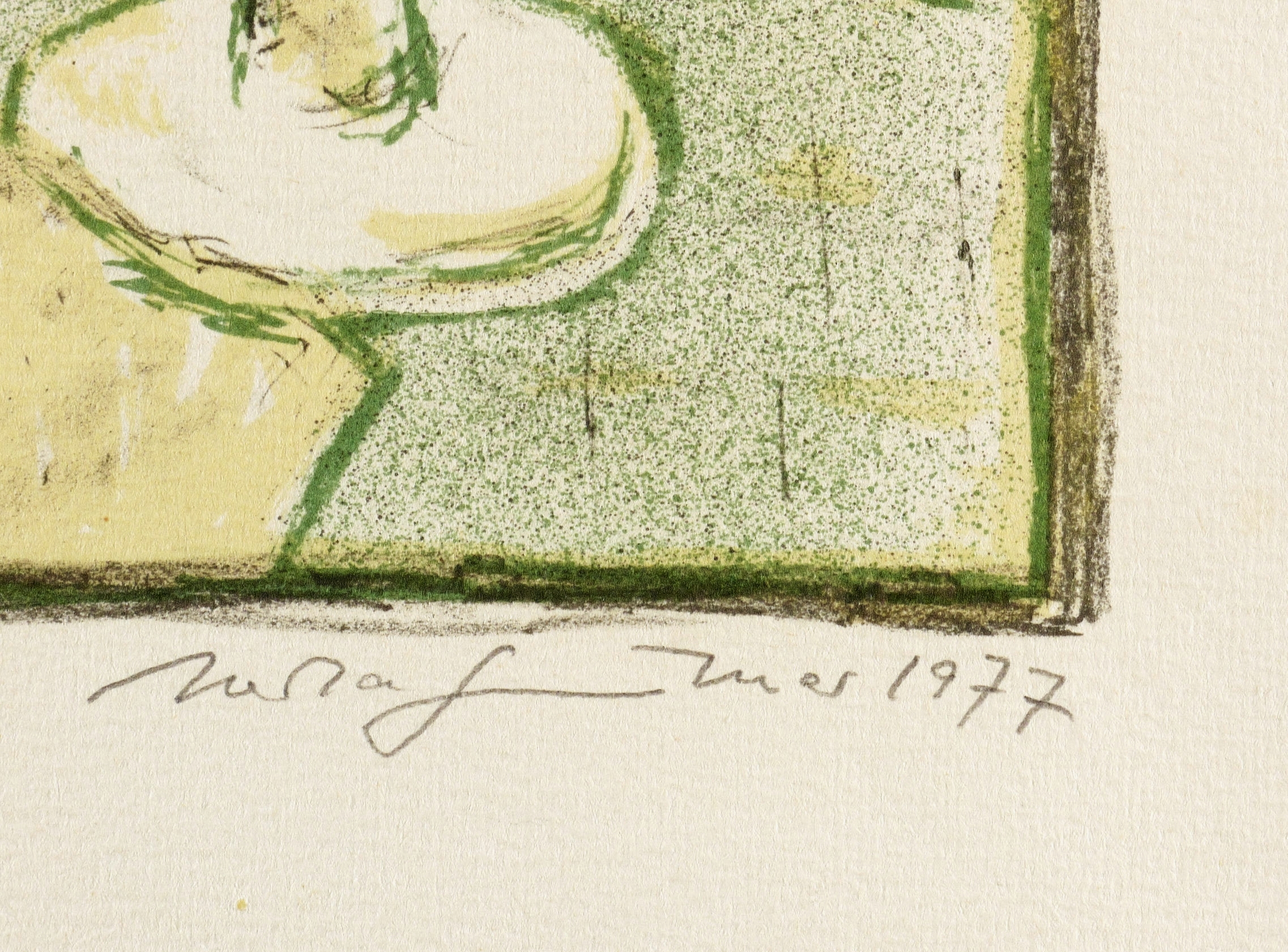 1977. Farblithografie / Kreide- & Pinsellithografie, in 3 Farben, auf gelbem Büttenkarton. – Originale Künstlergrafik, von Herta Günther. – Auflage 150 Exemplare. – 33,2 x 25,4 cm (Darstellung / Druckbild), 43 x 34 cm (Blatt).
