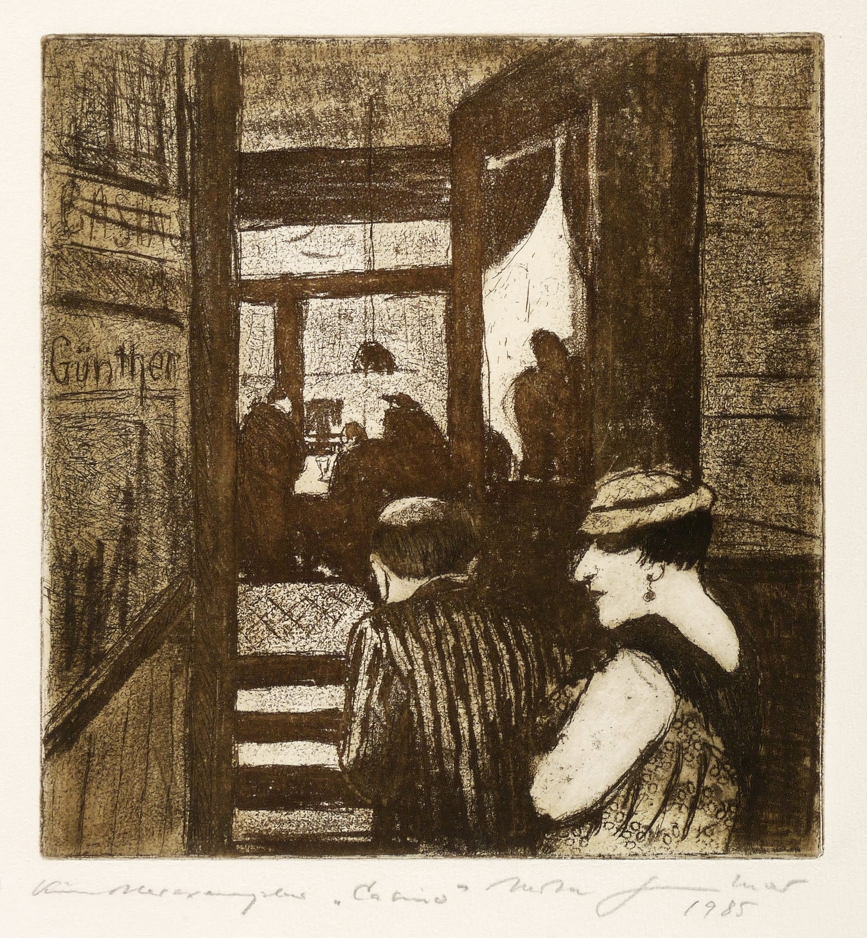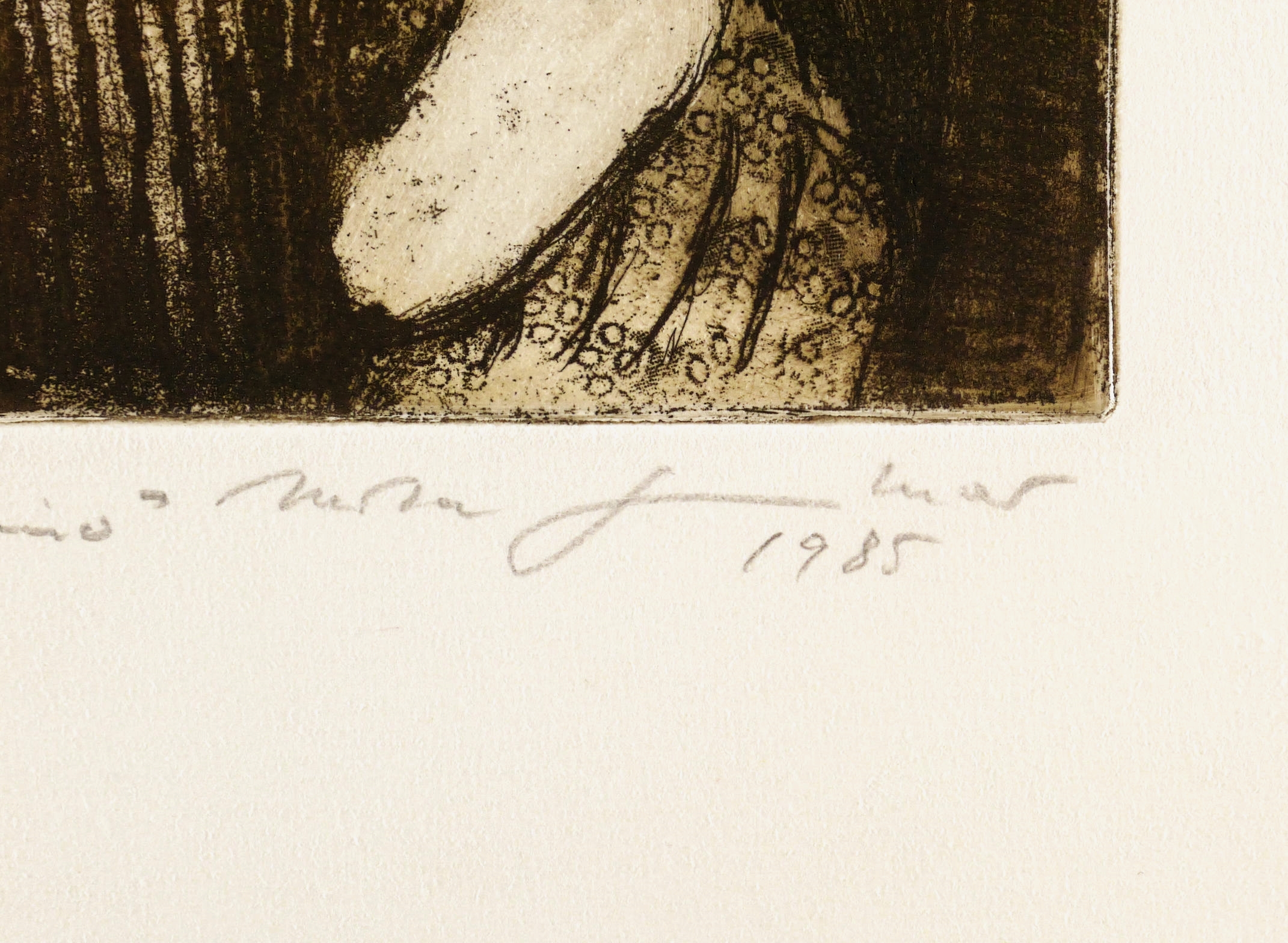 1985. Farbradierung / Vernis mou & Strichätzung, in Braun & Schwarz Farben, auf schwerem hellchamois Velin. – Originale Künstlergrafik, von Herta Günther. – Künstlerexemplar (e.a.). – 24,7 x 23,5 cm (Darstellung / Platte), 50 x 40 cm (Blatt).