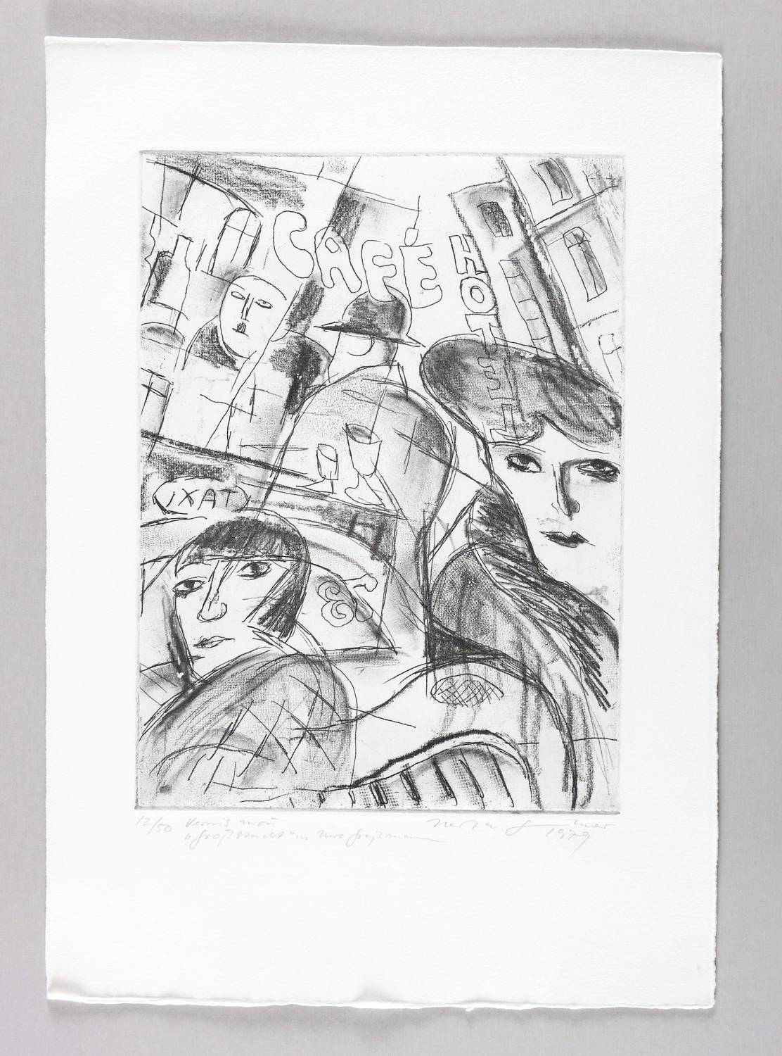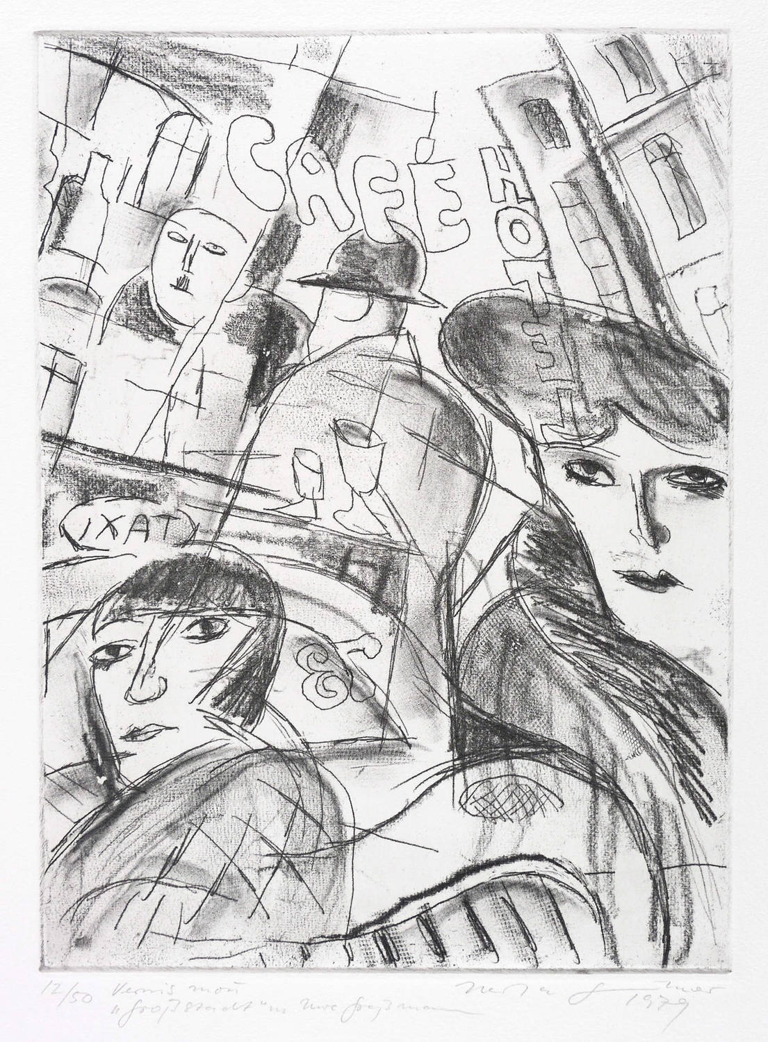 Schmidt 383. – Rechts unten in Bleistift signiert und datiert: ″Herta Günther 1979″. Links Auflagen- & Technikbezeichnung: ″12/50 Vernis mou″. Dazu Titel: ″Großstadt n. Uwe Greßmann″. – Frisch und tadellos erhalten. Sehr guter Zustand.
