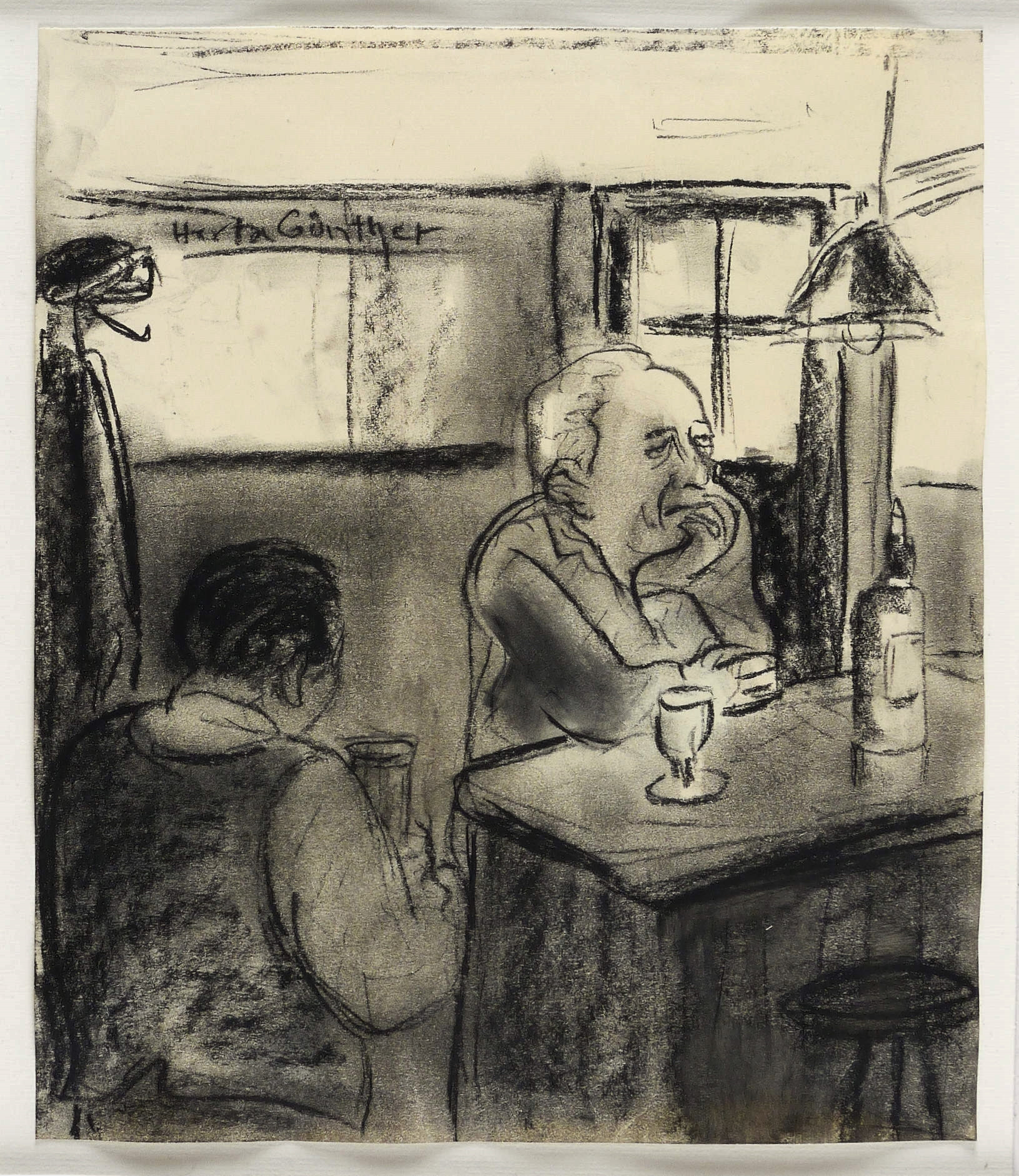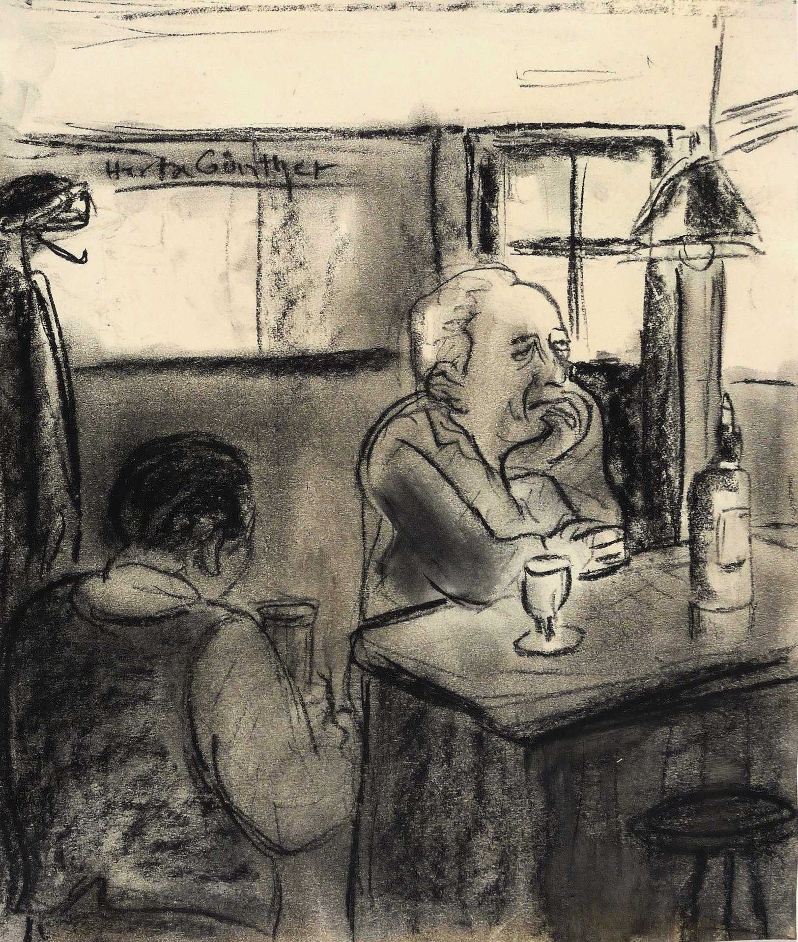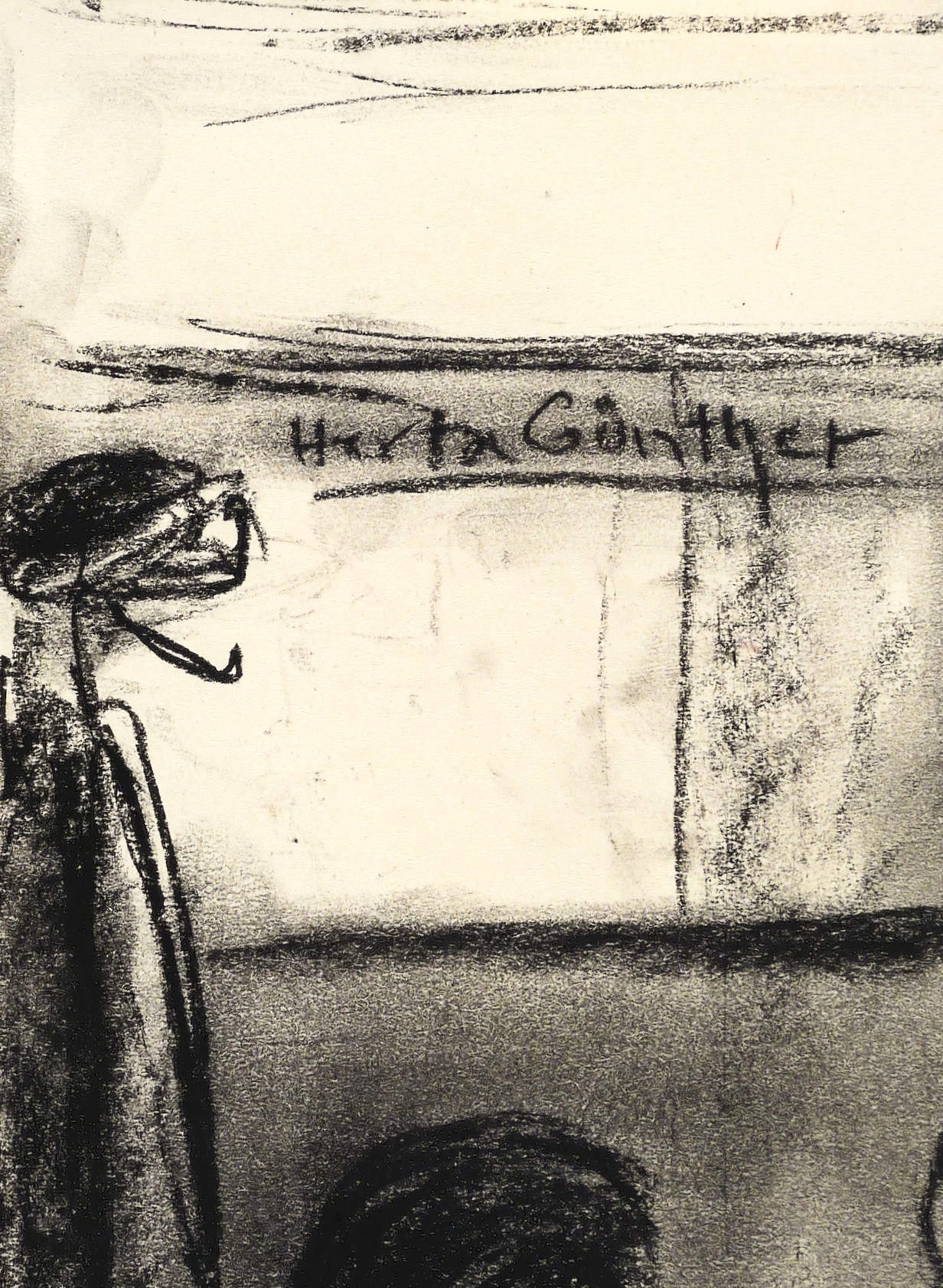 1995. Zeichnung / Kohlezeichnung, partiell gewischt, auf glattem hellgelbem Velin. – Originale Künstlergrafik, von Herta Günther. – Unikat. – 24,5 x 21,0 cm (Darstellung / Blatt), 50 x 40 cm (Passepartout).