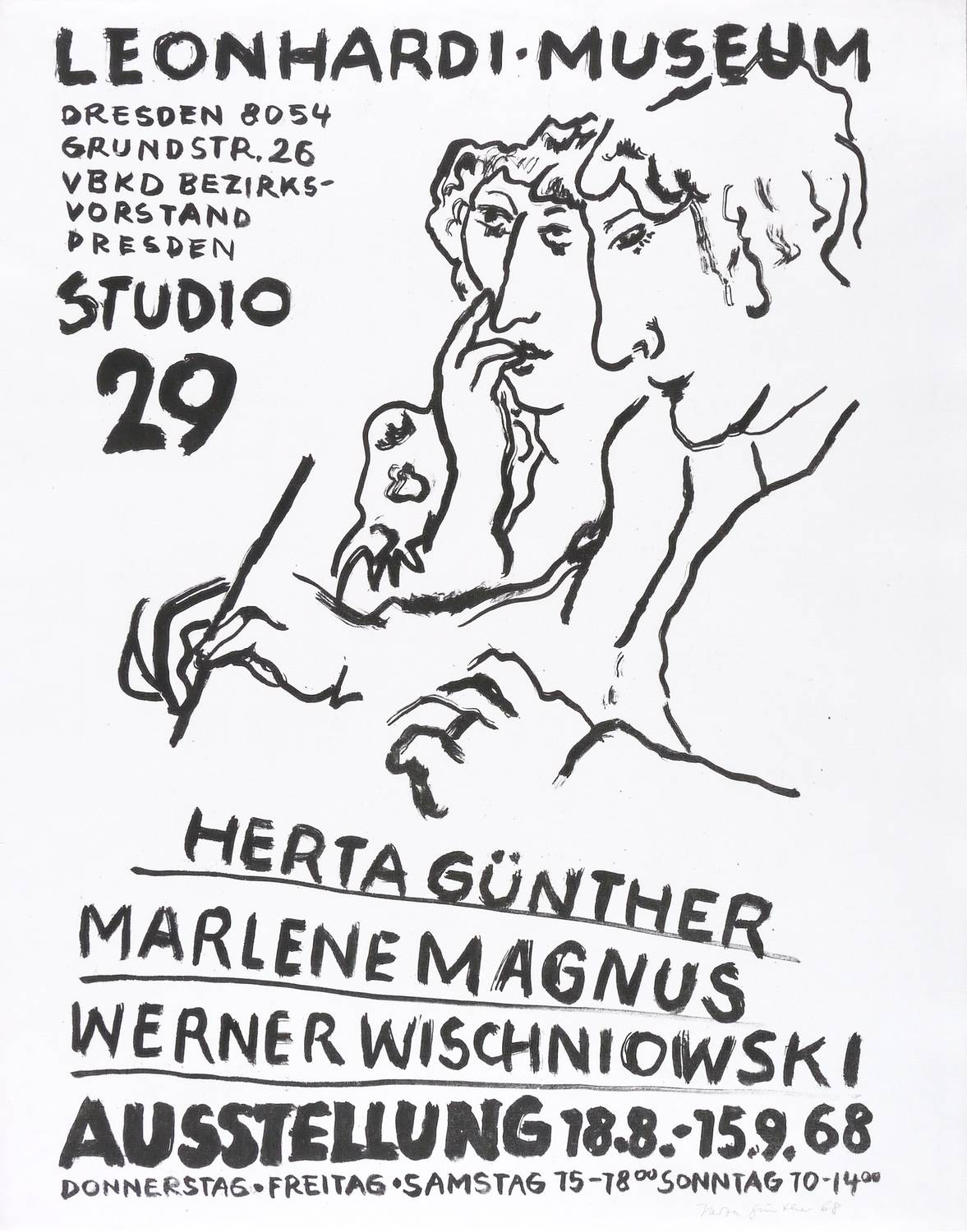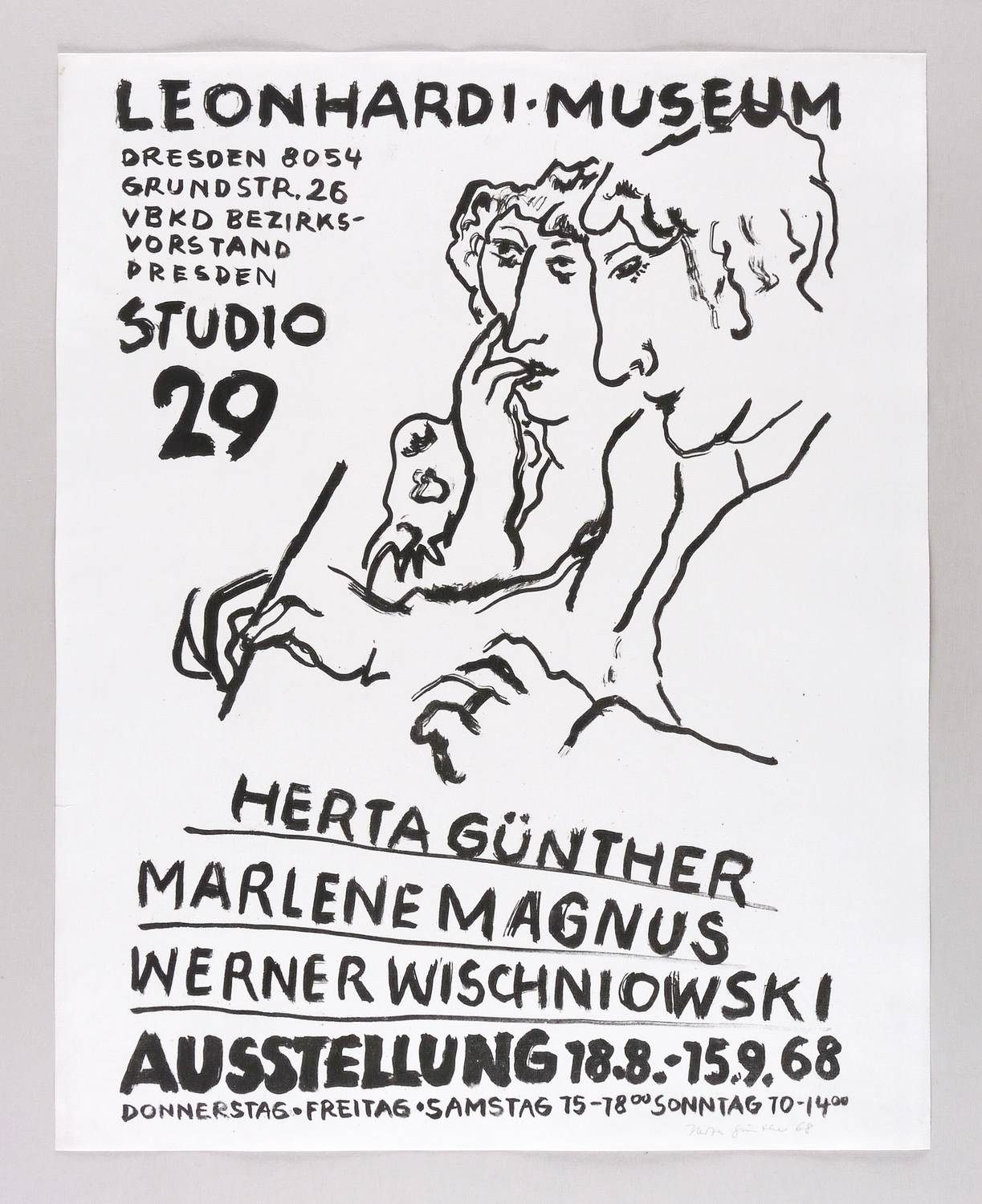 Links unten in Bleistift signiert und datiert: ″Herta Günther 1968″. In der Platte diverse Inschriften. – Entworfen als originalgrafisches Künstler-Plakat für die Ausstellung ″Herta Günther, Marlene Magnus & Werner Wischniowski″ im Leonhardi-Museum Dresden 18.8.-15.9.1968 (Reihe: Studio 29). – Nicht im WVZ Schmidt. – Winziger Randriss links unten hinterlegt. Insgesamt guter Zustand.